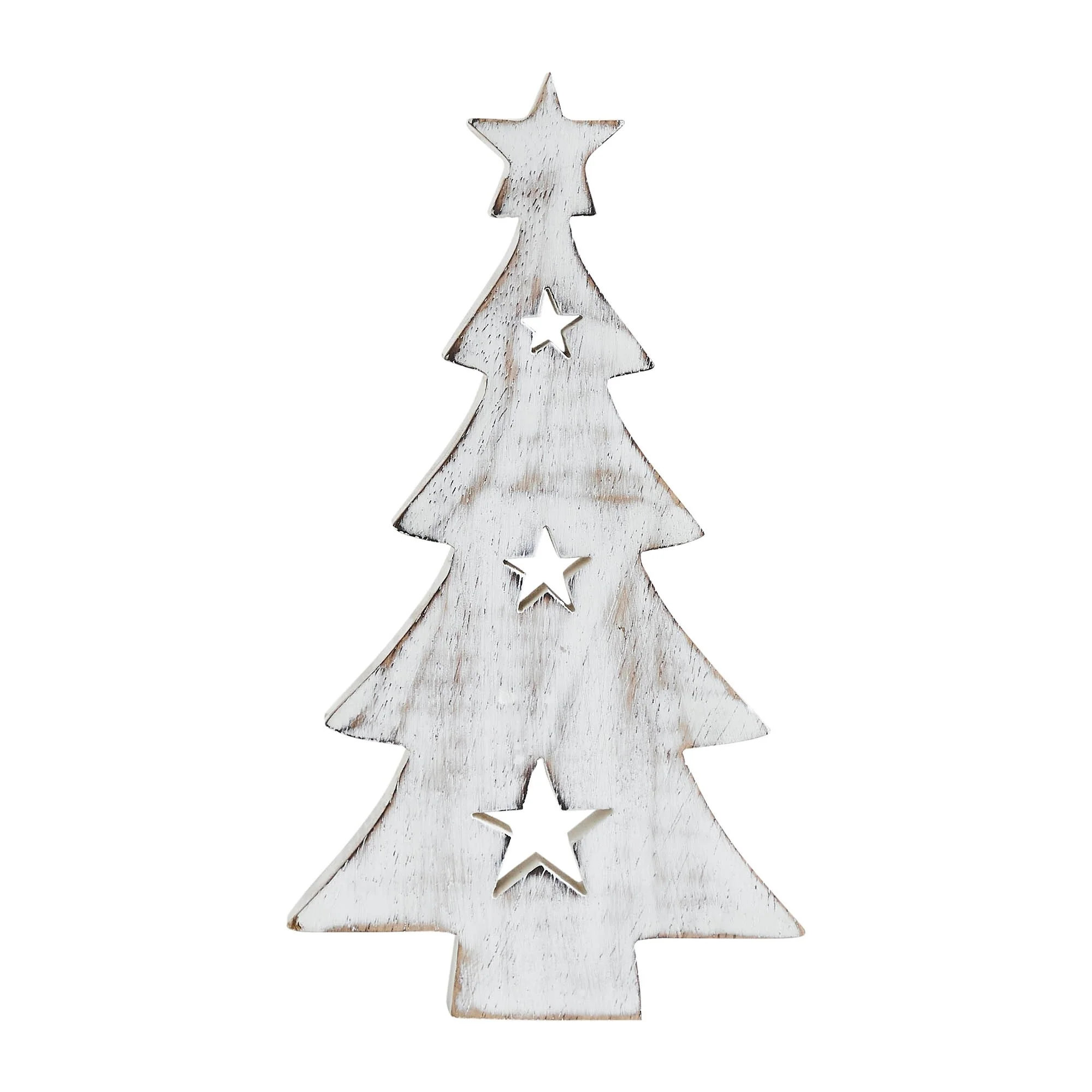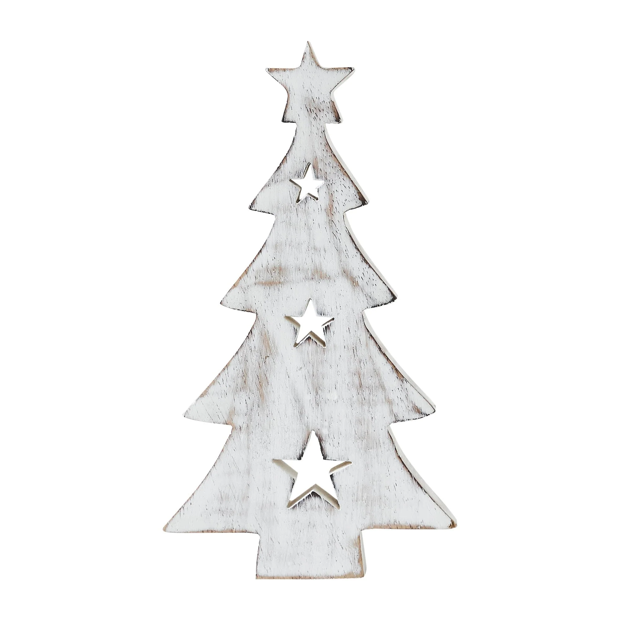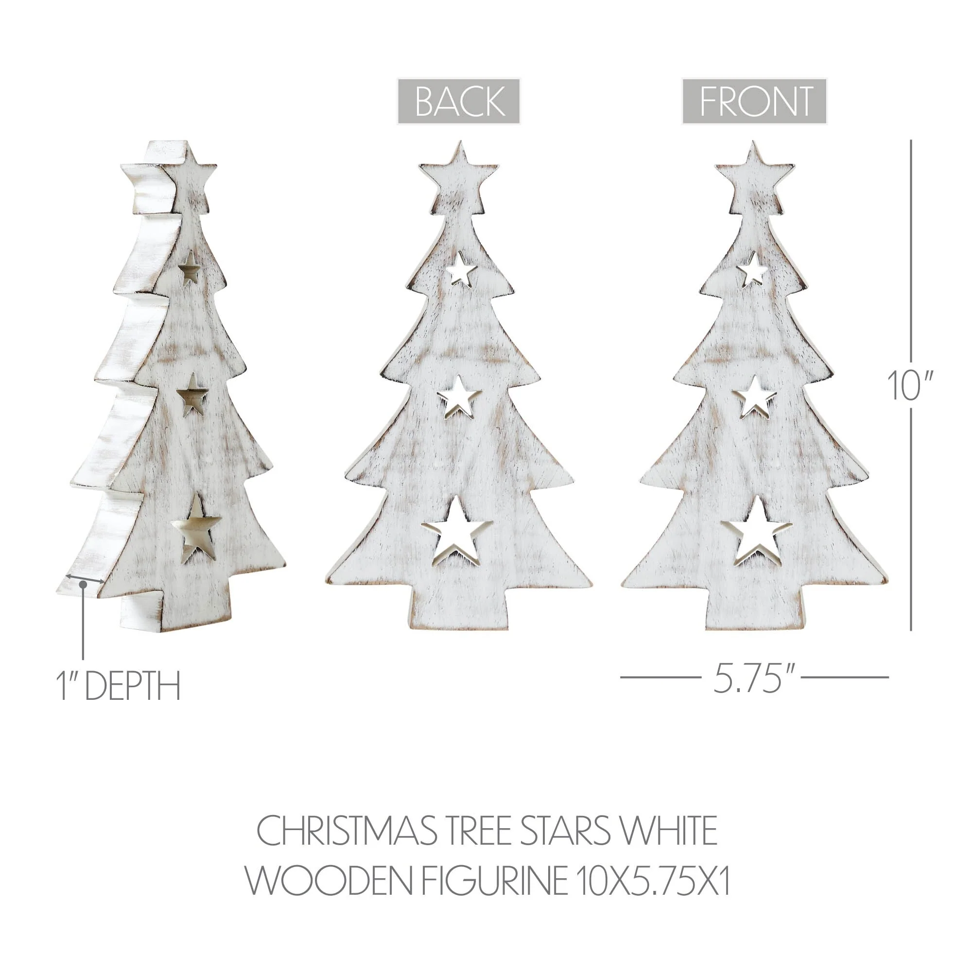 Enhance your winter and Christmas home decor with the charming VHC Brands Tropical Wood Christmas Tree with Stars White Wooden Figurine. Measuring 10x5.75x1 inches, this delightful figurine features a cutout Christmas tree adorned with stars, adding a touch of festive cheer to any tabletop or shelf. Crafted from tropical wood, it boasts a natural and soft creme color palette that effortlessly complements farmhouse and country-inspired interiors. With its farmhouse Christmas aesthetic and distressed appearance, this wooden figurine exudes a timeless appeal that captures the essence of the holiday season. Whether placed in the bathroom, bedroom, dining room, entryway, kitchen, or living room, it serves as a versatile piece of indoor decoration, spreading warmth and joy throughout your home during winter and Christmas. The novelty design of the Christmas tree with stars adds a whimsical touch to your holiday display, making it a standout accent piece. Maintaining the beauty of this wooden figurine is a breeze - simply wipe it clean with a soft cloth to remove dust and maintain its pristine condition. Whether displayed on its own or paired with other holiday decorations, the VHC Brands Tropical Wood Christmas Tree with Stars White Wooden Figurine is sure to become a cherished part of your seasonal decor, infusing your space with festive spirit and merry vibes.