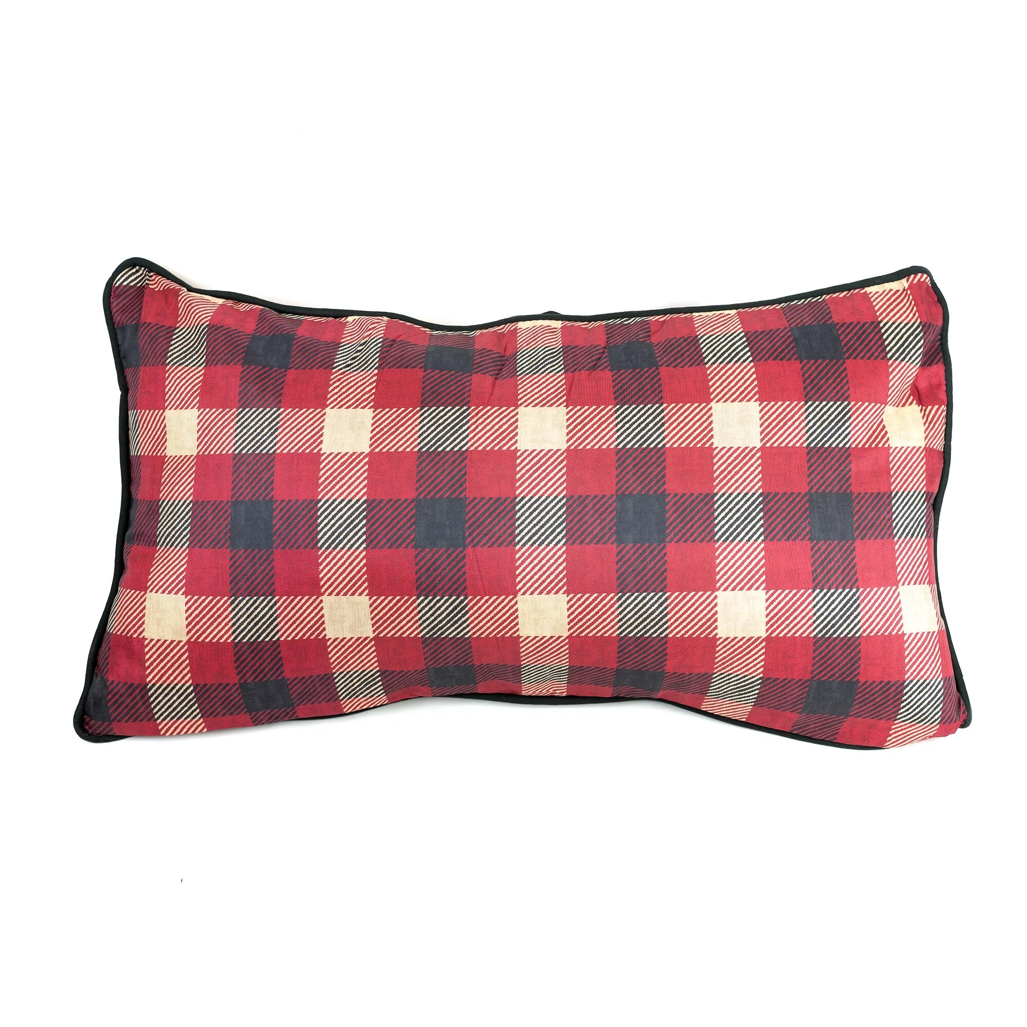 Introducing the Forest Point Decorative Pillow Set by Donna Sharp. This set features two decor pillows, the square pillow features a bear walking on a beige background with black piping on the edges. While the rectangle pillow is a lovely red plaid color with black piping on the edges as well. Each pillow is machine washable and includes a zipper closure for easy removal and or cleaning. Dimensions 18" x 18" and 12" x 22".