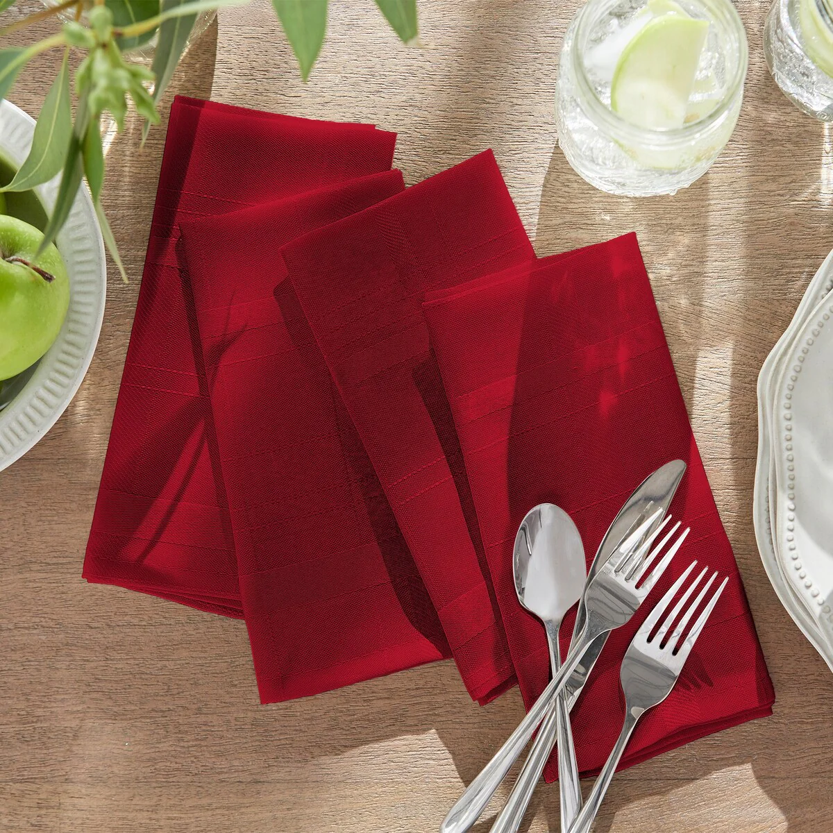 The Elegance Plaid Jacquard napkin set is the perfect solution to your decorating and table linen needs. Delicately woven jacquard plaid design gives it the versatility of a solid, with a touch of fashion. Excellent for special occasions, events, parties, family gatherings and everyday use these napkins have the soft hand of an ordinary napkins, with the added function you need. Fabric features water and stain repellant finish. Silky fabric can be ironed to release stubborn creases and make your napkins wrinkle free. Hemmed edge adds a finished look and prevents wear and tear. Napkins measure 17x17 and are sold as a set of 4. 100% Polyester. Easy care, machine washable.