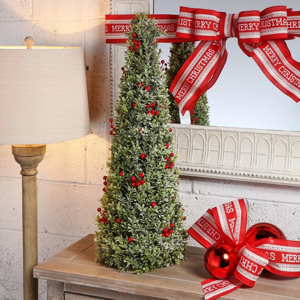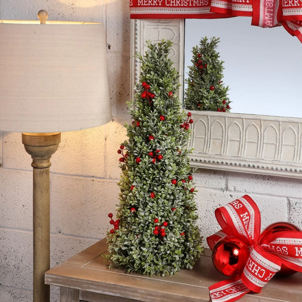 Bring a touch of nature to your home with this realistic and charming Frosted Boxwood Cone Tree adorned with lovely red berries. Perfect for adding a subtle holiday ambiance to your entryway or porch, this tree creates an attractive symmetrical look when displayed in pairs.