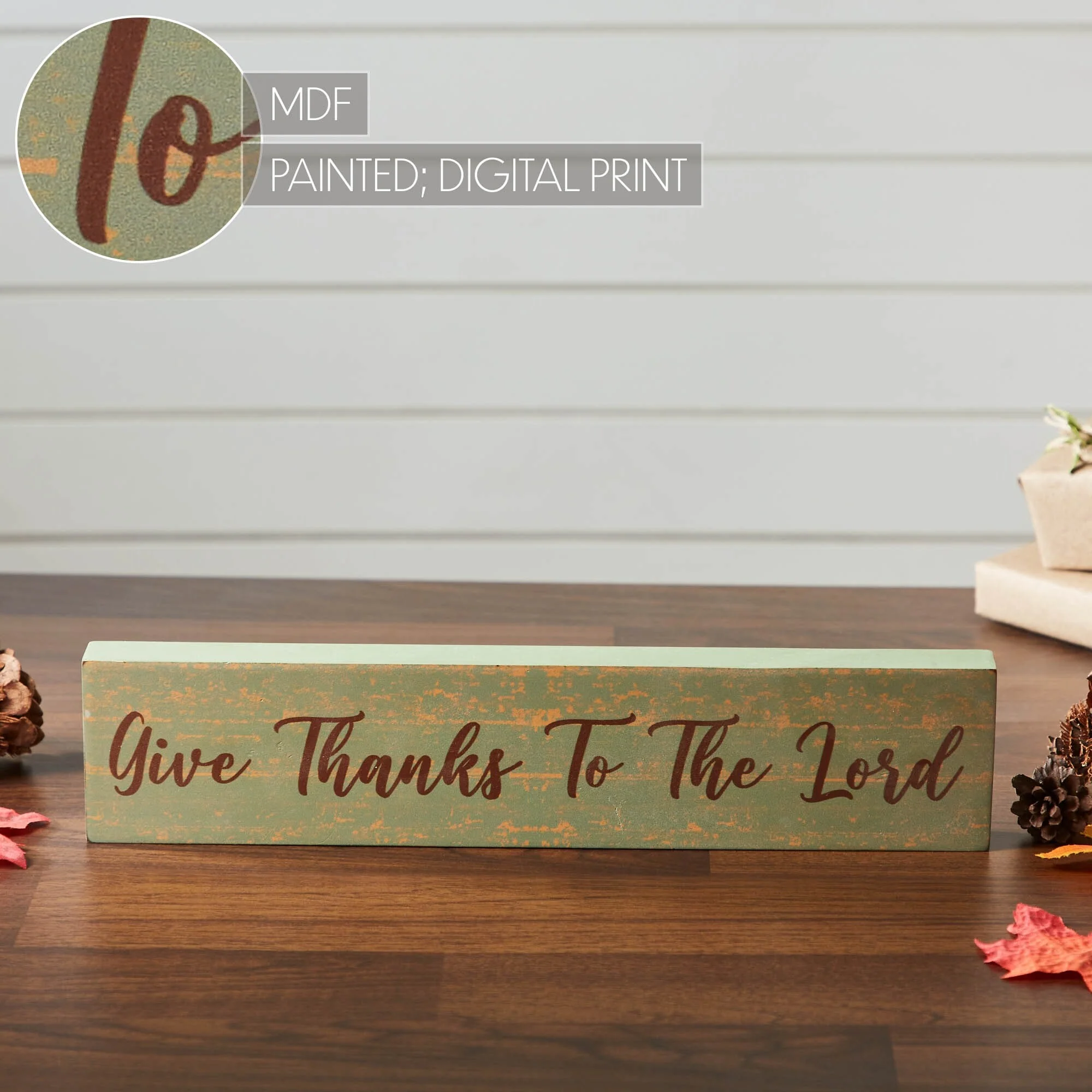 Add a touch of faith-inspired elegance to your Thanksgiving tabletop decor with the VHC Brands Give Thanks To The Lord MDF Sign. Measuring 3x14 inches, this rectangular tabletop decoration features the inspiring message Give Thanks To The Lord rendered in a classic font. Crafted from durable MDF material, the sign boasts a distressed appearance that adds rustic charm to any space while serving as a reminder of gratitude and thankfulness. With its calming color palette of sage green and toffee brown, this tabletop sign captures the essence of Thanksgiving as a time for reflection and appreciation. The country-inspired design and digital print create a warm and inviting backdrop for your holiday table decor, making it a versatile accent piece for your bedroom, dining room, entryway, kitchen, or living room. Whether displayed alone or combined with other fall decorations, this sign brings a touch of spiritual warmth to your home during the holiday season. Celebrate the season of Thanksgiving with the VHC Brands Give Thanks To The Lord MDF Sign. Its timeless message and rustic design make it a meaningful addition to your holiday decor, reminding you and your loved ones to pause and give thanks for the blessings in your lives. Place it on your tabletop or shelf as a gentle reminder of the importance of gratitude and faith during this special time of year.