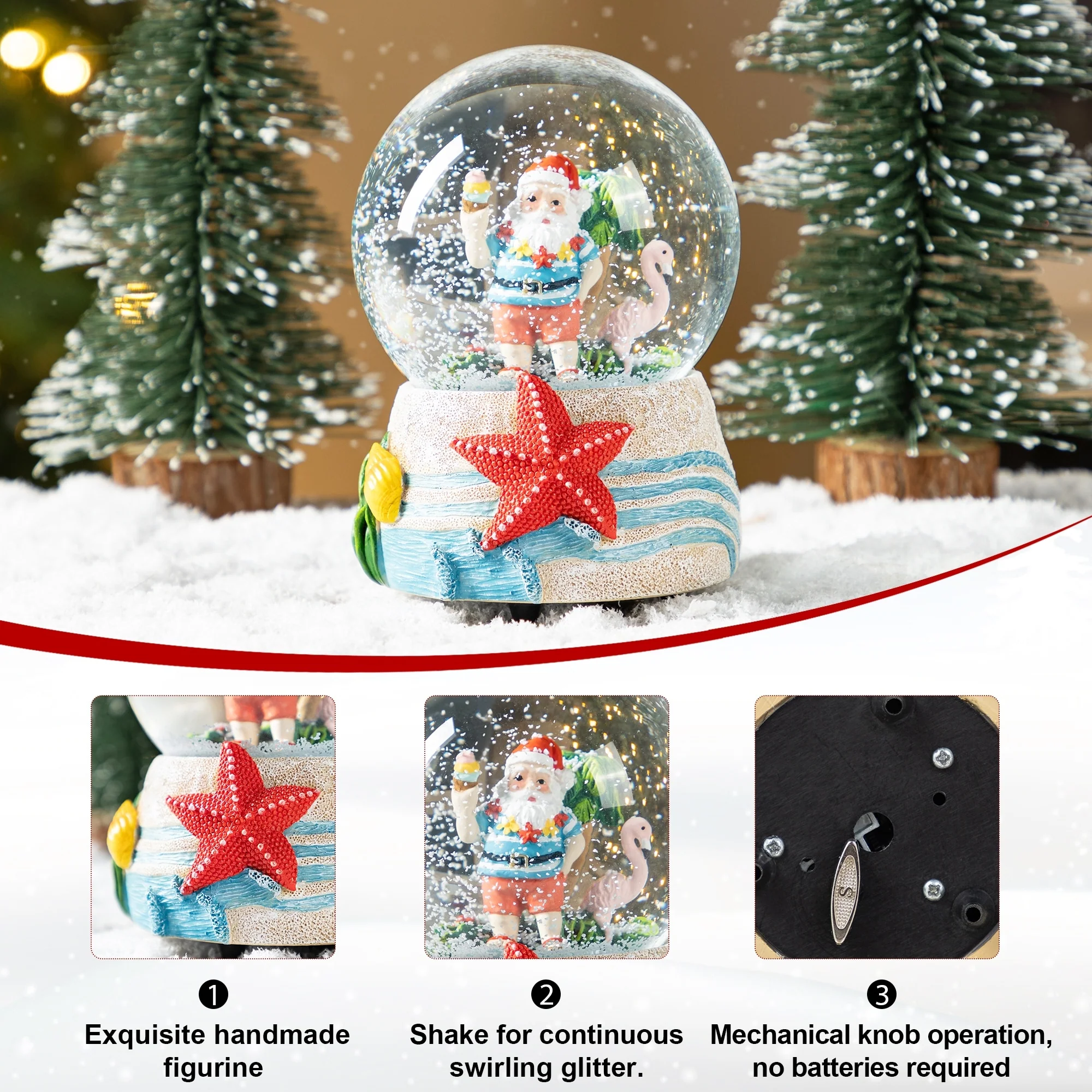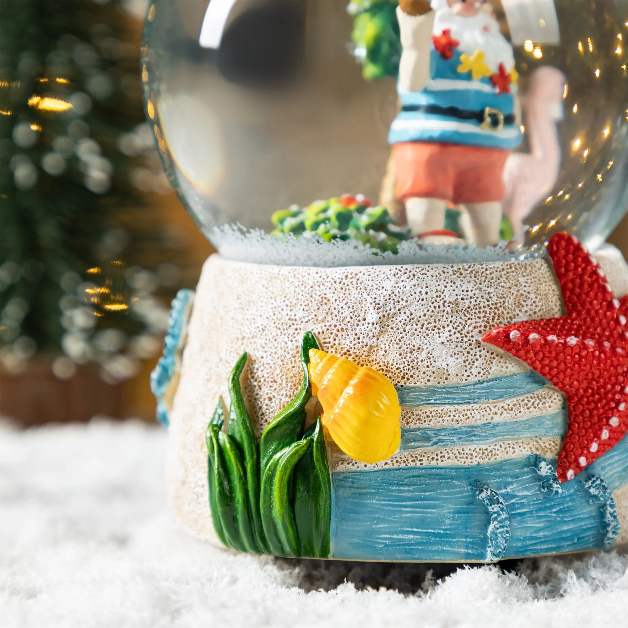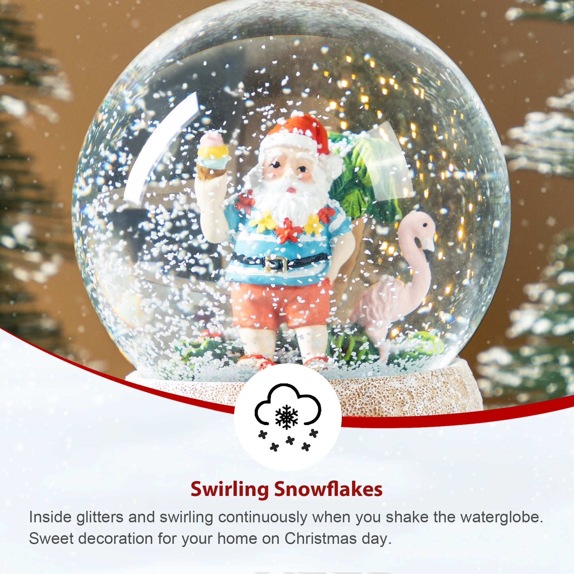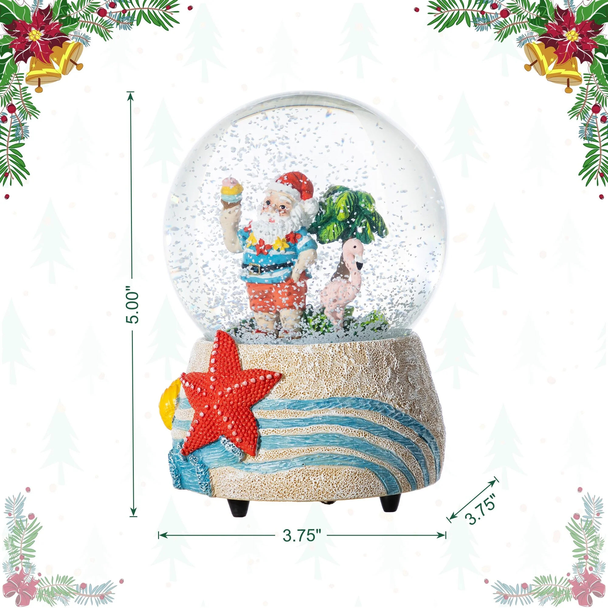 The 100mm Christmas Resin Musical Snowflakes Waterglobe is a playful and unique holiday decoration that features a whimsical scene of Santa Claus enjoying a tropical vacation, complete with a musical feature that plays festive tunes, a delightful snow effect, and a vibrantly decorated base that adds a touch of humor and joy to any Christmas display.