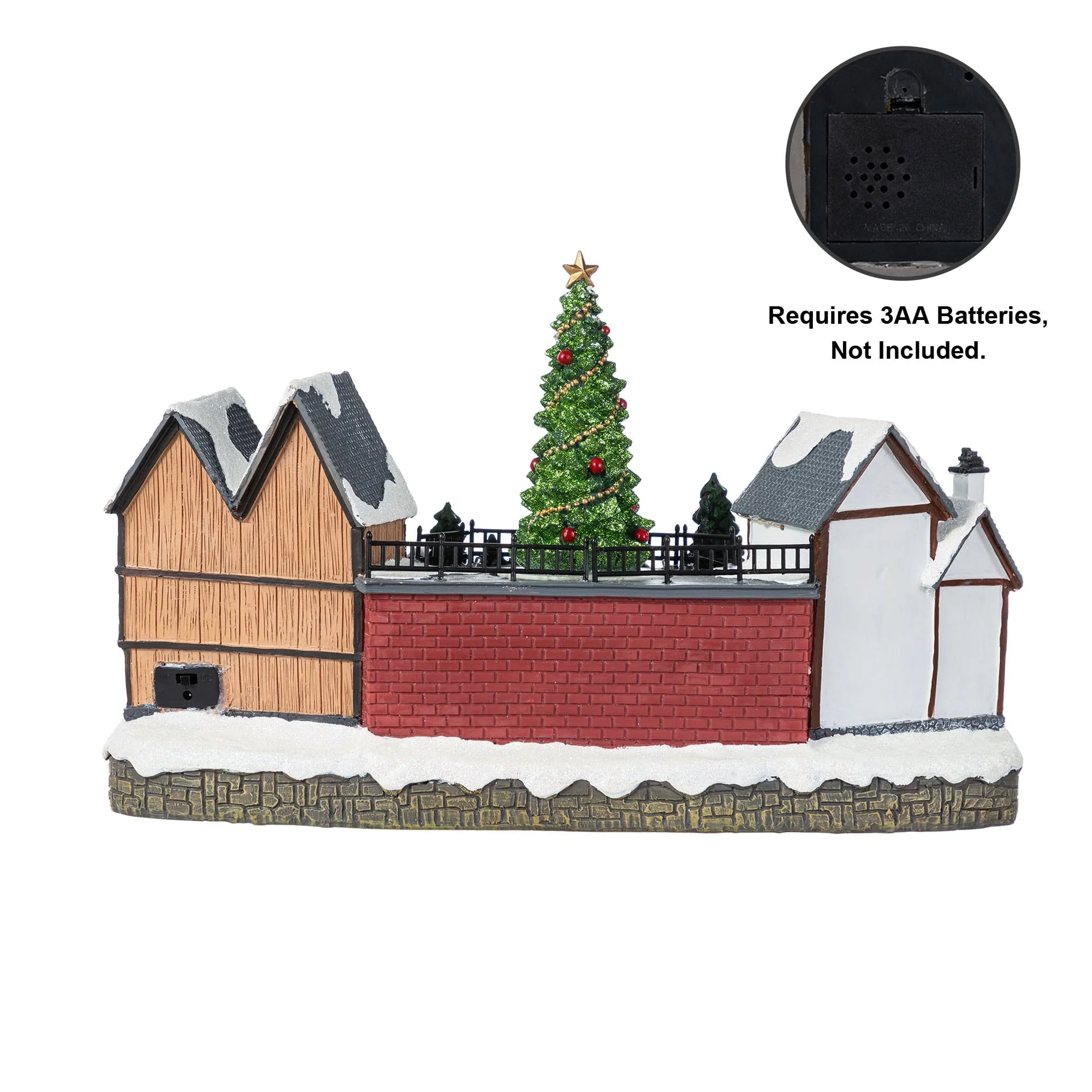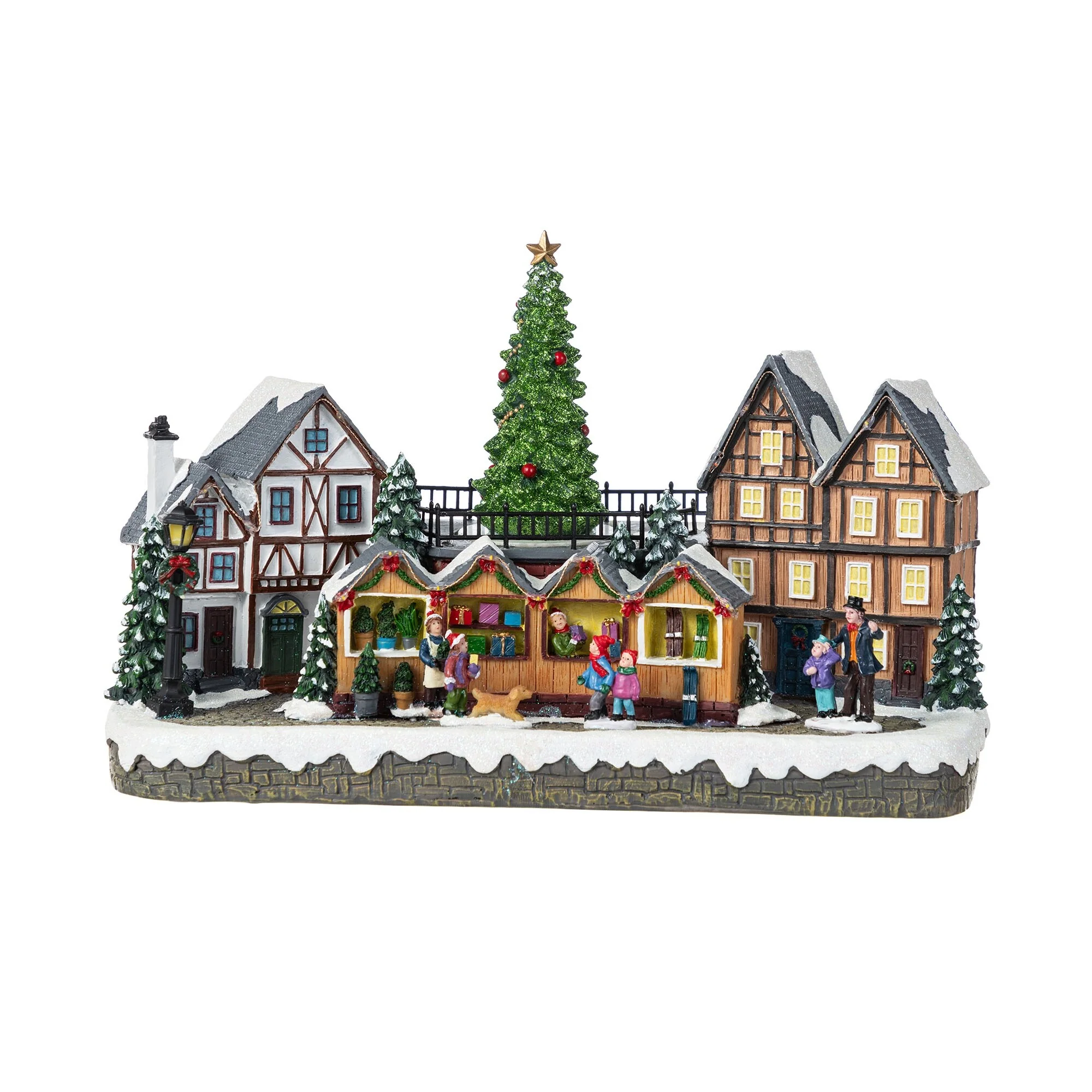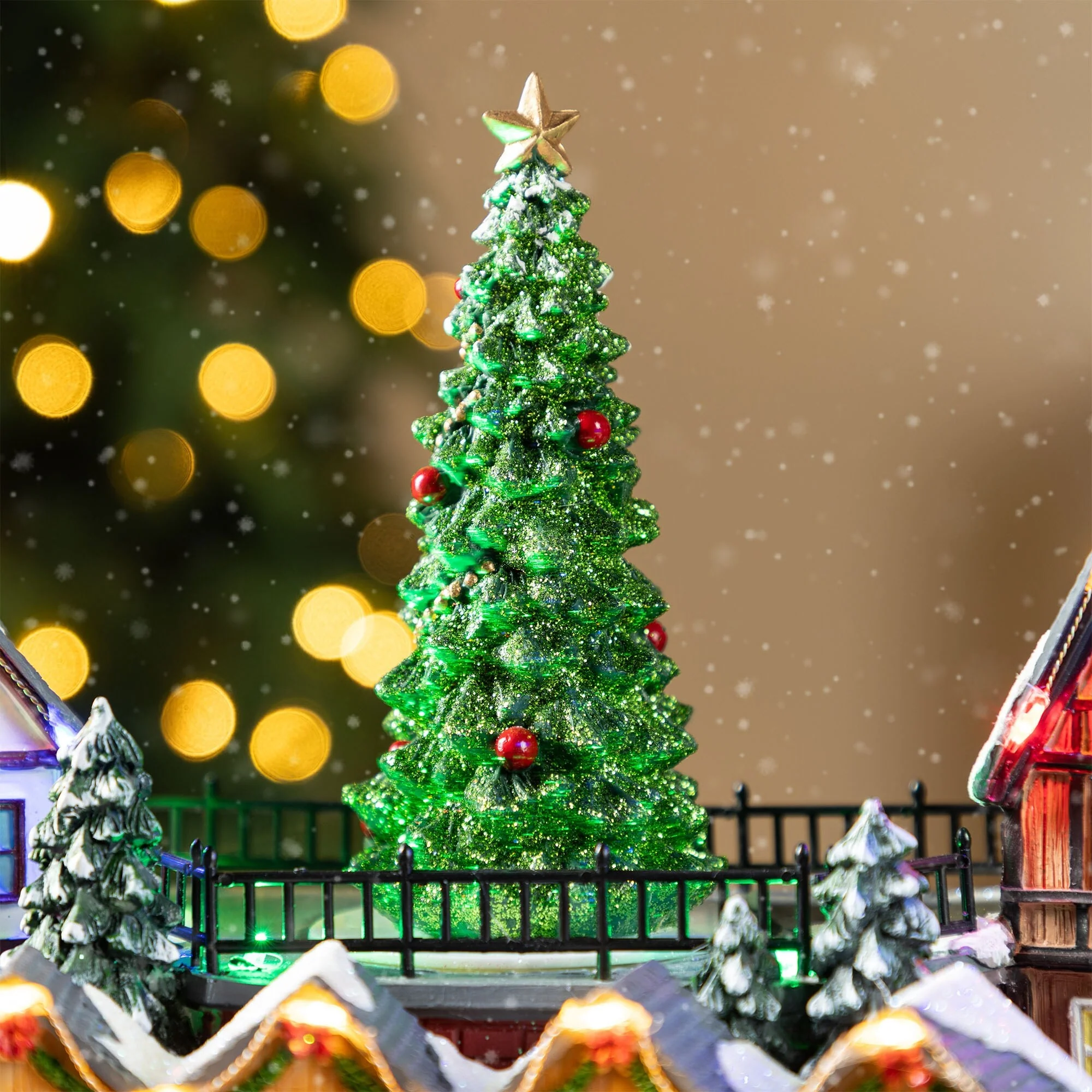 This 15.25"L Christmas Oversized Resin Lighted Table Village Decor, crafted from polyresin material, is a captivating and festive display that vividly portrays a charming winter holiday village. It features brightly lit, snow topped houses with colorful lights, a large, illuminated Christmas tree at the center, a quaint market area with miniature figures engaging in holiday activities, and a dusting of snow like texture across the entire scene, all working together to create a warm and inviting holiday atmosphere for any home.