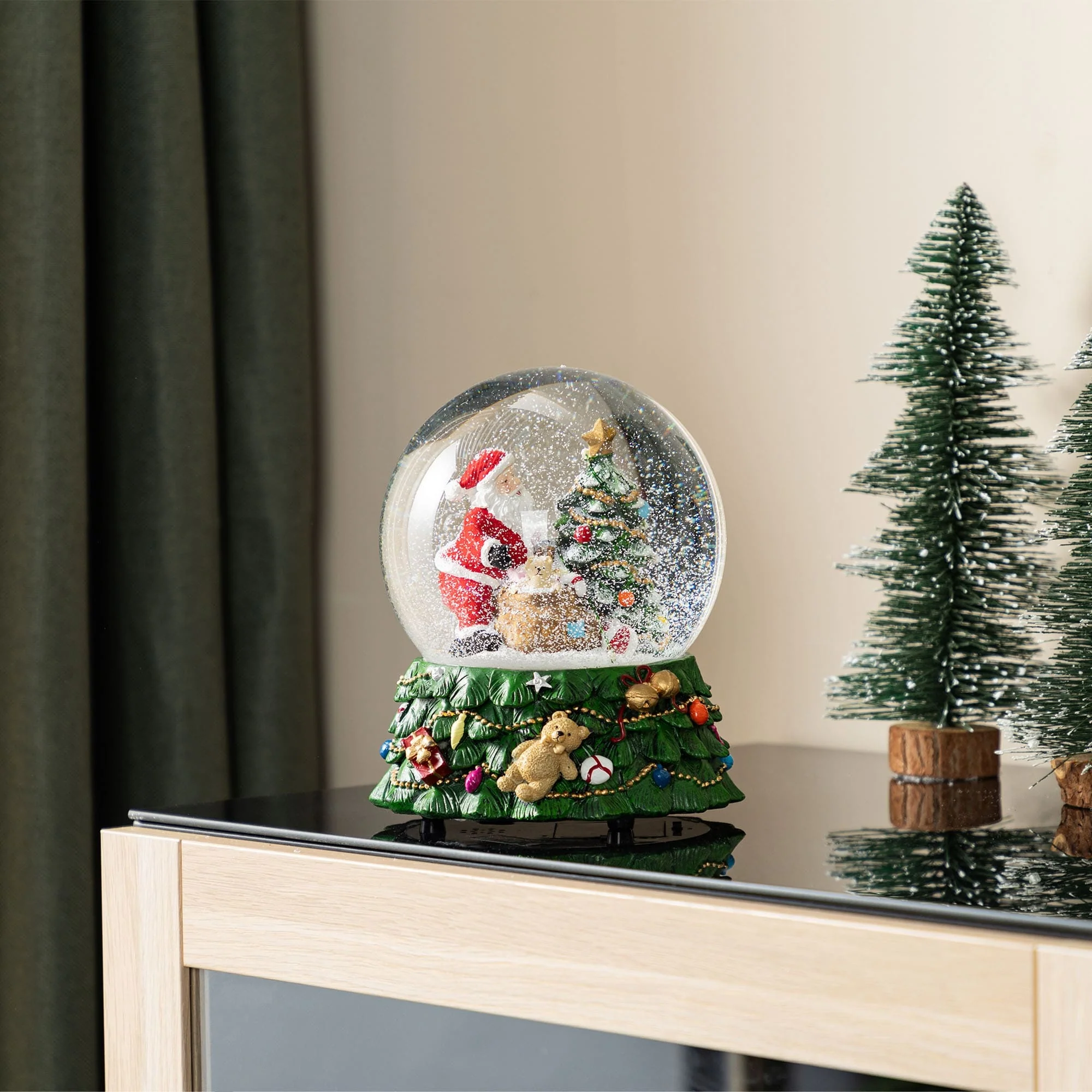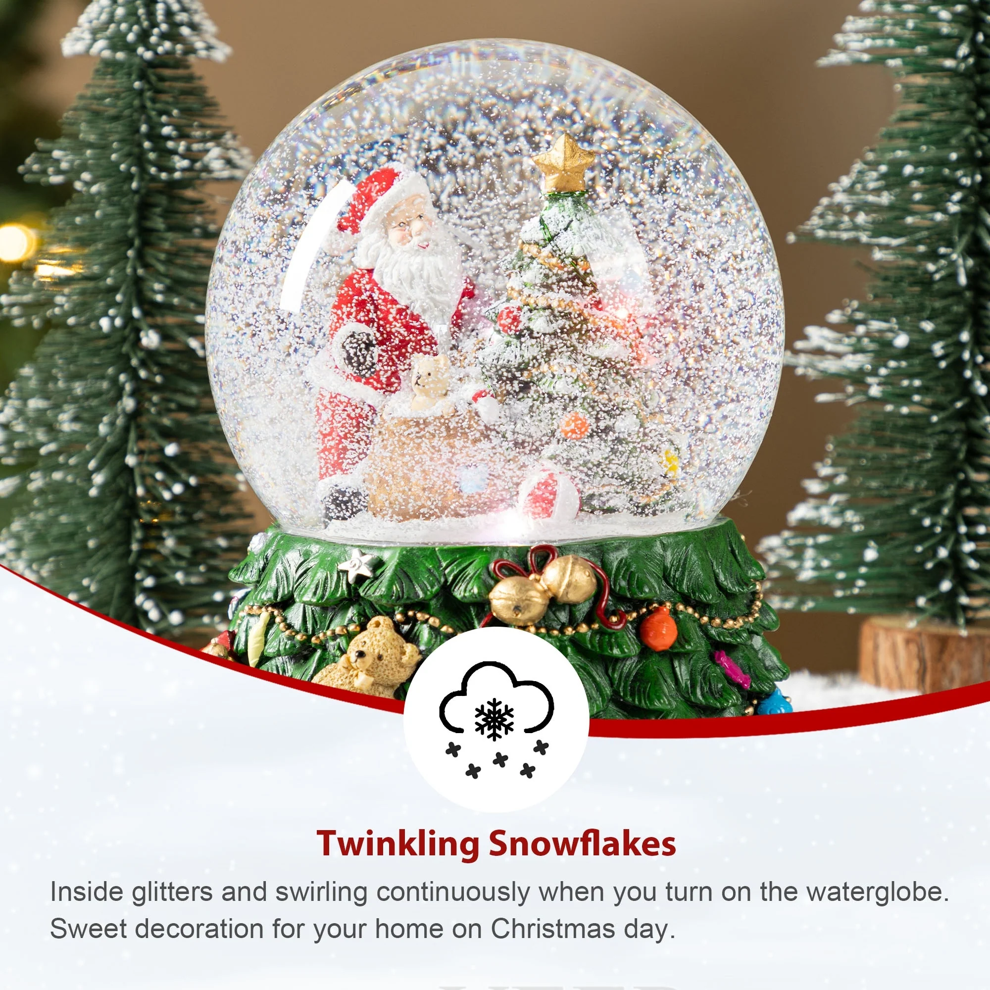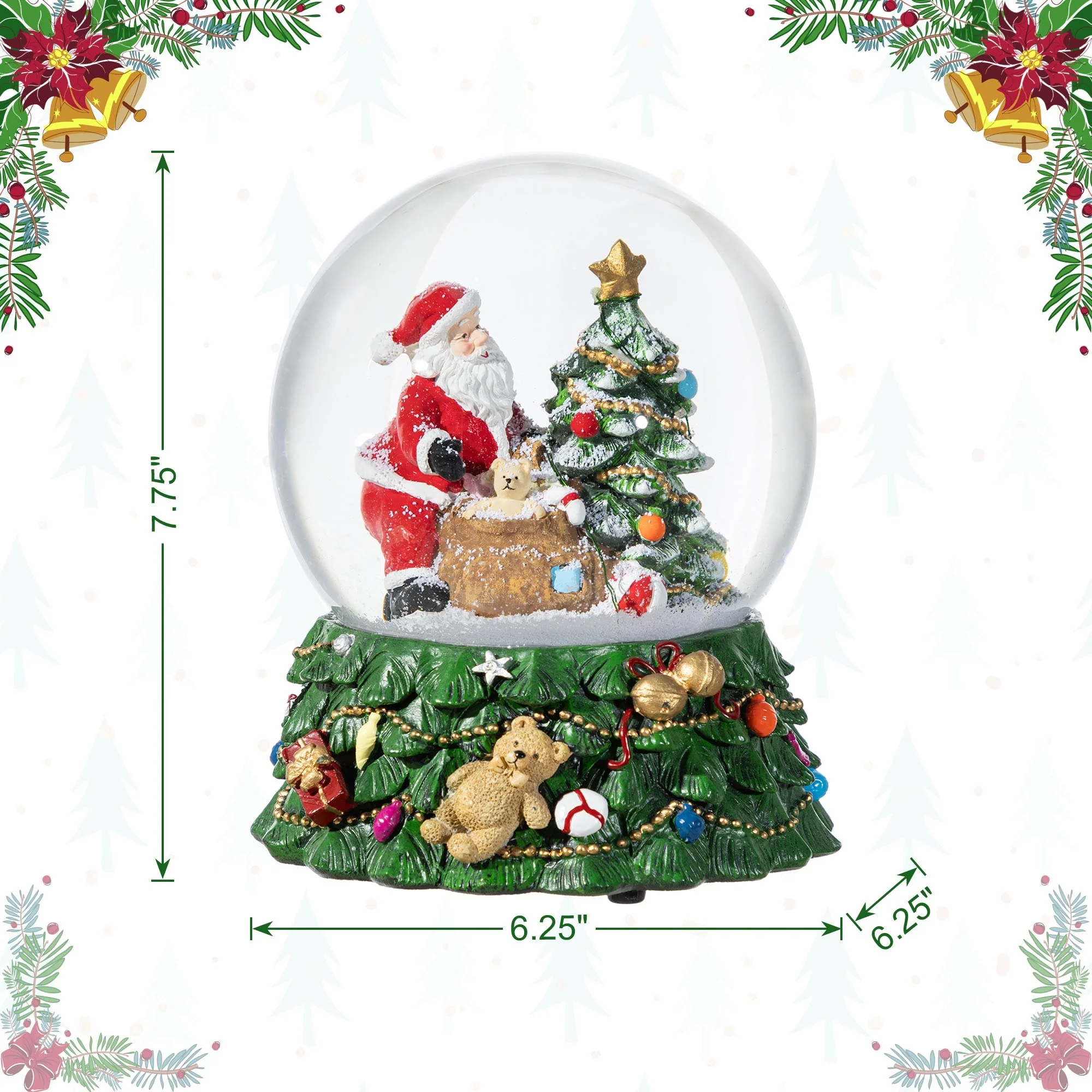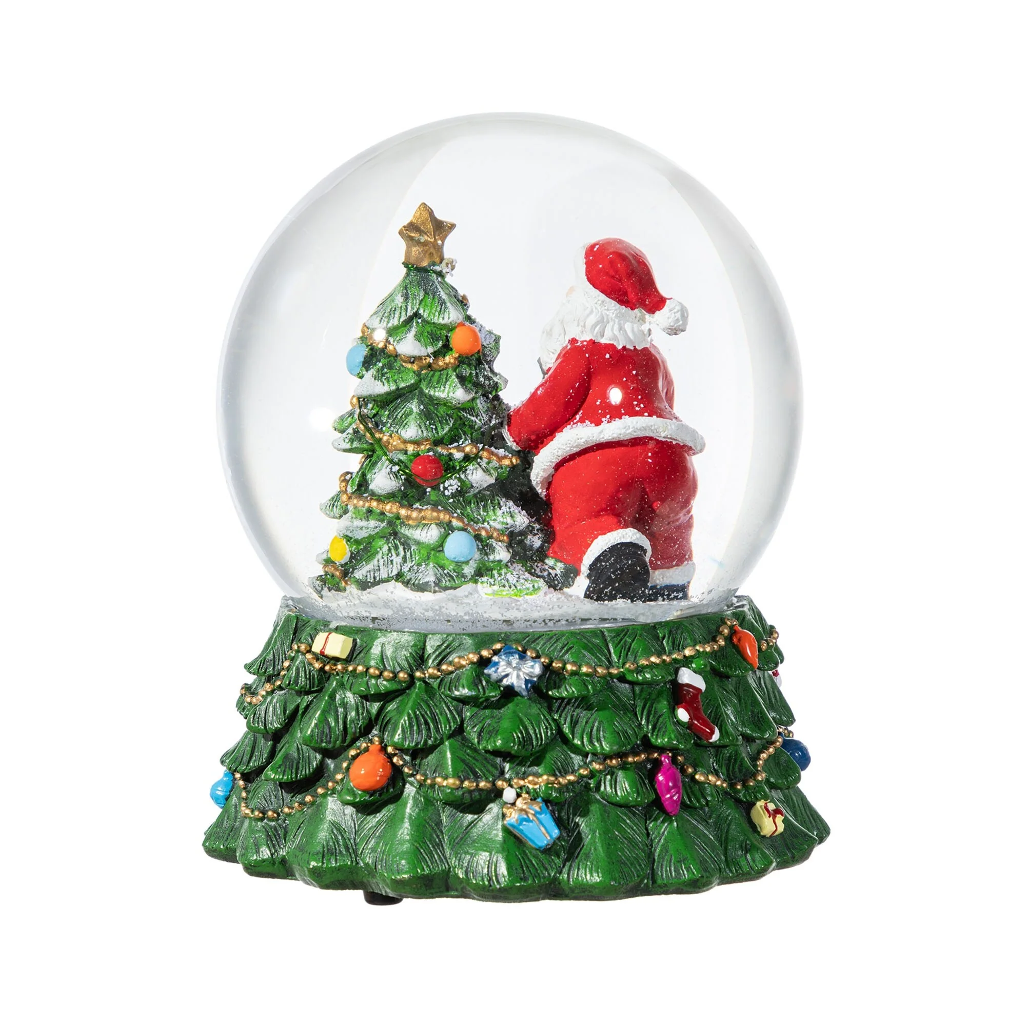 The 150mm Christmas Resin Lighted Musical Snowflakes Santa Waterglobe is a captivating holiday decoration that features a beautifully crafted Santa Claus sitting next to a decorated Christmas tree inside a clear snow globe, atop a festive base adorned with a teddy bear, ornaments, and lights, with the added charm of a musical component and a mesmerizing snow effect that creates a magical holiday atmosphere.