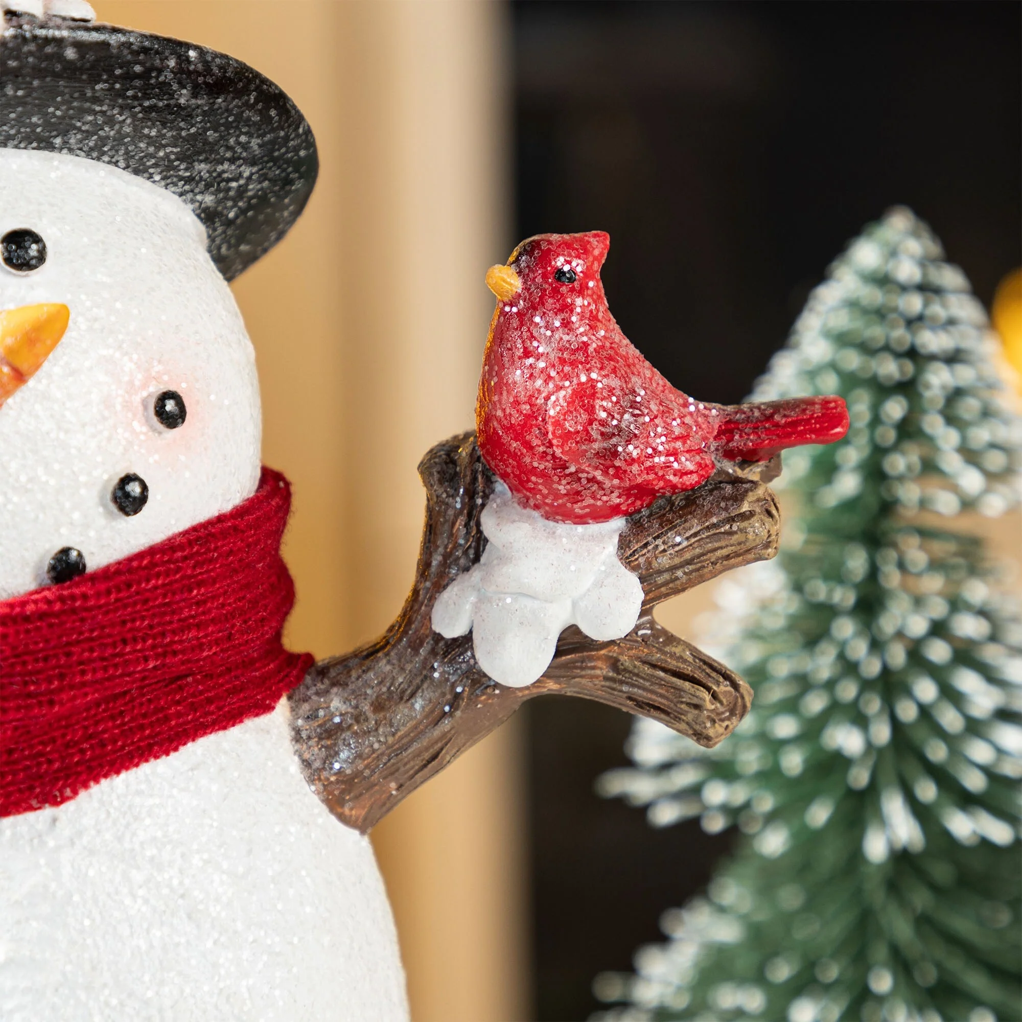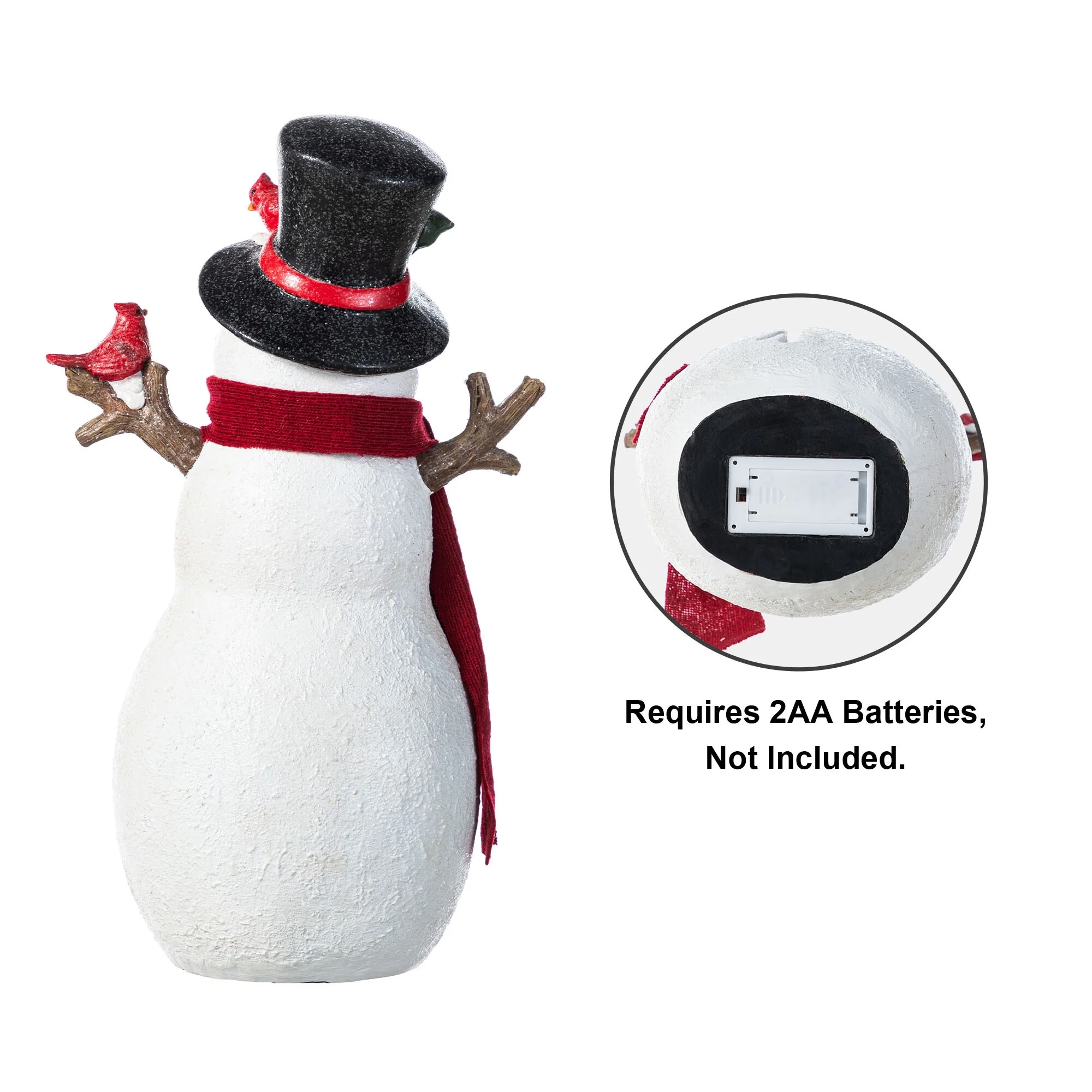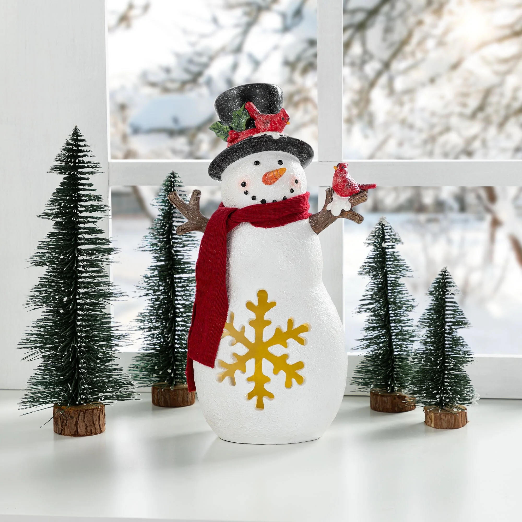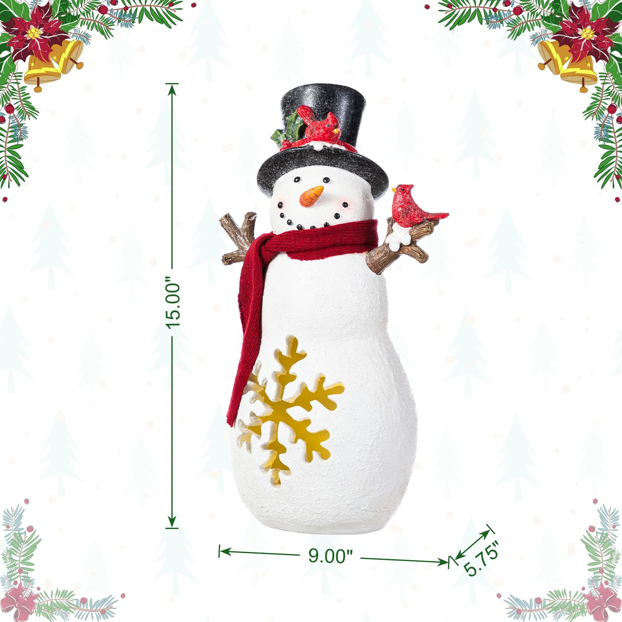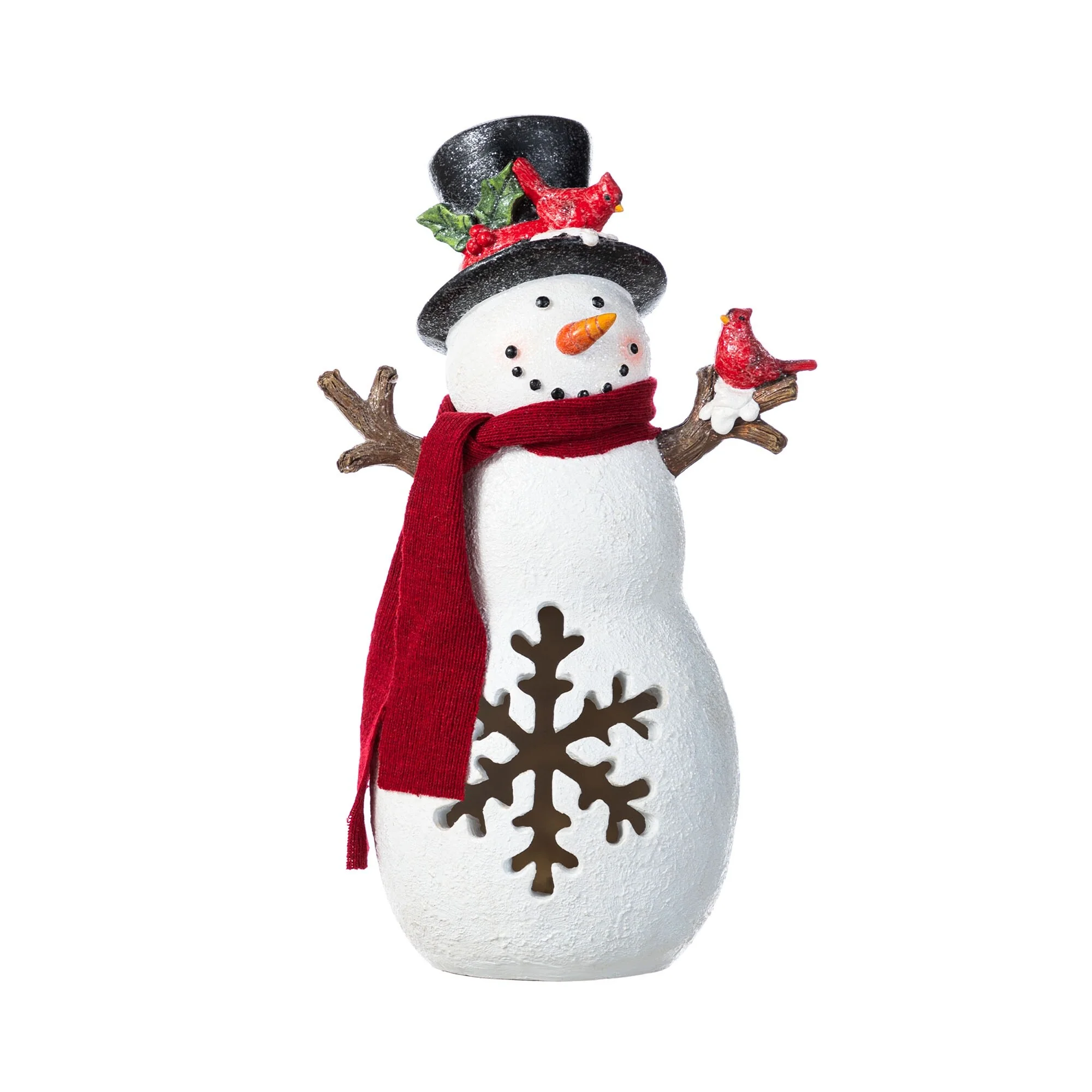 The 15""H Christmas Lighted Resin Table Decor is a delightful and festive addition to your holiday decor, featuring a charming snowman with a red scarf, top hat adorned with a cardinal, and a snowflake design that glows warmly when lit, creating a cozy and inviting atmosphere on any table or mantel during the Christmas season.