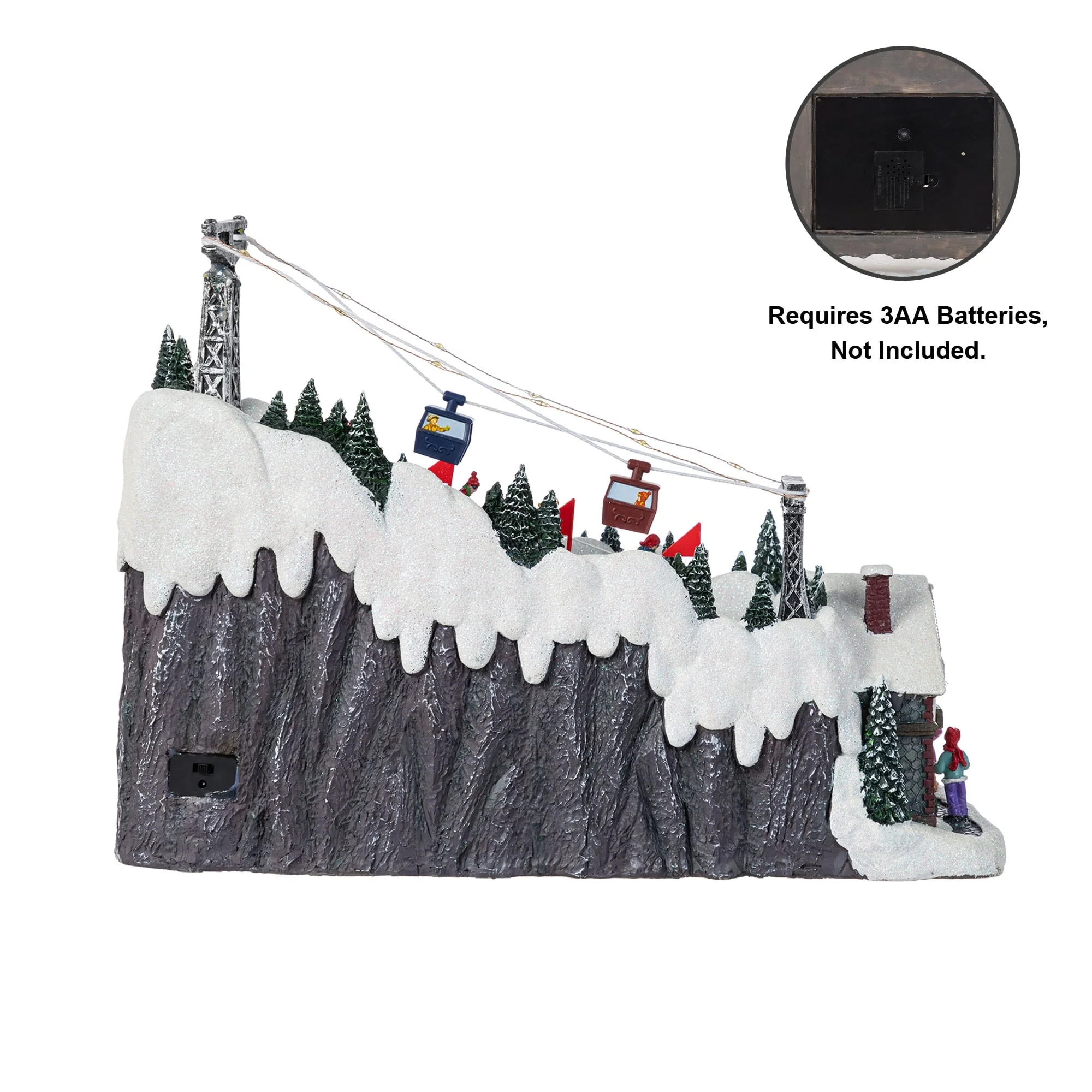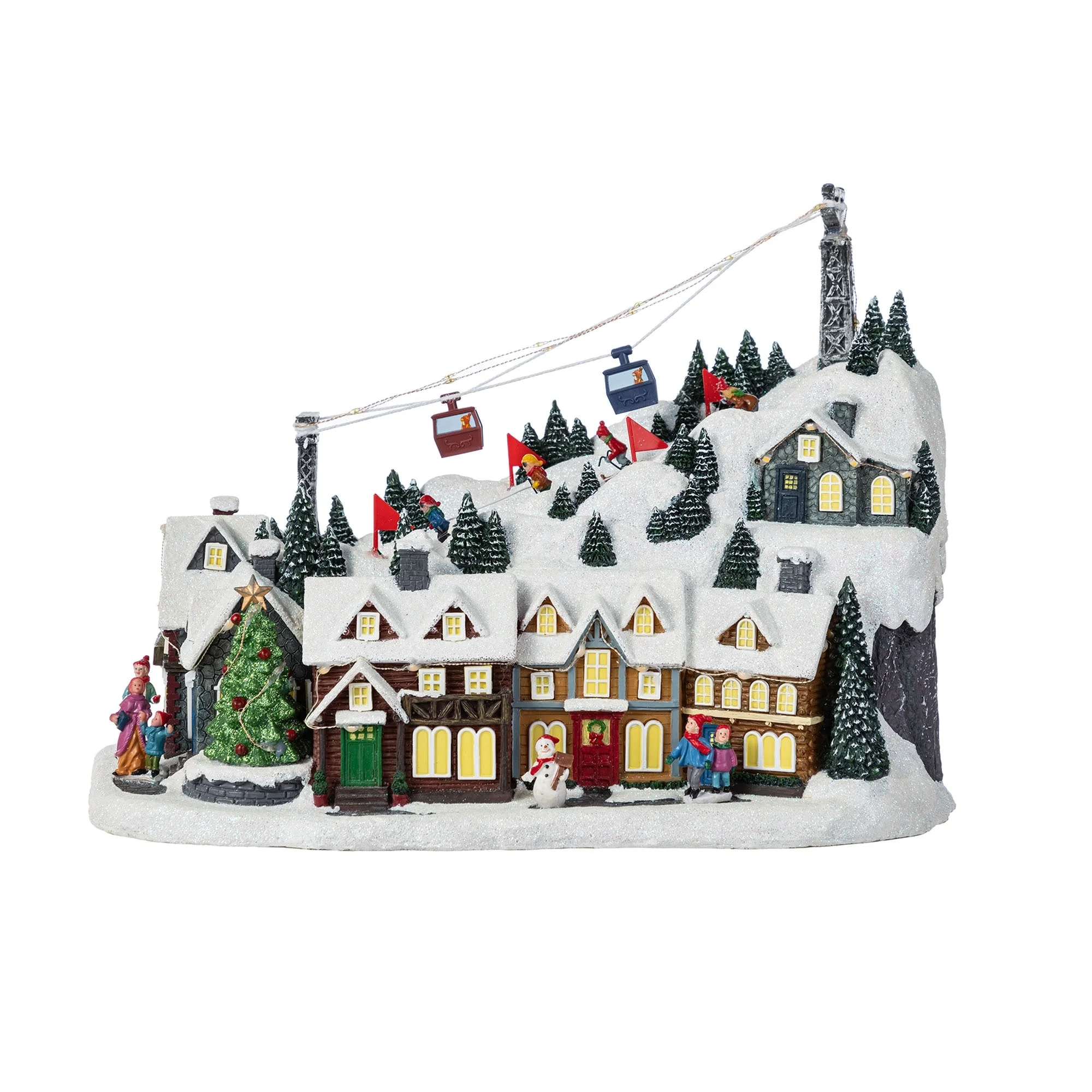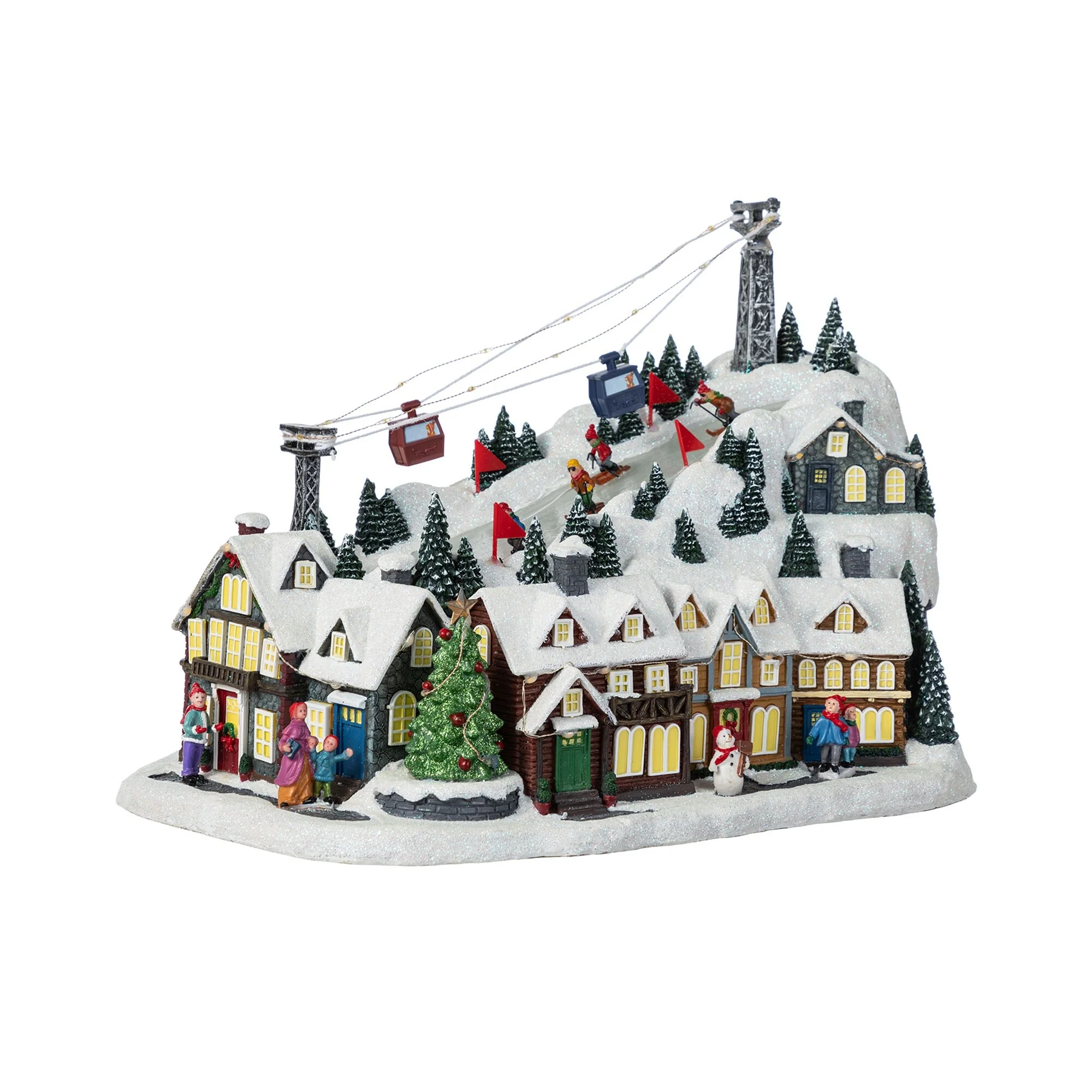 This 16"H Christmas Oversized Resin Lighted Table Village Decor, crafted from polyresin material, is a charming and festive centerpiece that brings to life a bustling winter skiing village scene, complete with illuminated houses, a working ski lift, animated skiers on the slopes, and a musical feature that plays classic tunes, all set against a backdrop of snow covered trees and buildings, making it a perfect addition to enhance the holiday spirit for every family.