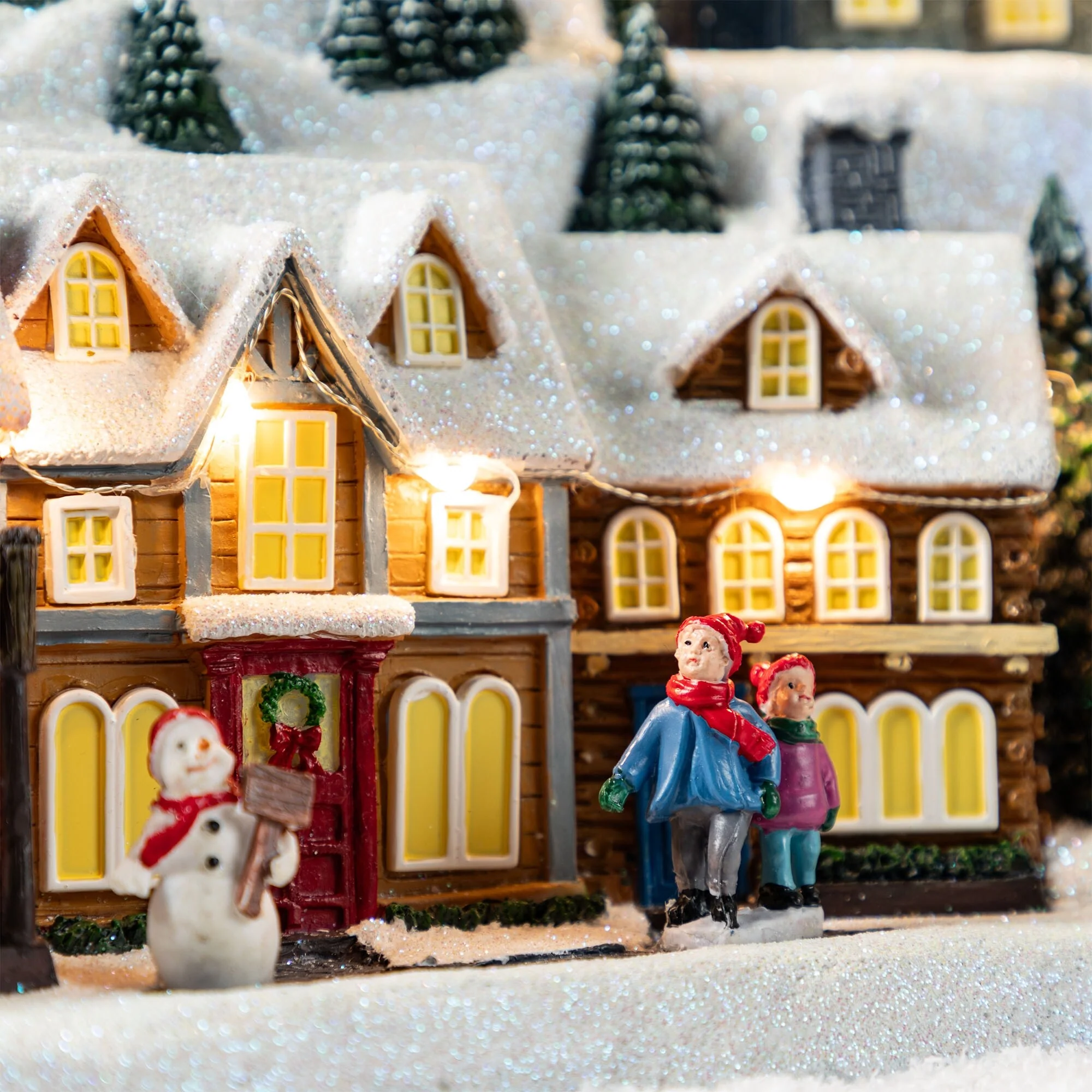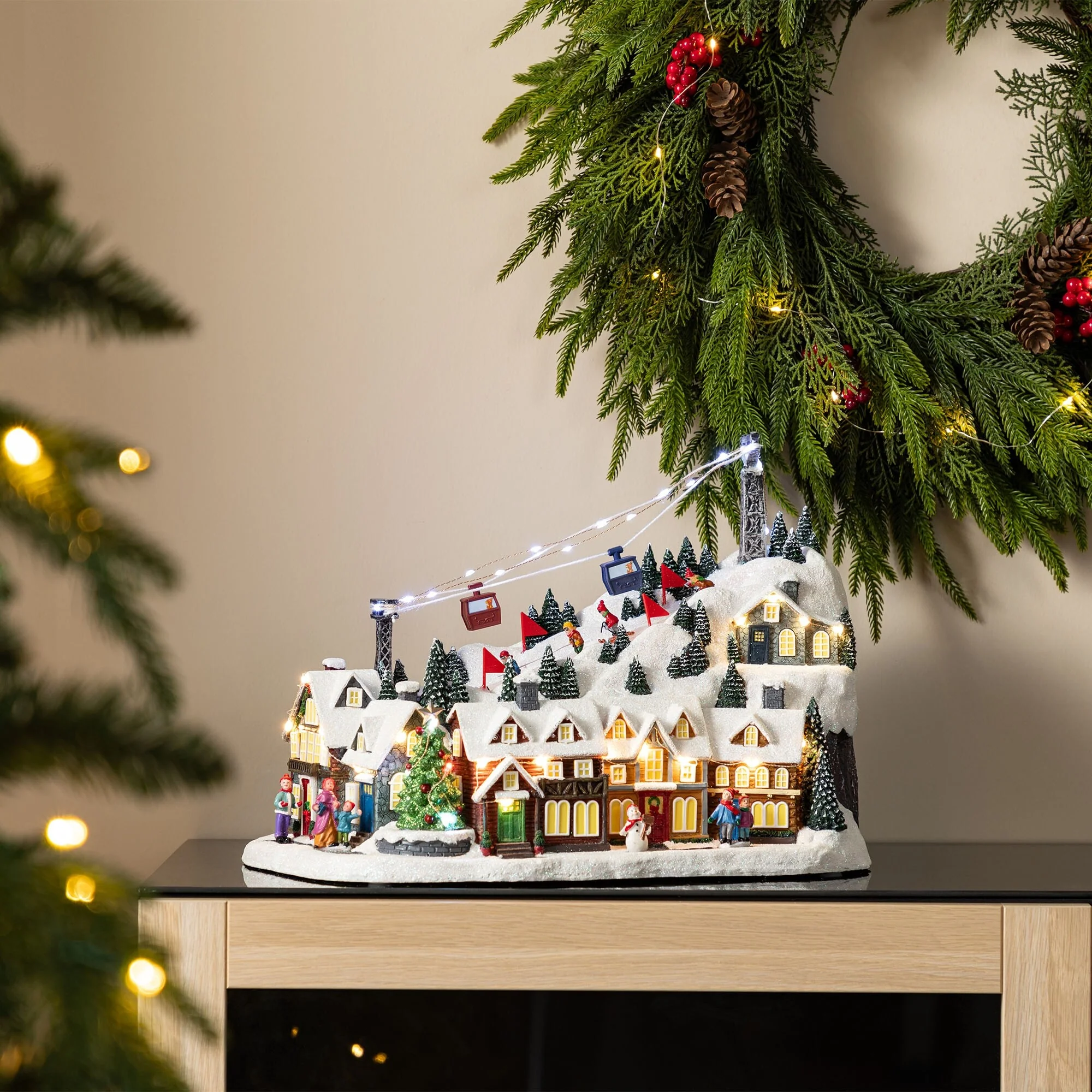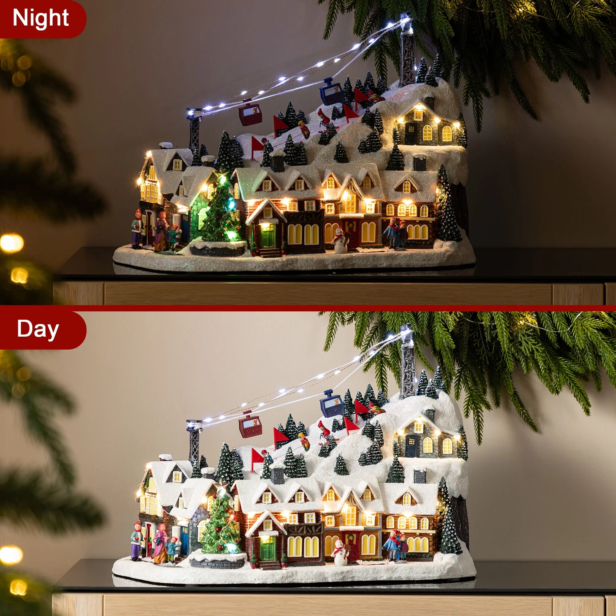 This 16"H Christmas Oversized Resin Lighted Table Village Decor, crafted from polyresin material, is a charming and festive centerpiece that brings to life a bustling winter skiing village scene, complete with illuminated houses, a working ski lift, animated skiers on the slopes, and a musical feature that plays classic tunes, all set against a backdrop of snow covered trees and buildings, making it a perfect addition to enhance the holiday spirit for every family.