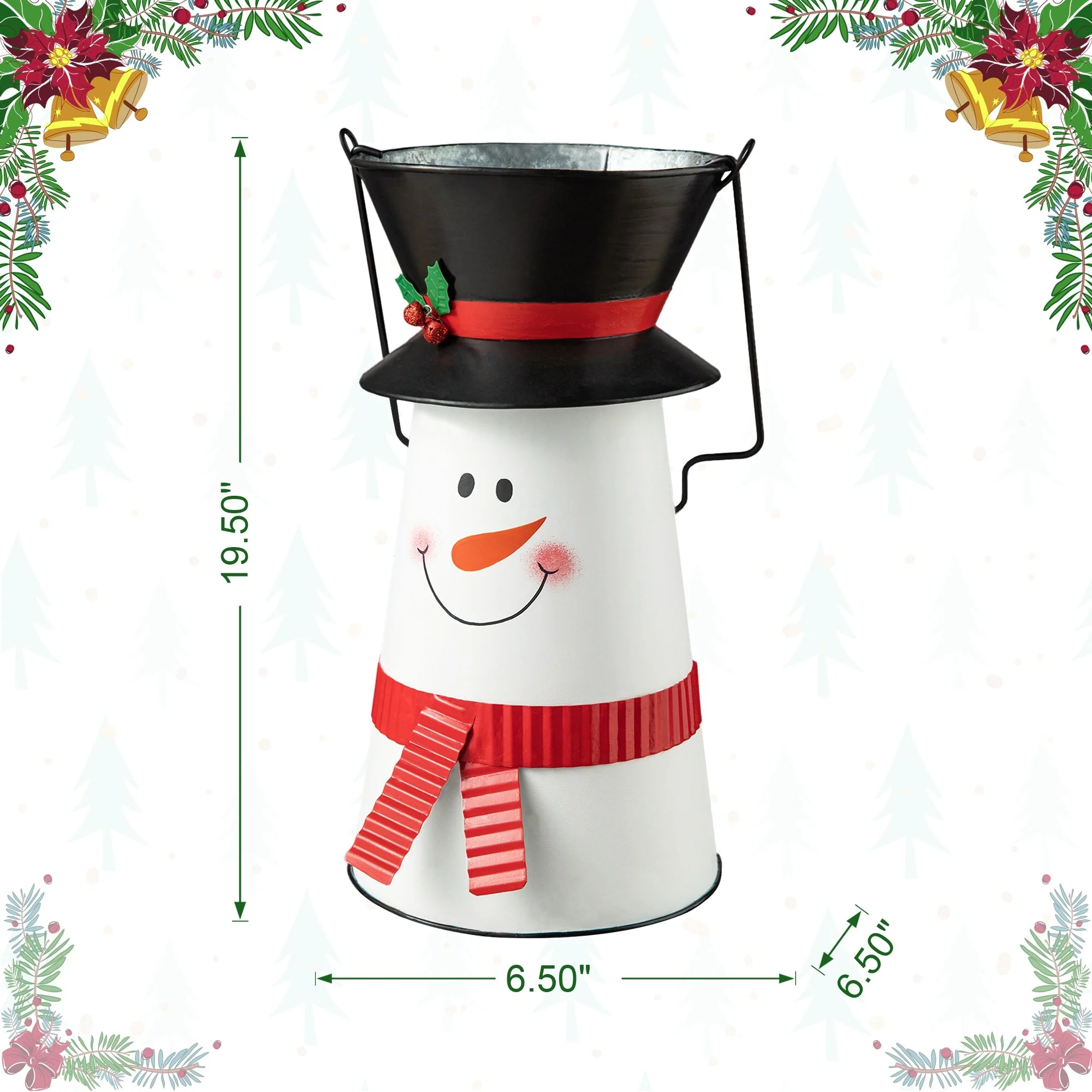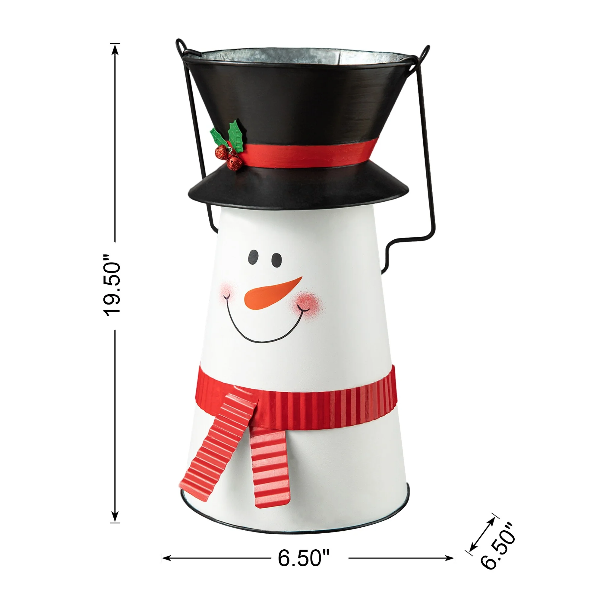 This Snowman Bucket with a white background and black hat, red scarf. The handle is flexible. Use it to accent any area in your home or business by adding to your existing rustic metal decor during the Christmas Holiday Winter season.