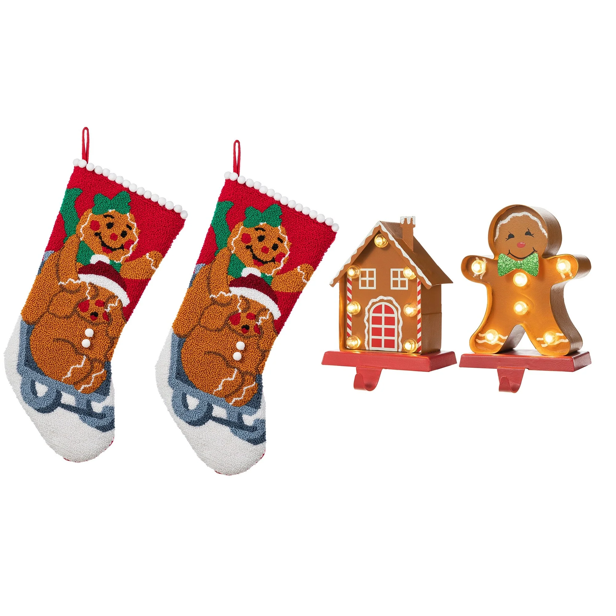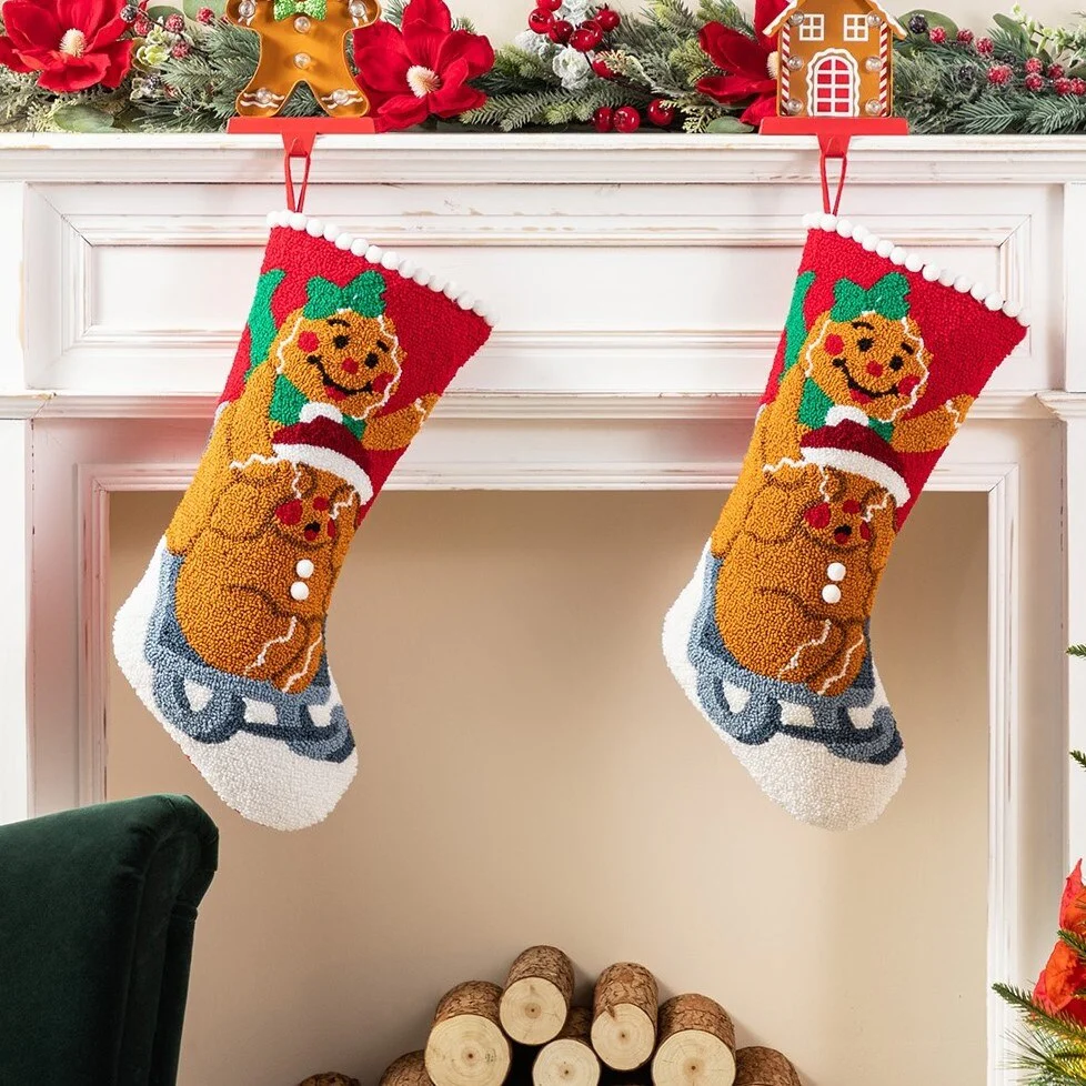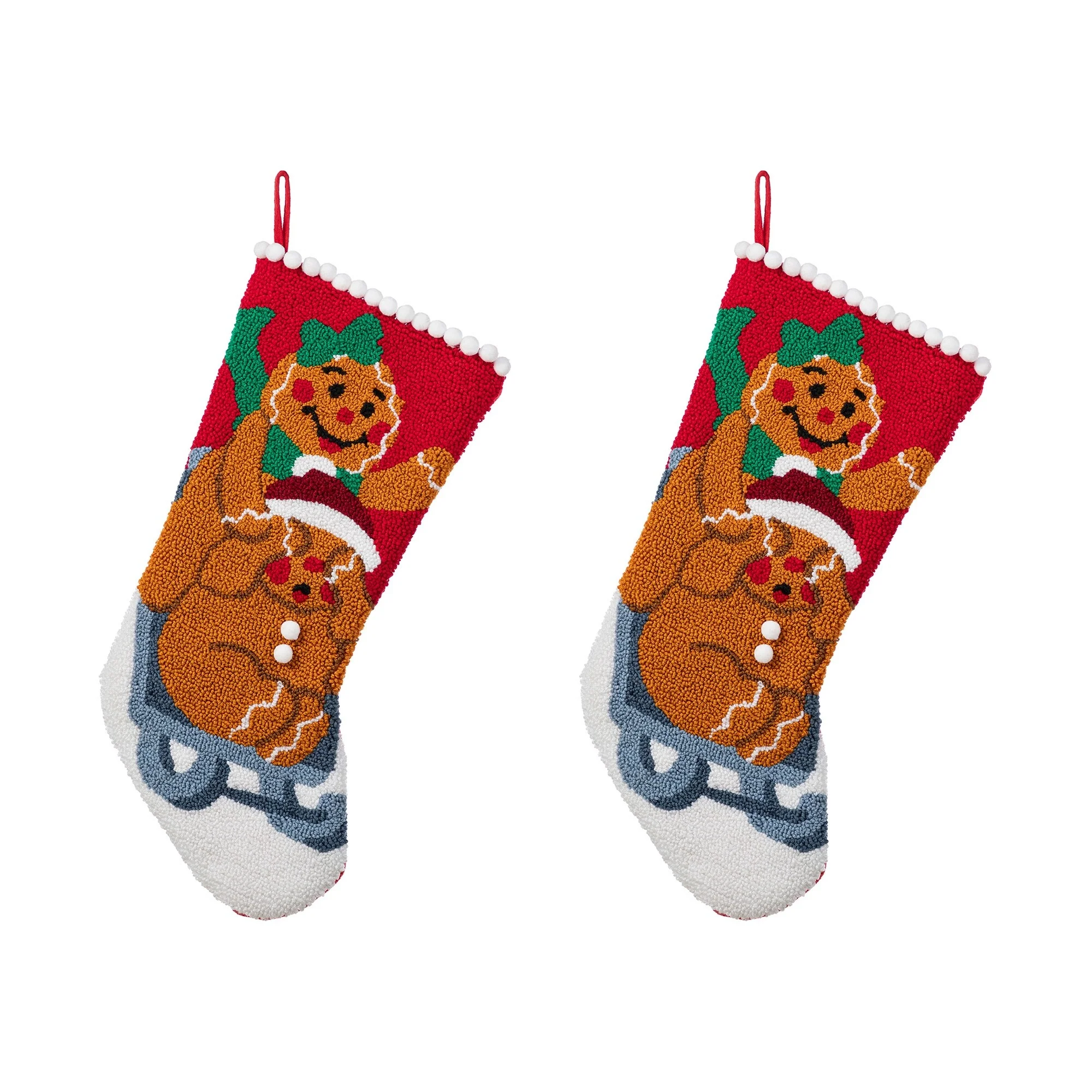 This 21''L Hooked Stocking features two cheerful gingerbread men, one wearing a green bow and the other a Santa hat, riding on a sled, all set against a vibrant red, with a white pom-pom trim along the top, making it a festive and delightful addition to your Christmas decorations. High quality hooked material and exquisite workmanship make it look perfect, not only as a holiday decoration but a delivery of your love to your family members.