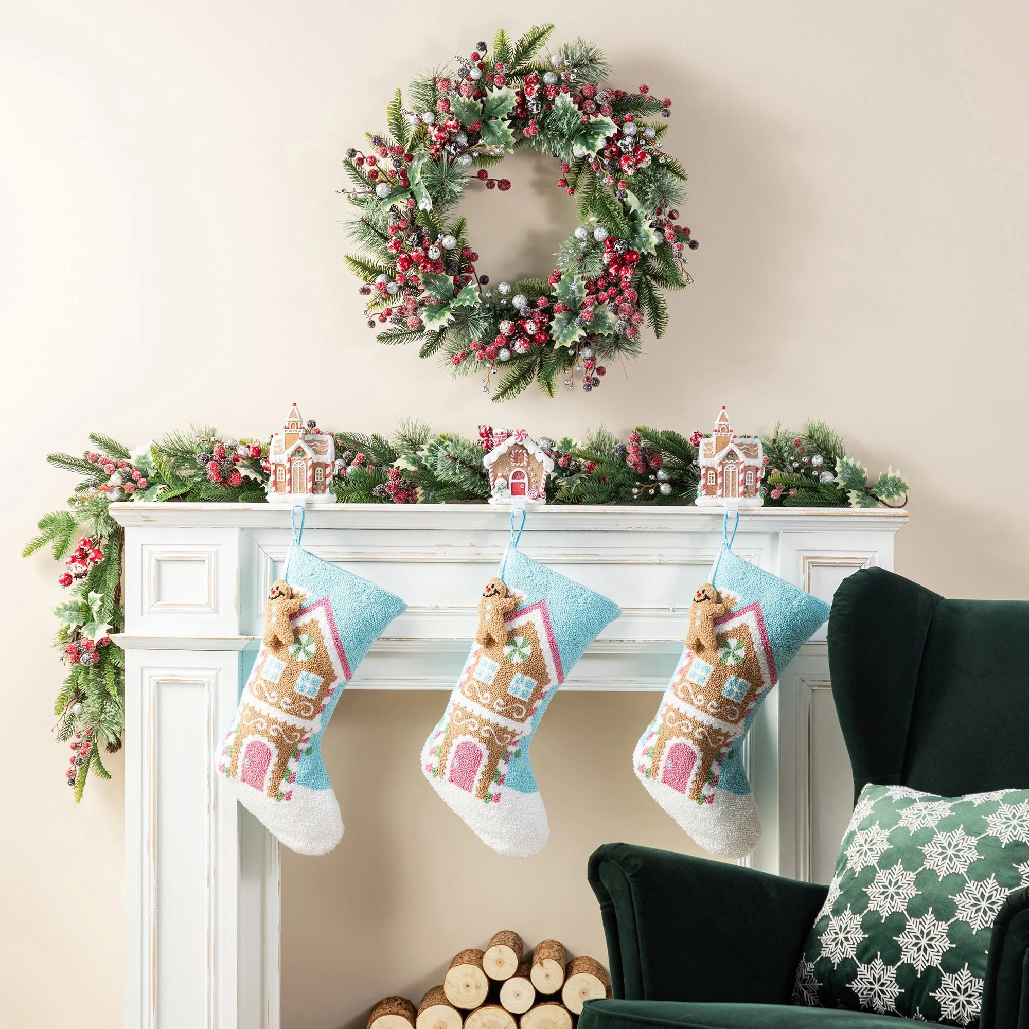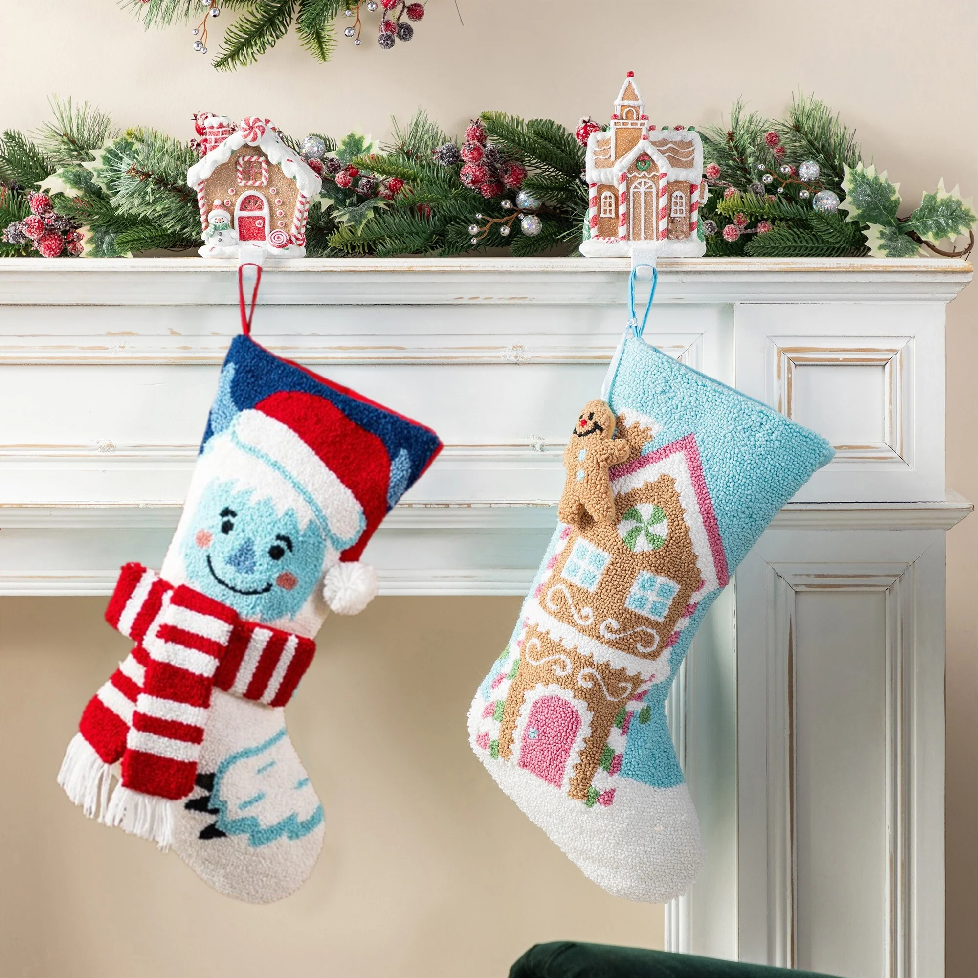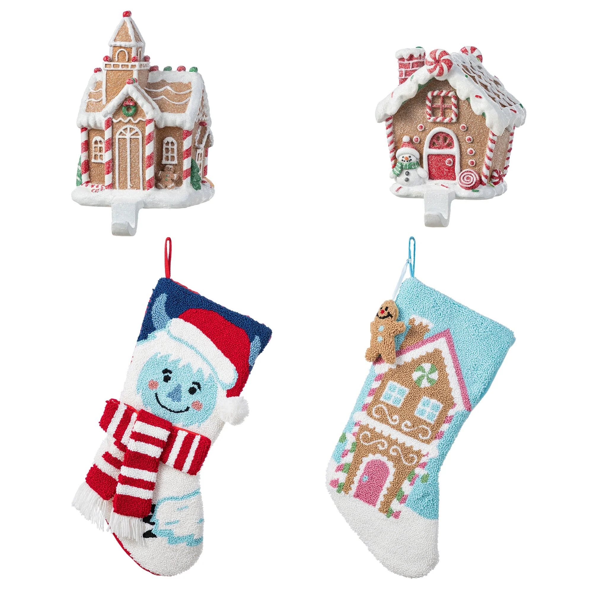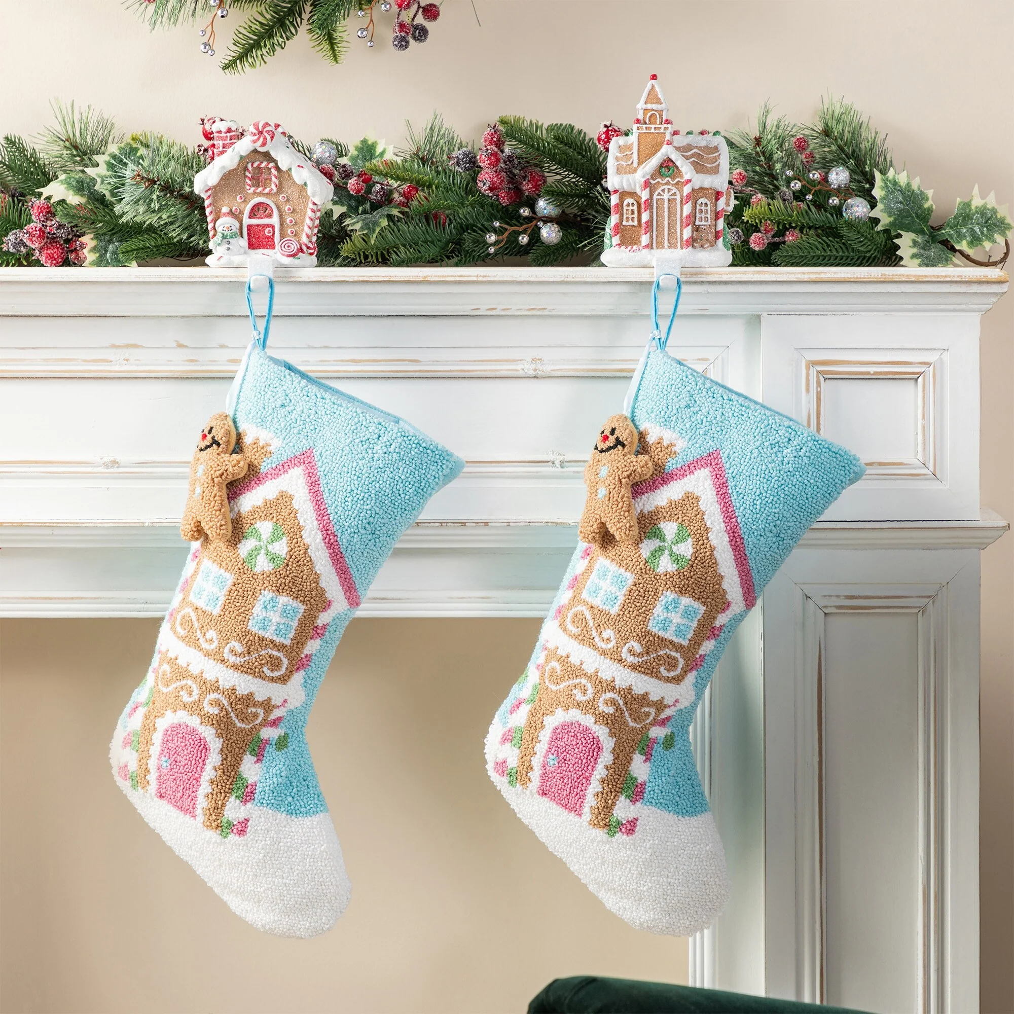 This 21''L Hooked Stocking features a beautifully hooked design of a gingerbread house adorned with colorful details and a complimentary gingerbread man attached, making it a sweet and festive addition to your Christmas decorations. High quality hooked material and exquisite workmanship make it look perfect, not only as a holiday decoration but a delivery of your love to your family members.