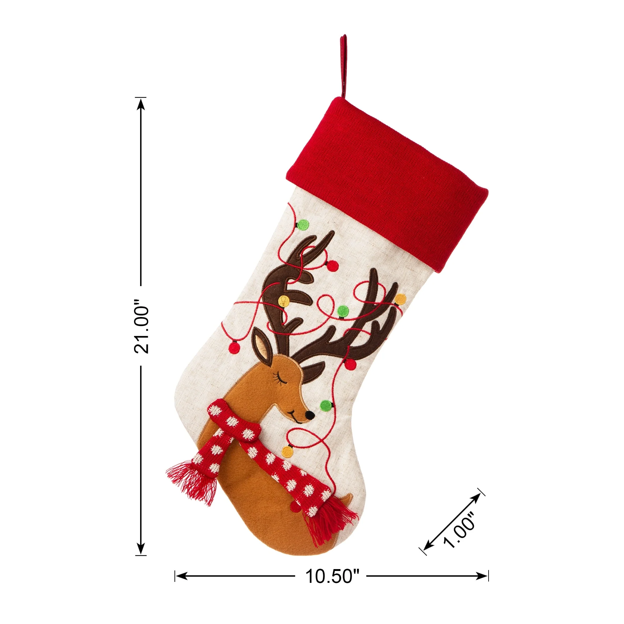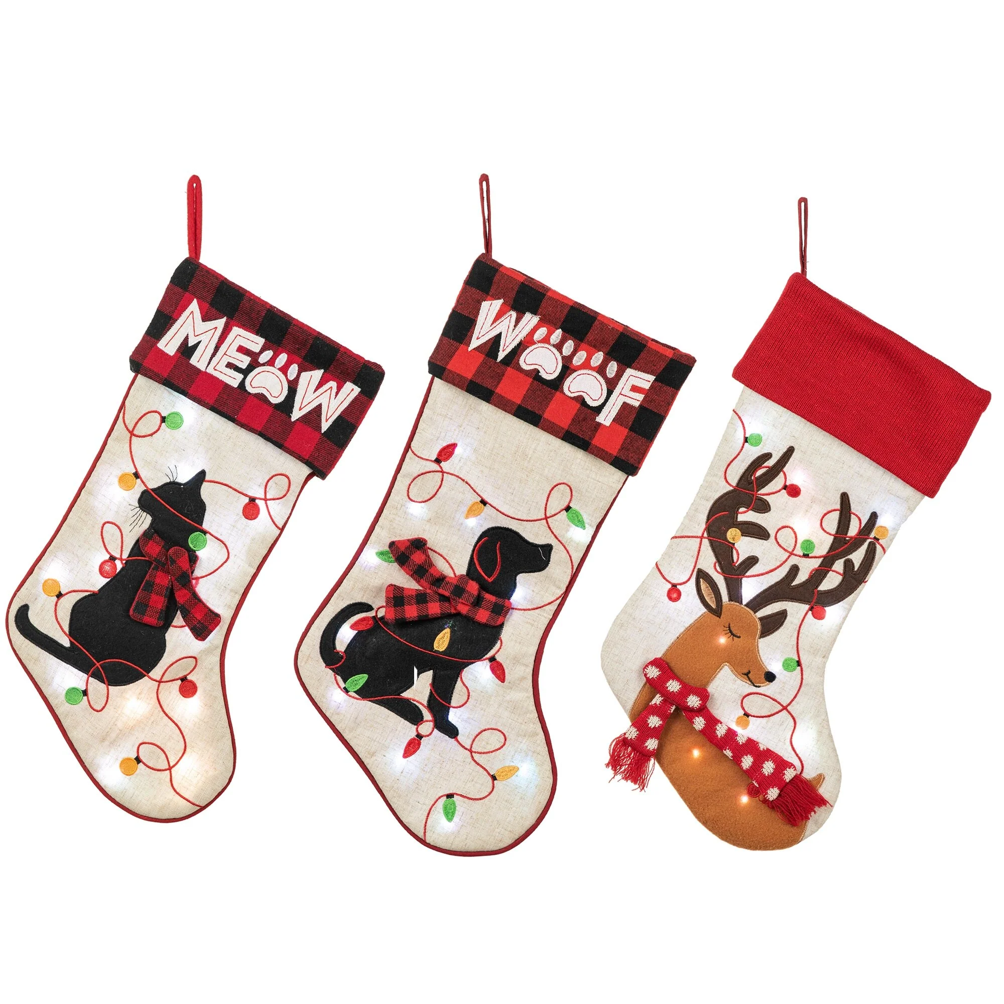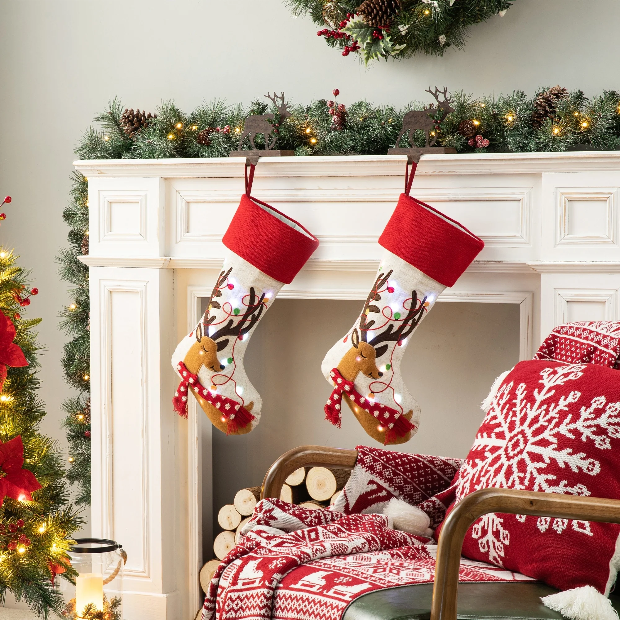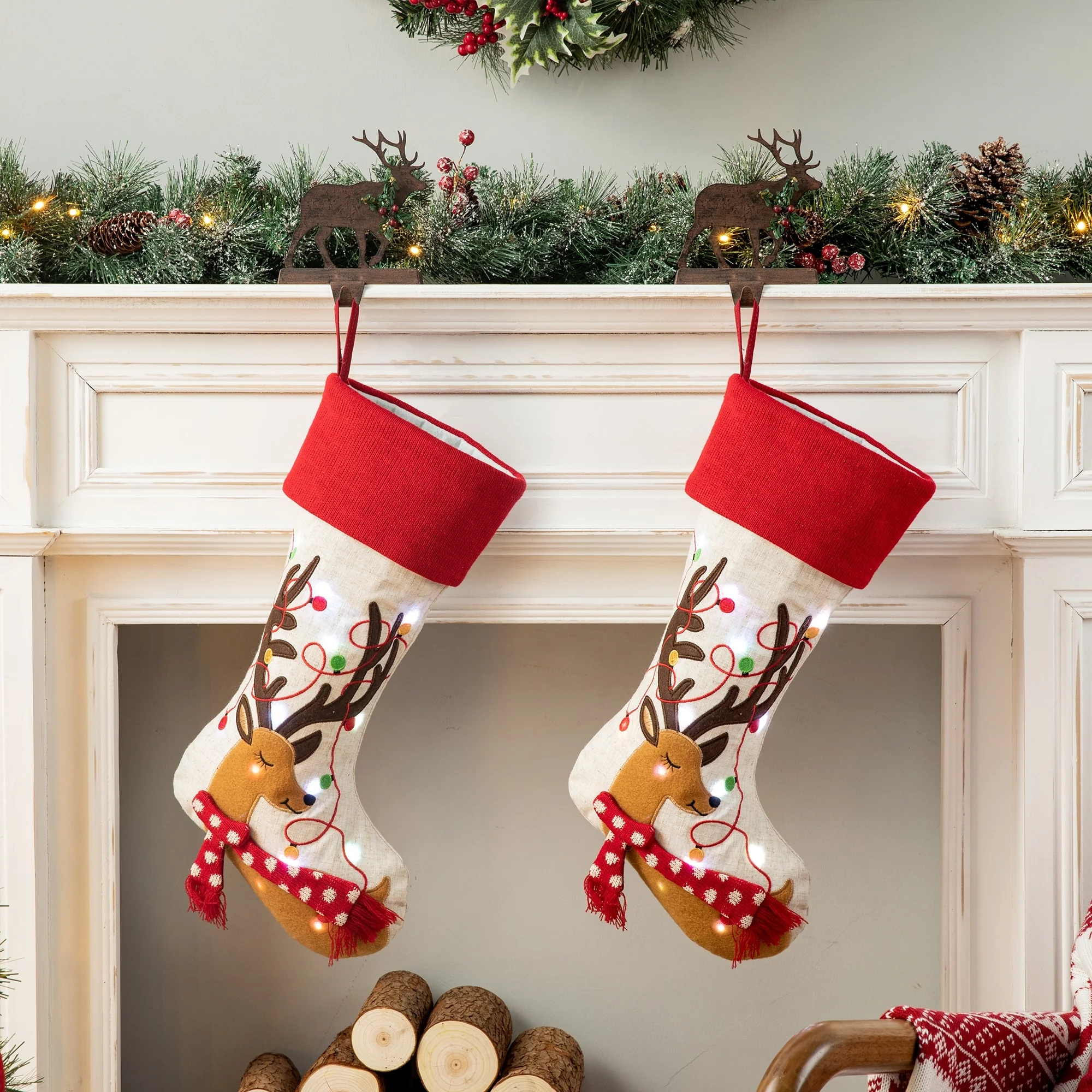 LED embroidered linen Christmas stockings are the special decorating part to welcome Santa. We provide the handcraft one for you to celebrate the very season in the year, with high quality material, you can experience the soft and smooth touch, and is safe for your younger kids.