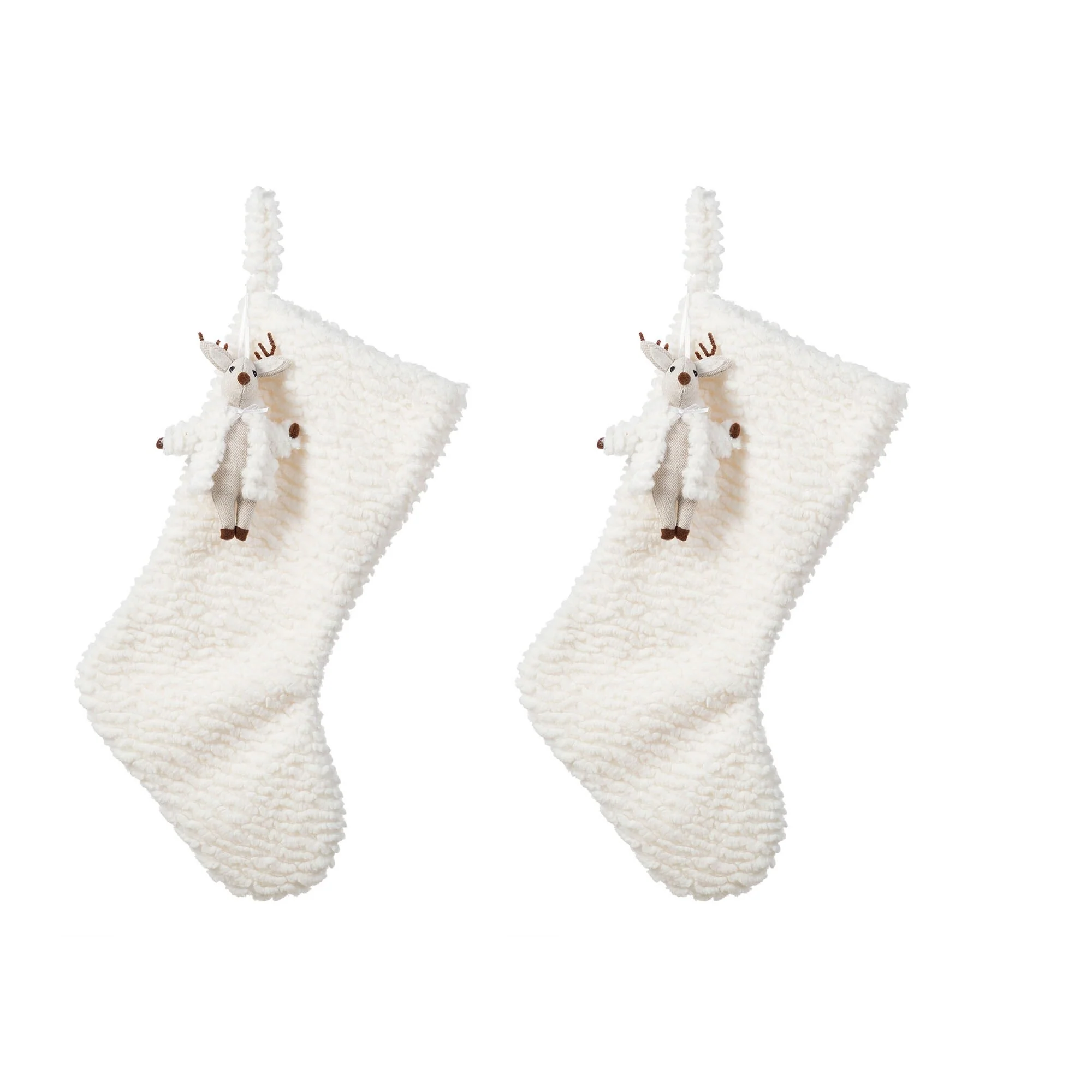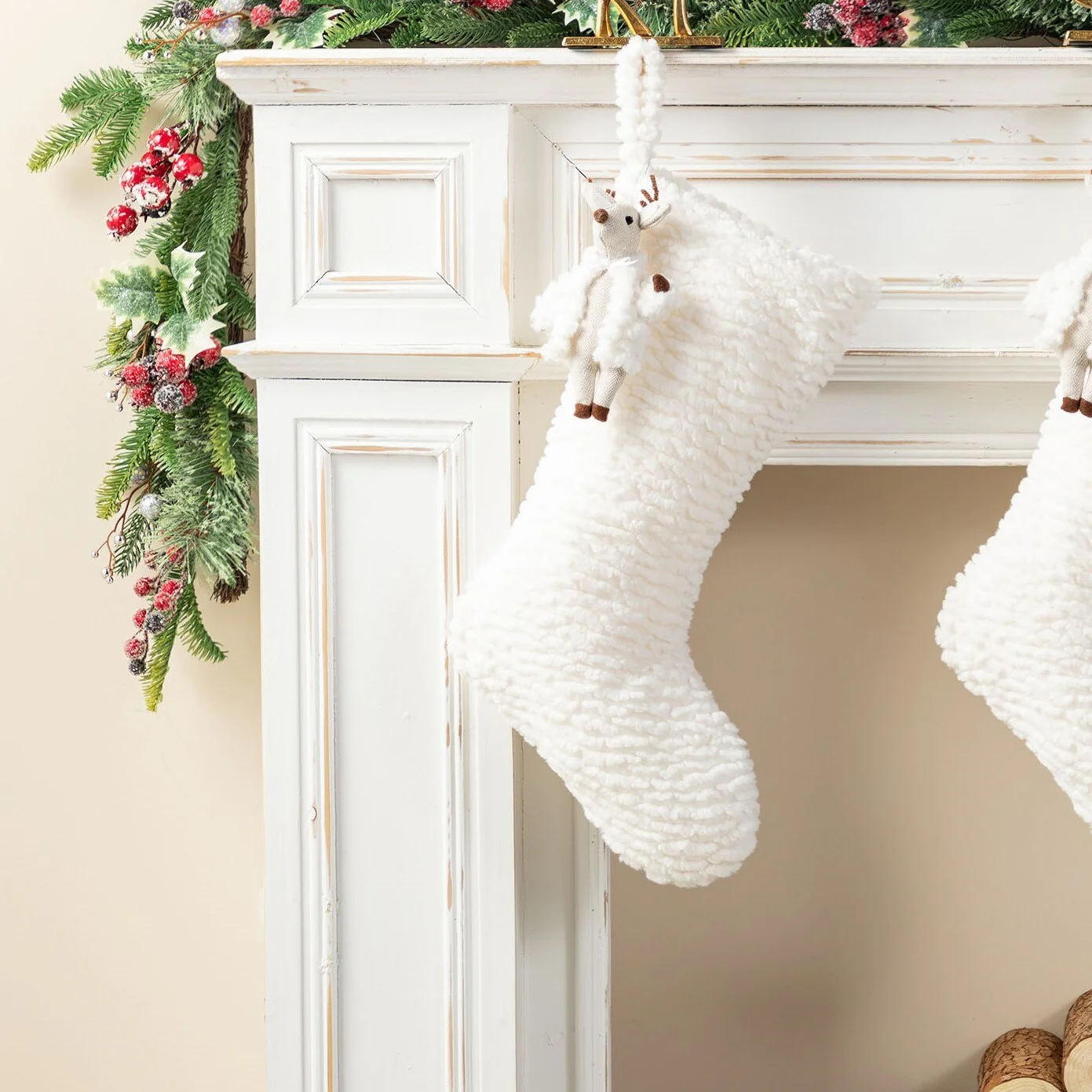 This 21"L White Plush Christmas Stocking offers a soft and luxurious look, made of a plush material with a textured surface, and comes with a complimentary small reindeer ornament attached to the stocking's hanging loop, adding a touch of charm and festivity to your Christmas decor.