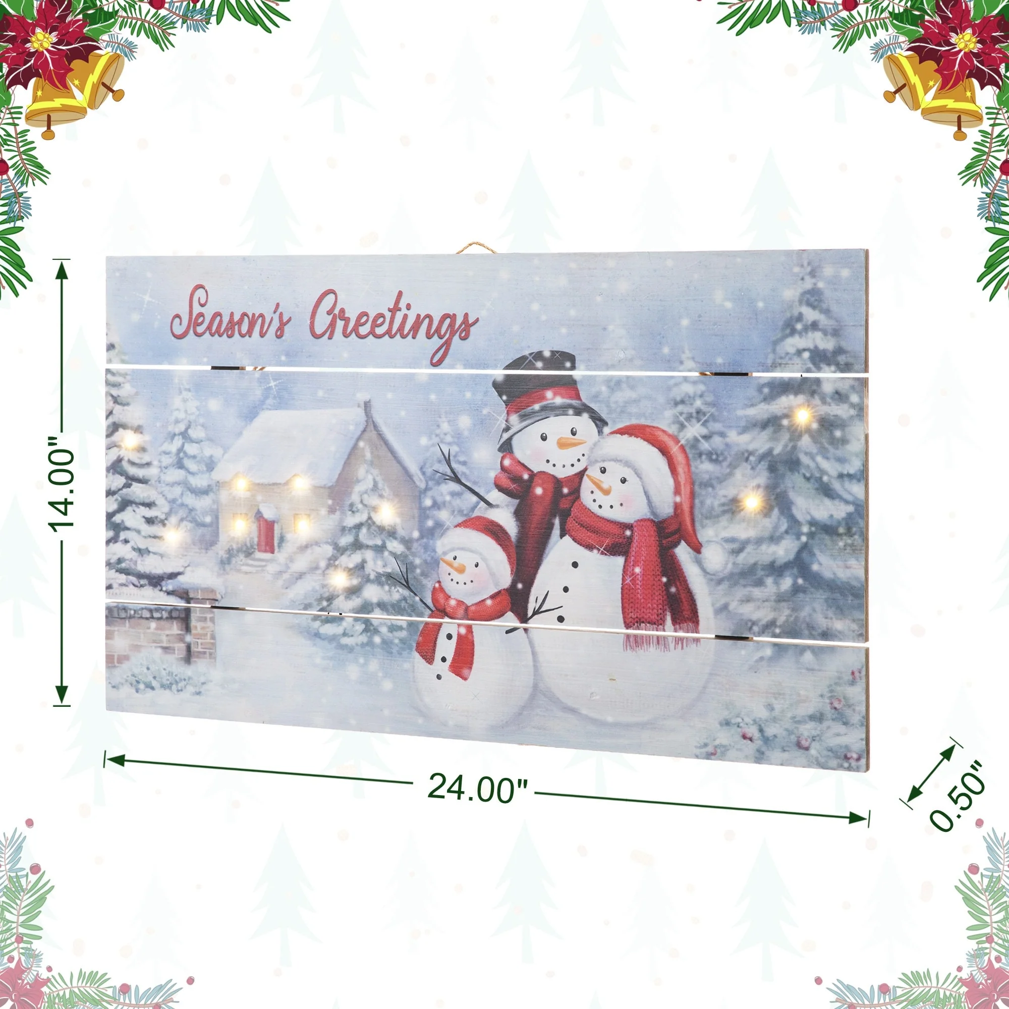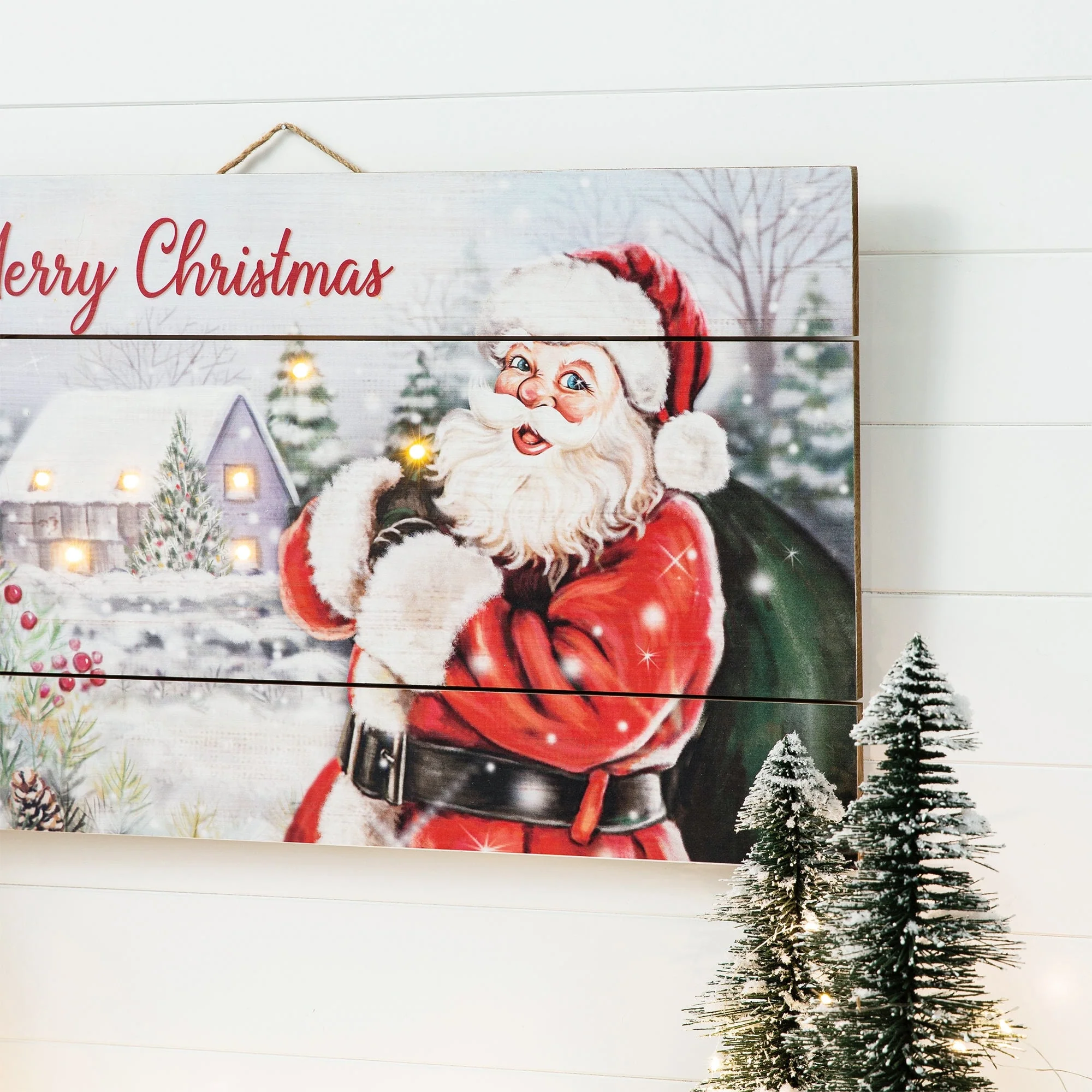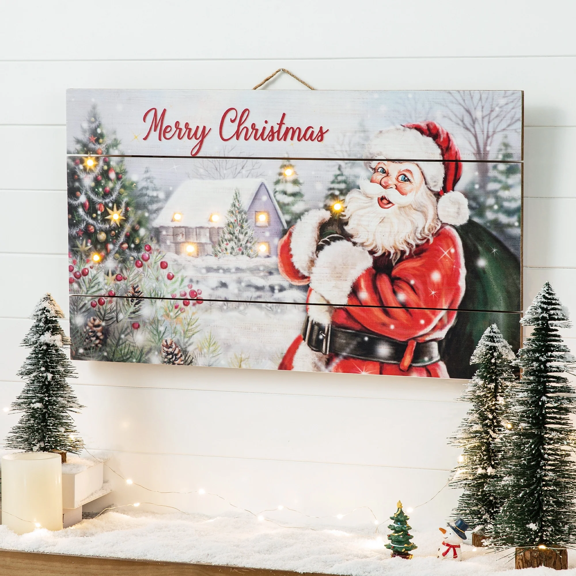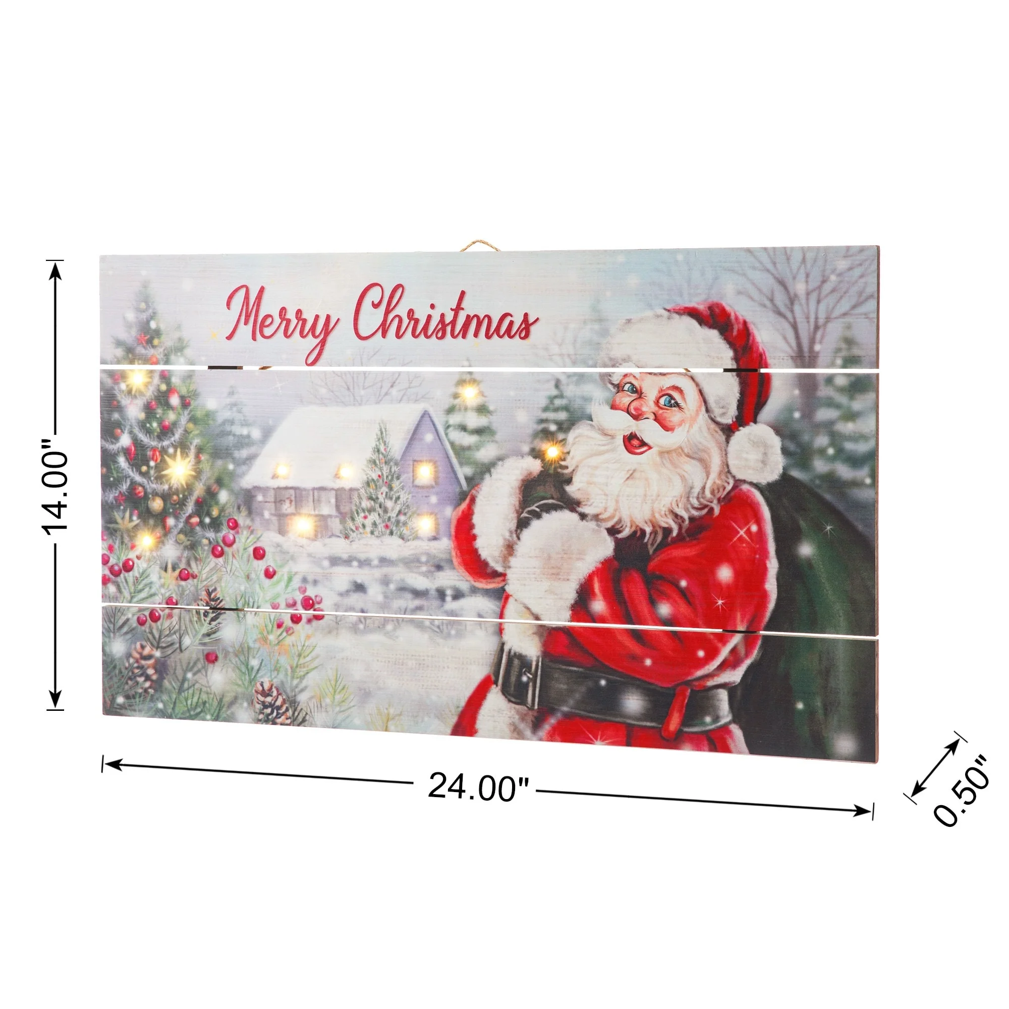 A delightful and festive addition to your holiday decorating, this wooden Santa Wall Decor features an old-fashioned Santa surrounded by snow-covered evergreens and a house. It reads, "Merry Christmas ", while 10 Snowflakes sparkle and shine warm white LED lights, bringing you a dense festival atmosphere.