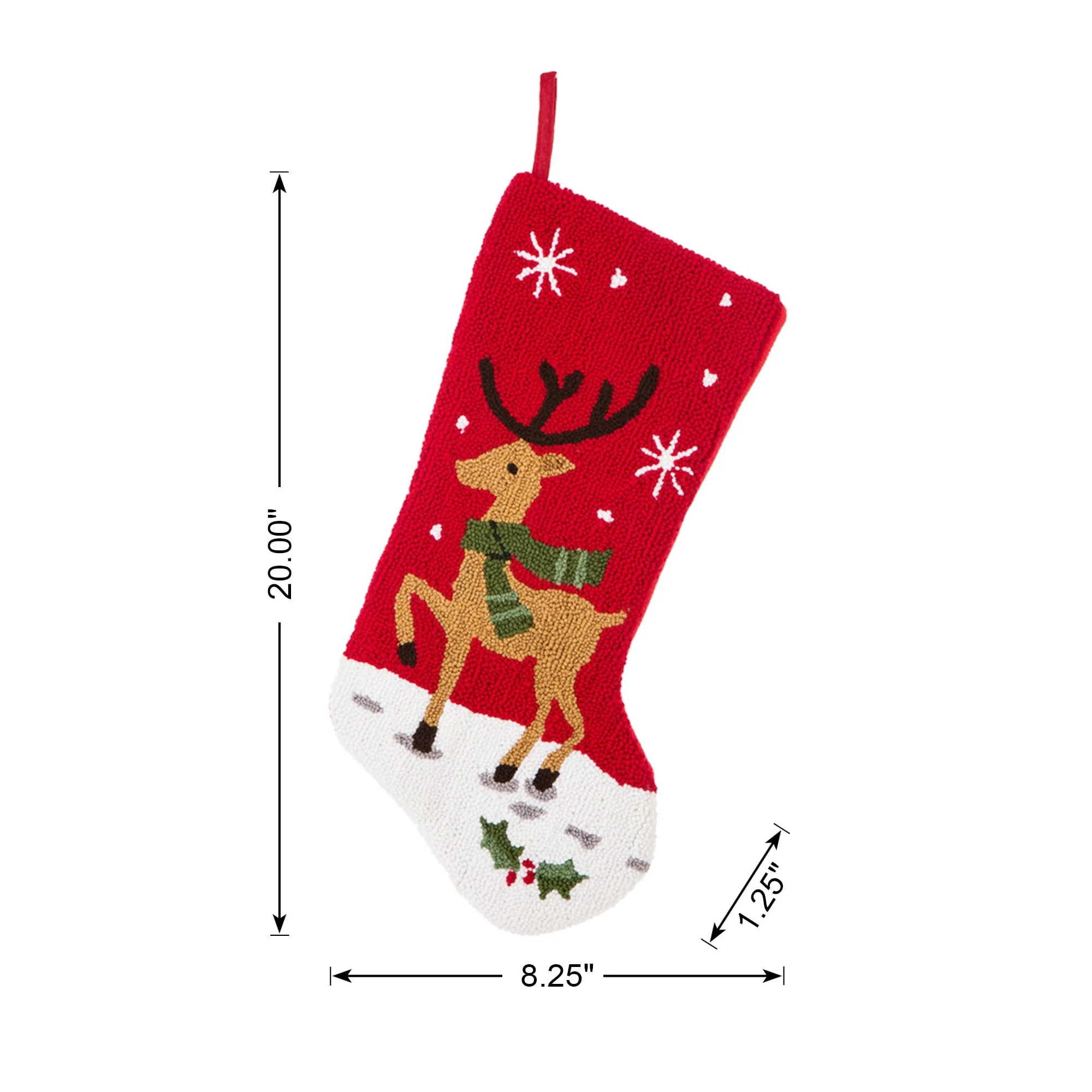 - Reindeer Stocking: 19.69 inches wide x 8.27 inches deep x 1.18 inches thick