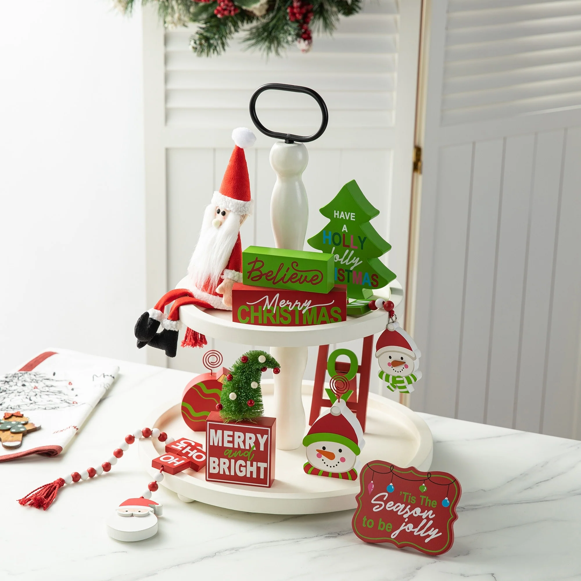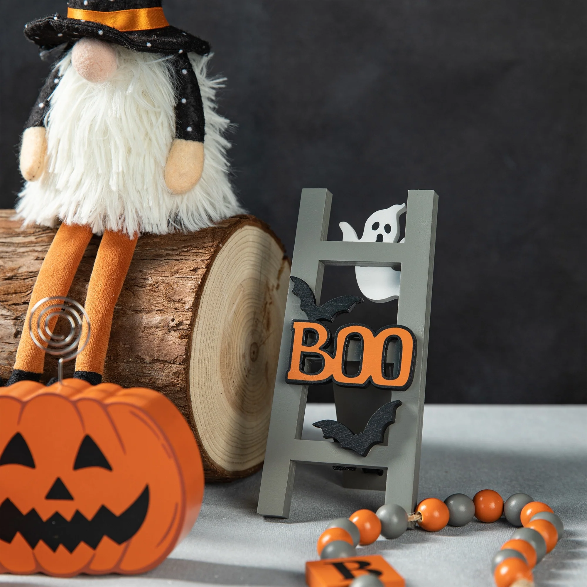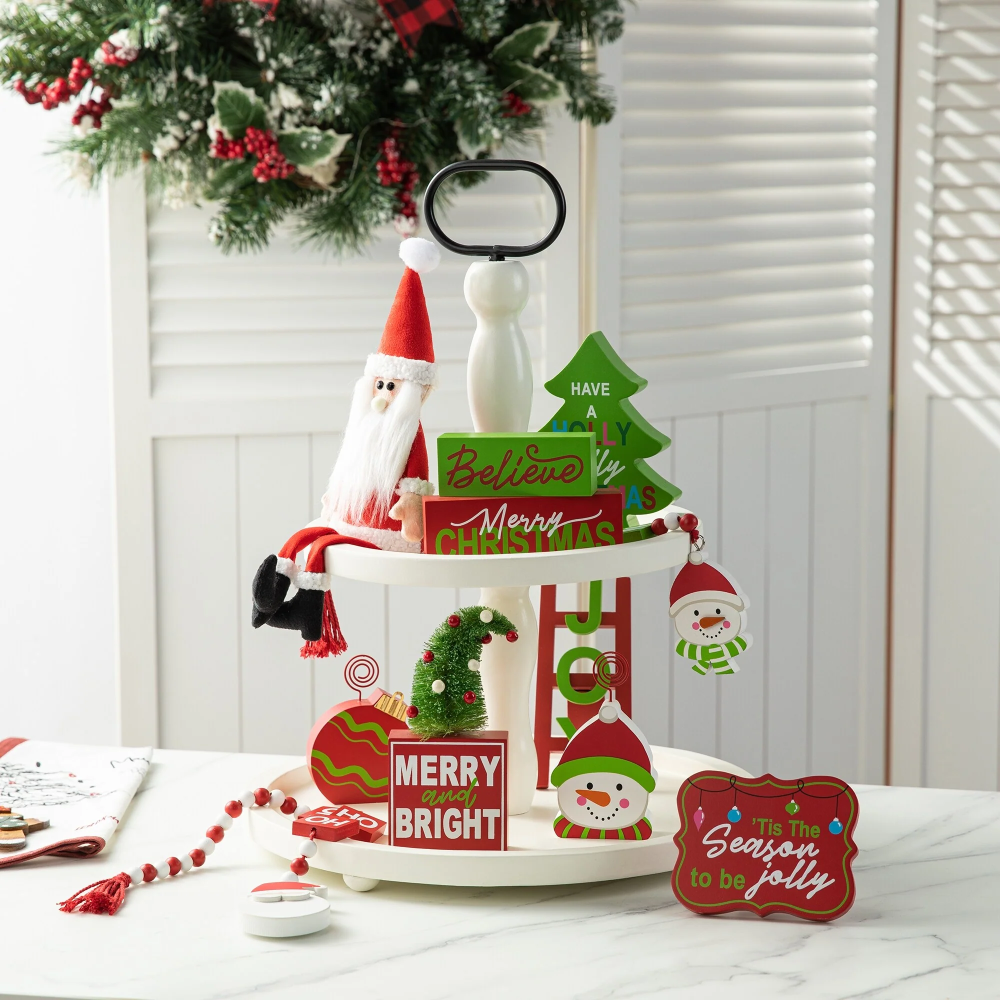 11 pieces Halloween/Christmas tiered tray decorations set is a perfect addition to your home decoration, which will bring a strong festival atmosphere to your home. You will get 1 x ladder, 7 x different wooden decor, 1 x fabric gnome and 2 x wood bead garlands.