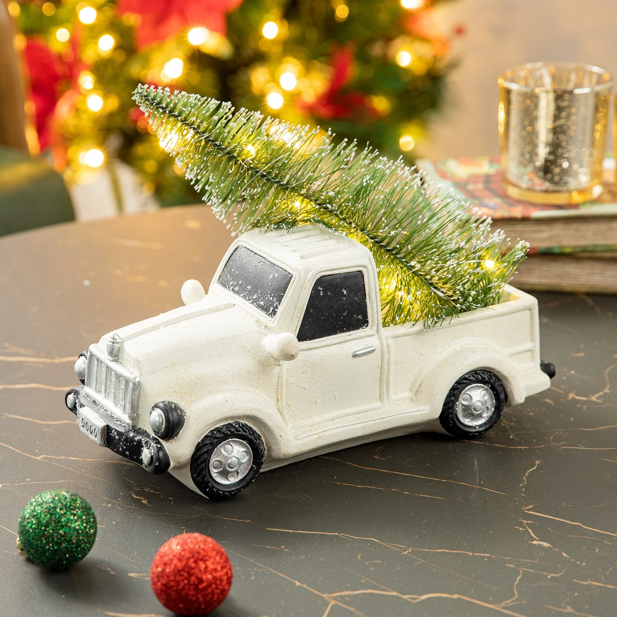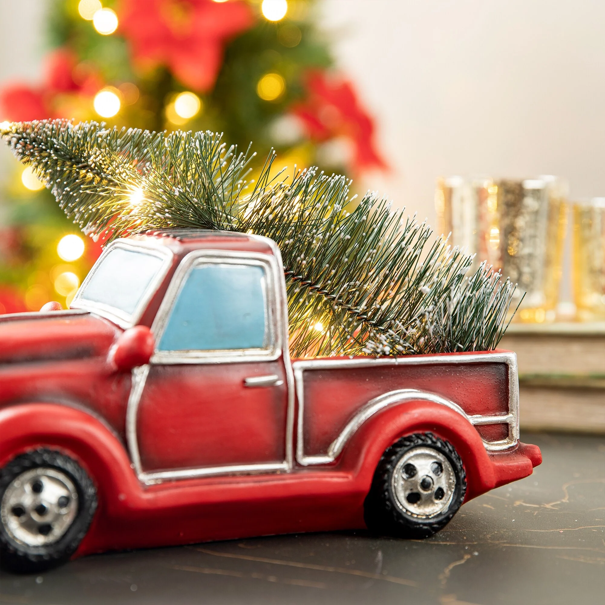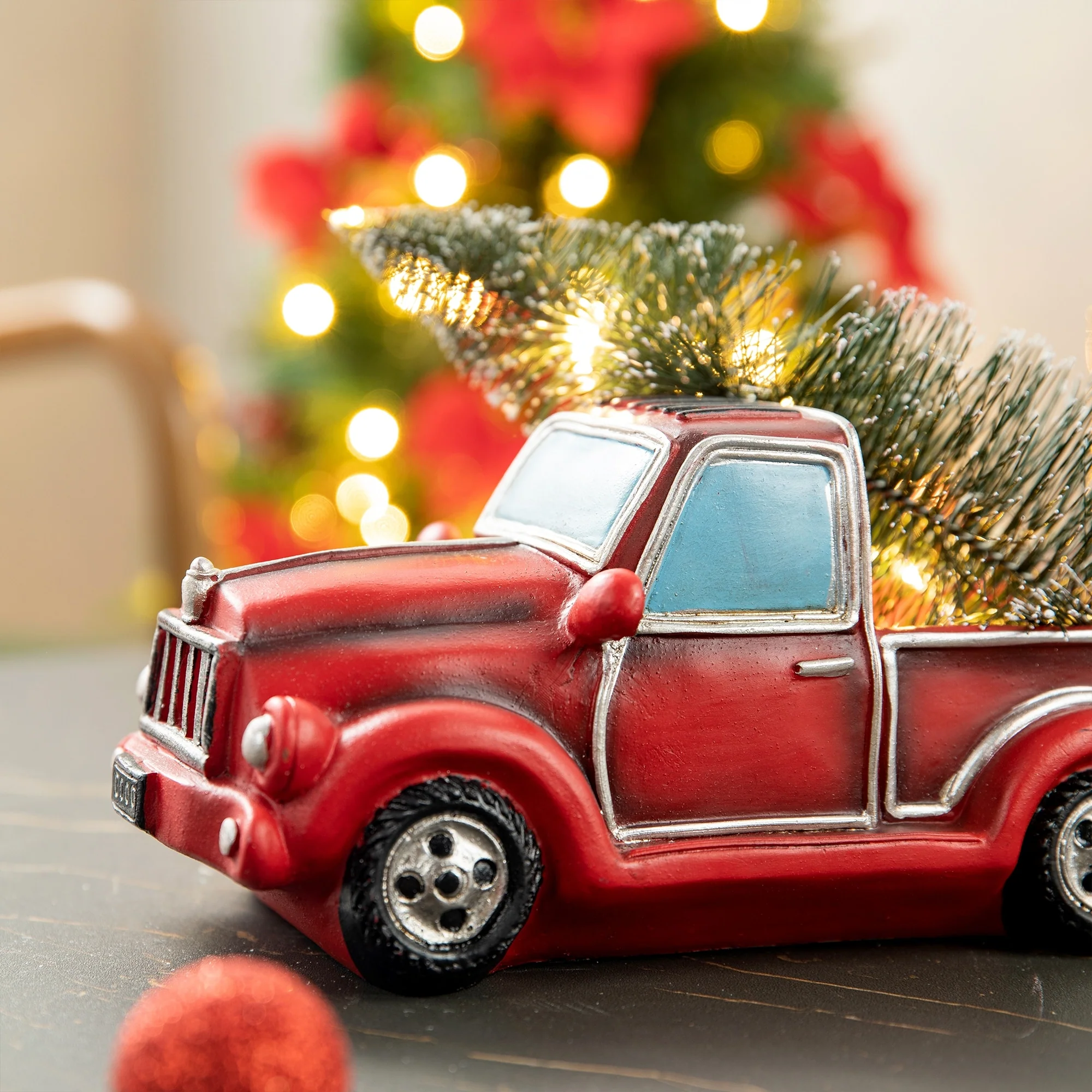 Hop on board for a ride through nostalgia with this classic red Chevy pickup truck decoration. The red pickup truck has been a long-standing Christmas tradition to remind folks of simpler times when grandpa would bring home a perfect tree for the holidays. The polyresin construction is painted bright red and the tree is lit with warm white lights for a touch of sweet and delightful charm.