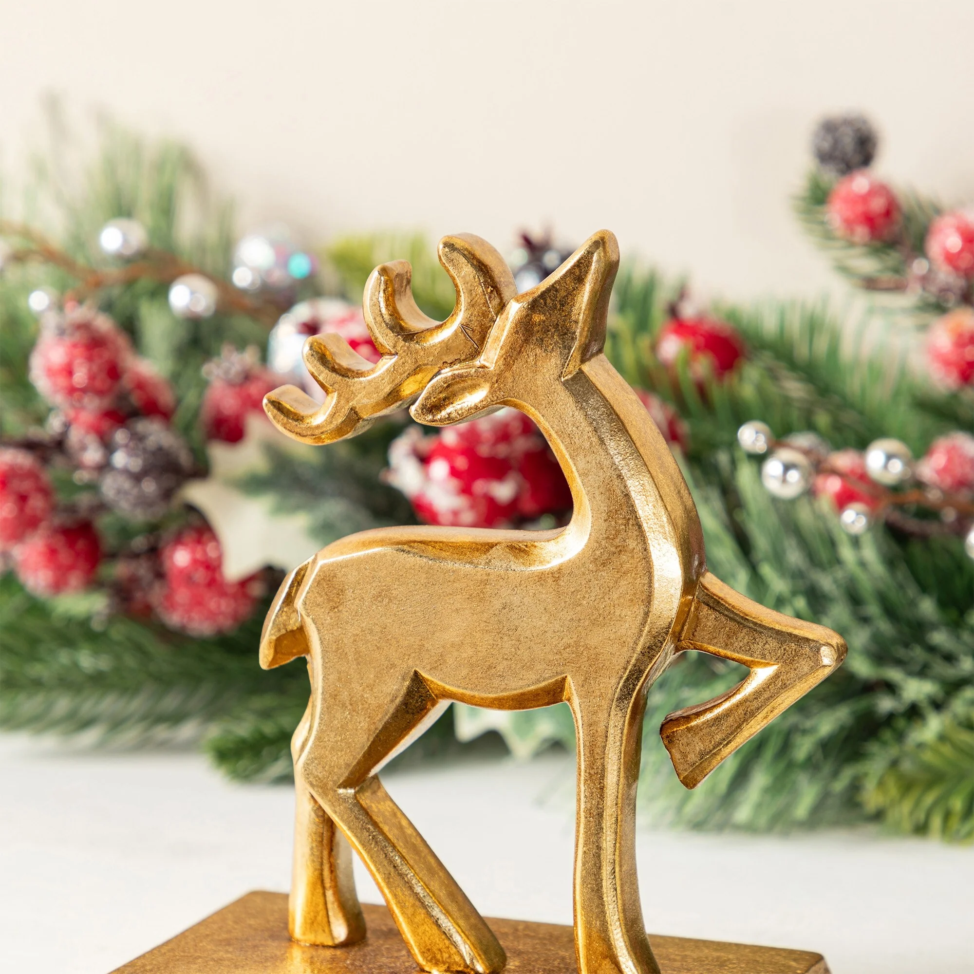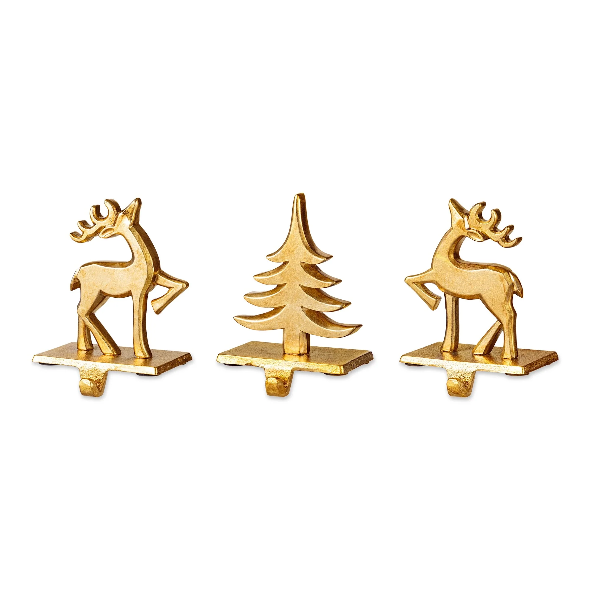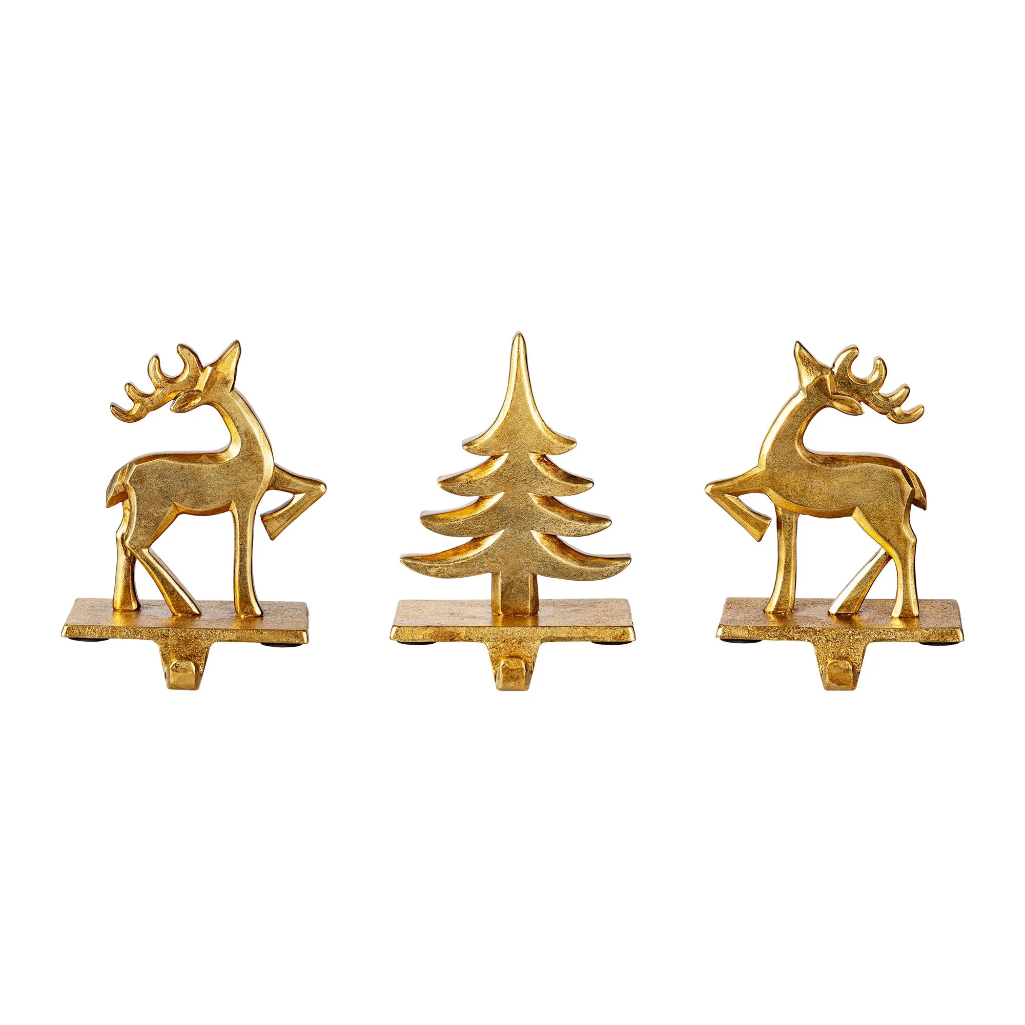 This Set of 3 Polyresin Christmas Tree and Deer Stocking Holders offer a charming and festive way to display your holiday stockings, featuring durable polyresin construction with a golden finish that beautifully complements any Christmas decor, including two deer and one tree-shaped holders that bring a touch of holiday cheer to your mantle or shelf.