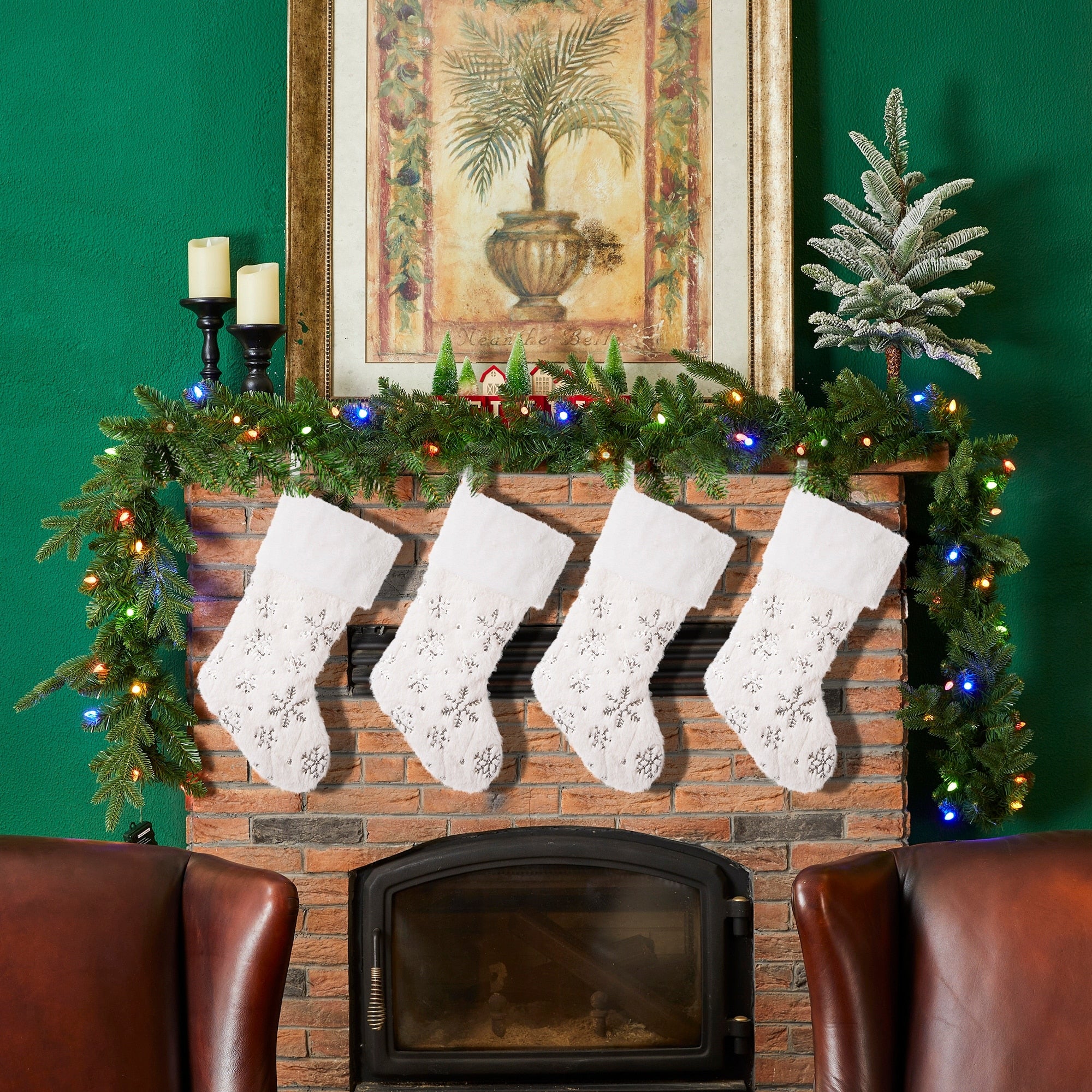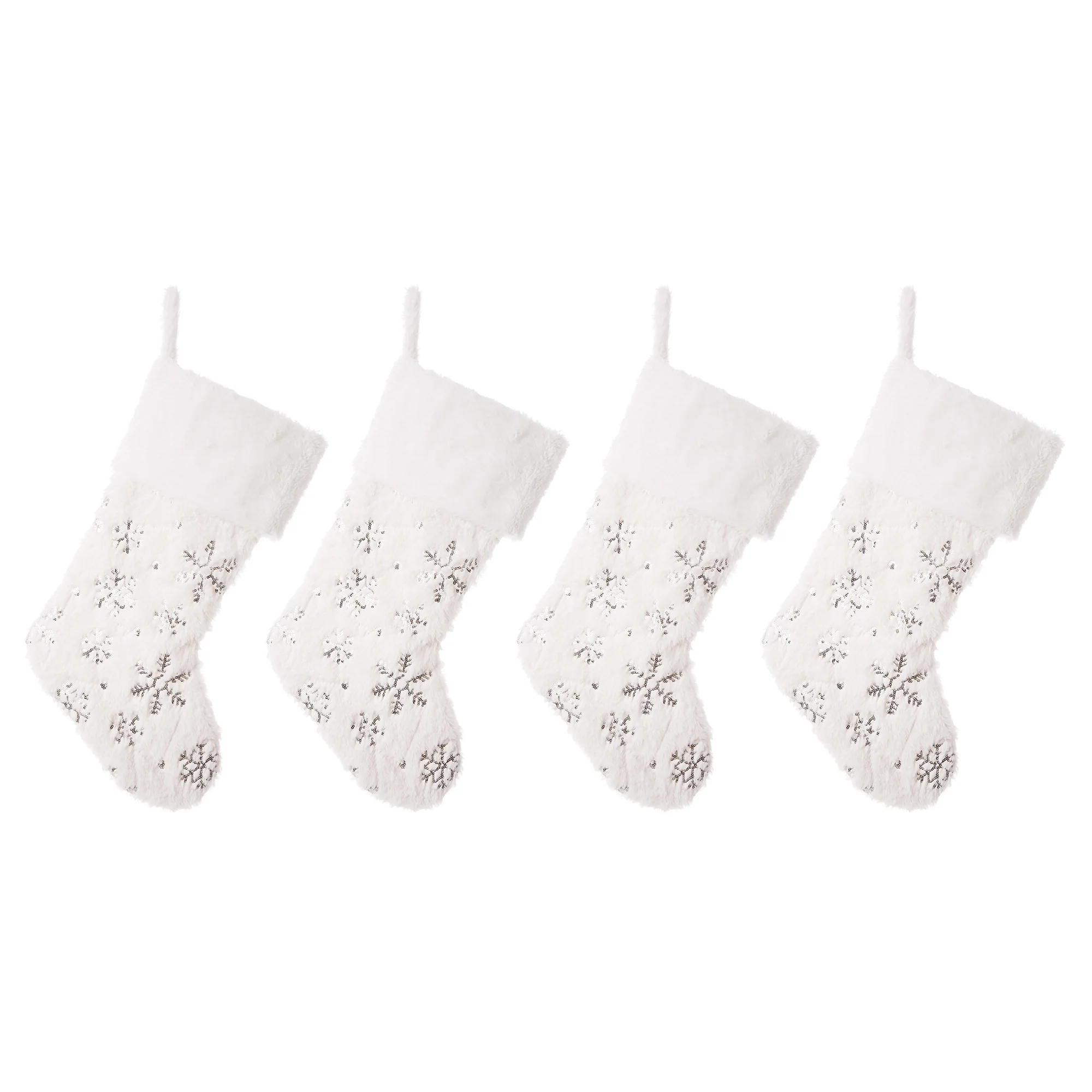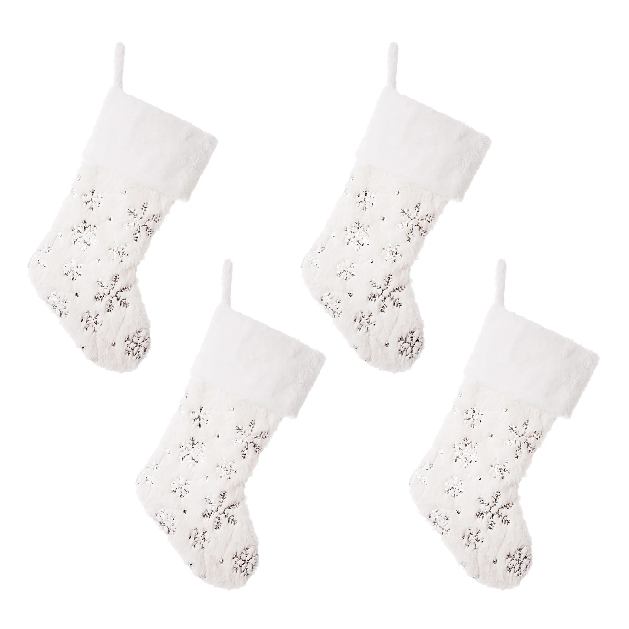 The solid white tone of this Super Soft Faux Fur Decorative Christmas Stocking complements any Christmas decor. Plush faux fur makes up the full stocking, not just the cuff. Elegant and plush white velvet with silver sequin and embroidery. Add a bright, cozy touch to your holiday décor with this white snowflake stocking set. Featuring a faux fur white trim, vivid embroidery snowflakes, and a lovely beaded design on an Ivory white plush velvet fabric. these beautiful stockings are sure to bring charm to your home. Loop hanger, Perfect for a seasonal gift or your holiday decor.