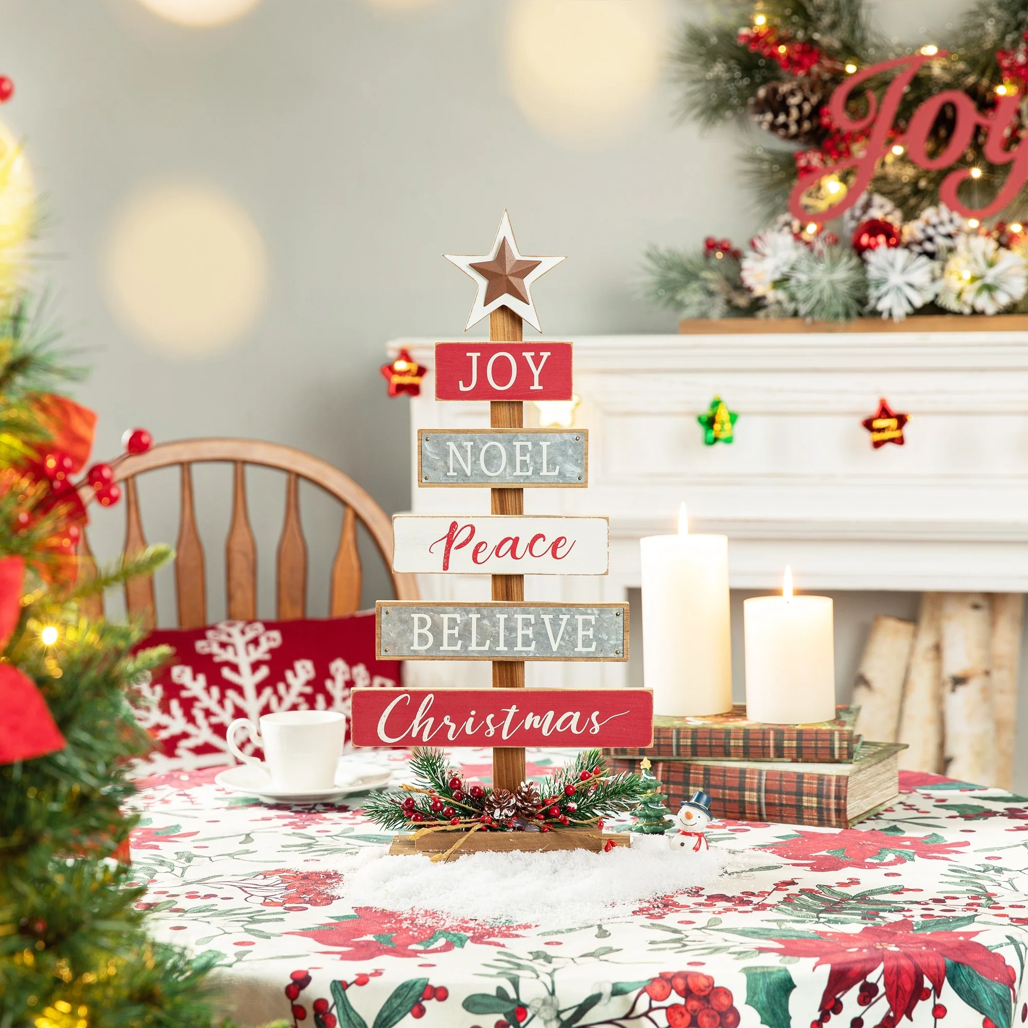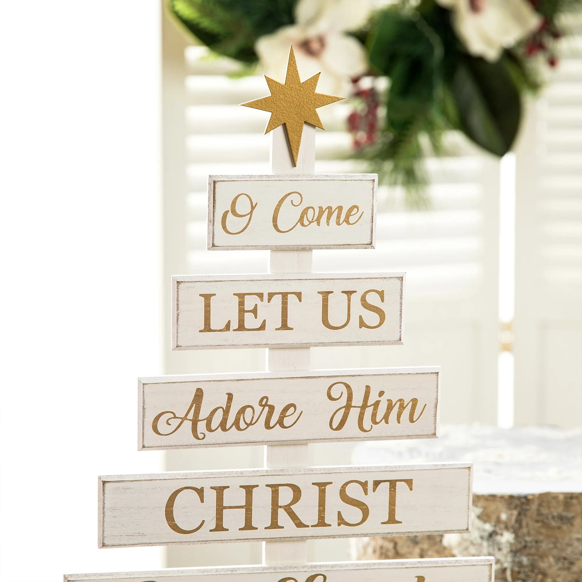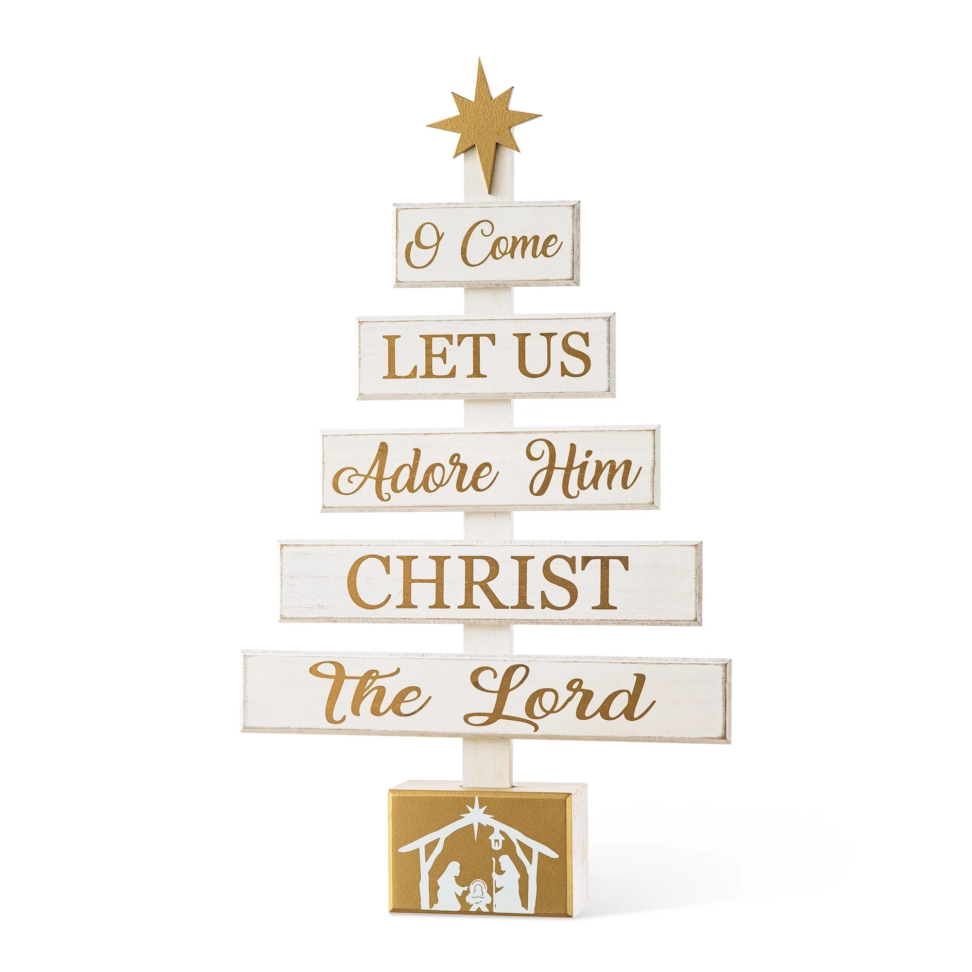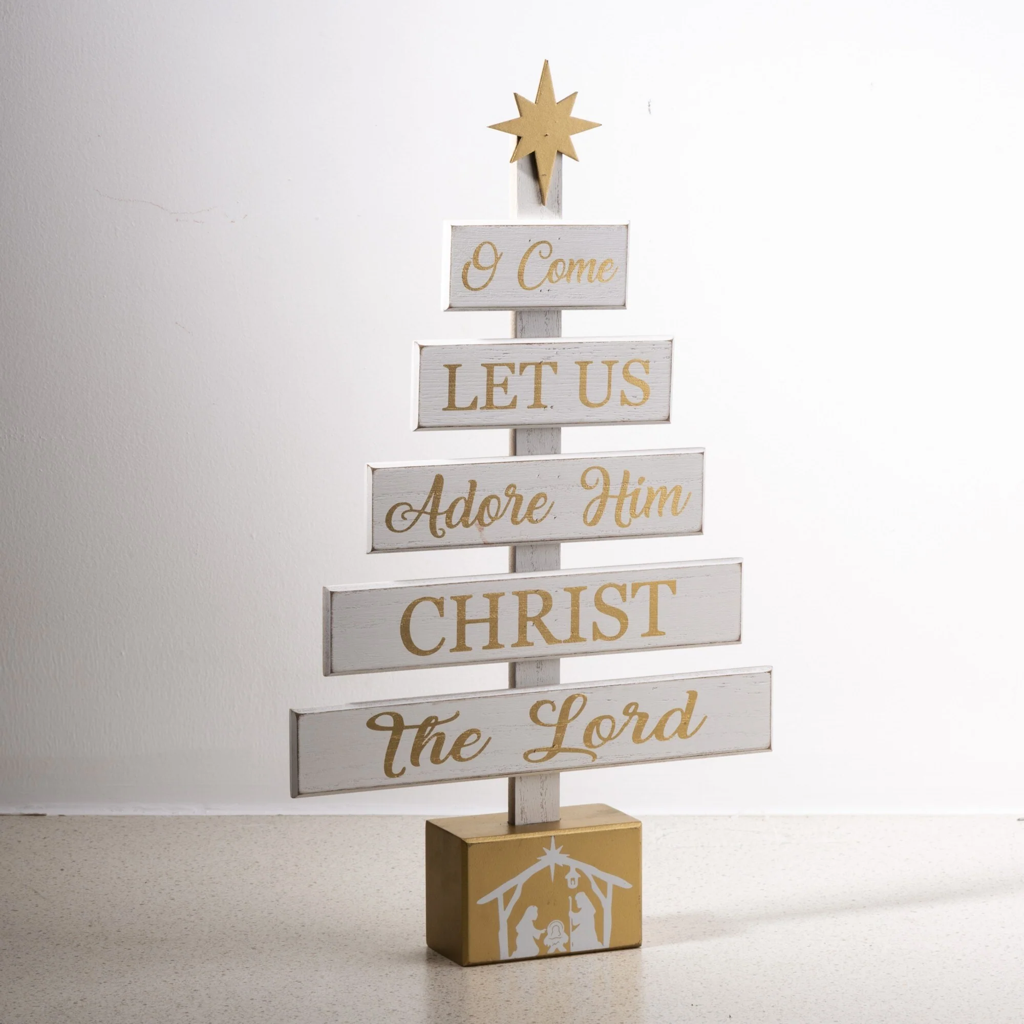 Start a journey through Christmas with a creative spirit this season! Nativity Wooden Table Tree boasts a tree shaped table piece, featuring a lovely nativity scene on the golden base and a golden star on the top, and the sentiments in the same color to coordinate base and star on the planks saying "O Come Let us adore him Christ the Lord". It's ready to sit on your table to not only adorn your home but give you and your guest a special nativity holiday. The Wooden Sign Table Tree boasts a tree shaped table piece, features 6 signs with a star tree topper and painted in different color. Mounted on a wooden base, this decoration will make a special impression on your family and friends.
