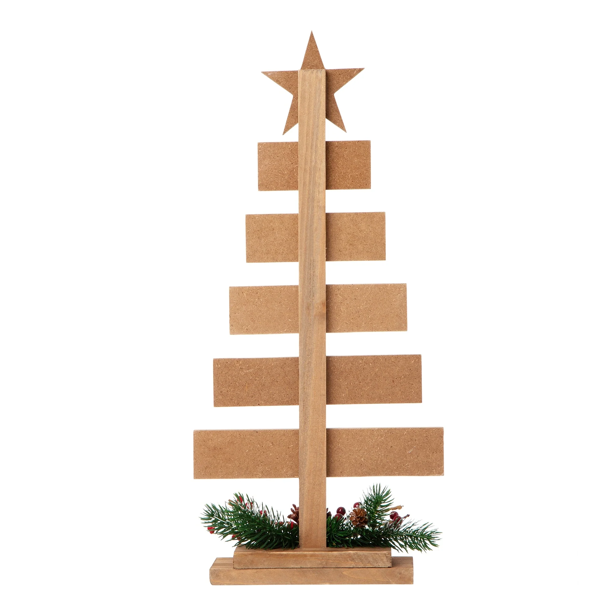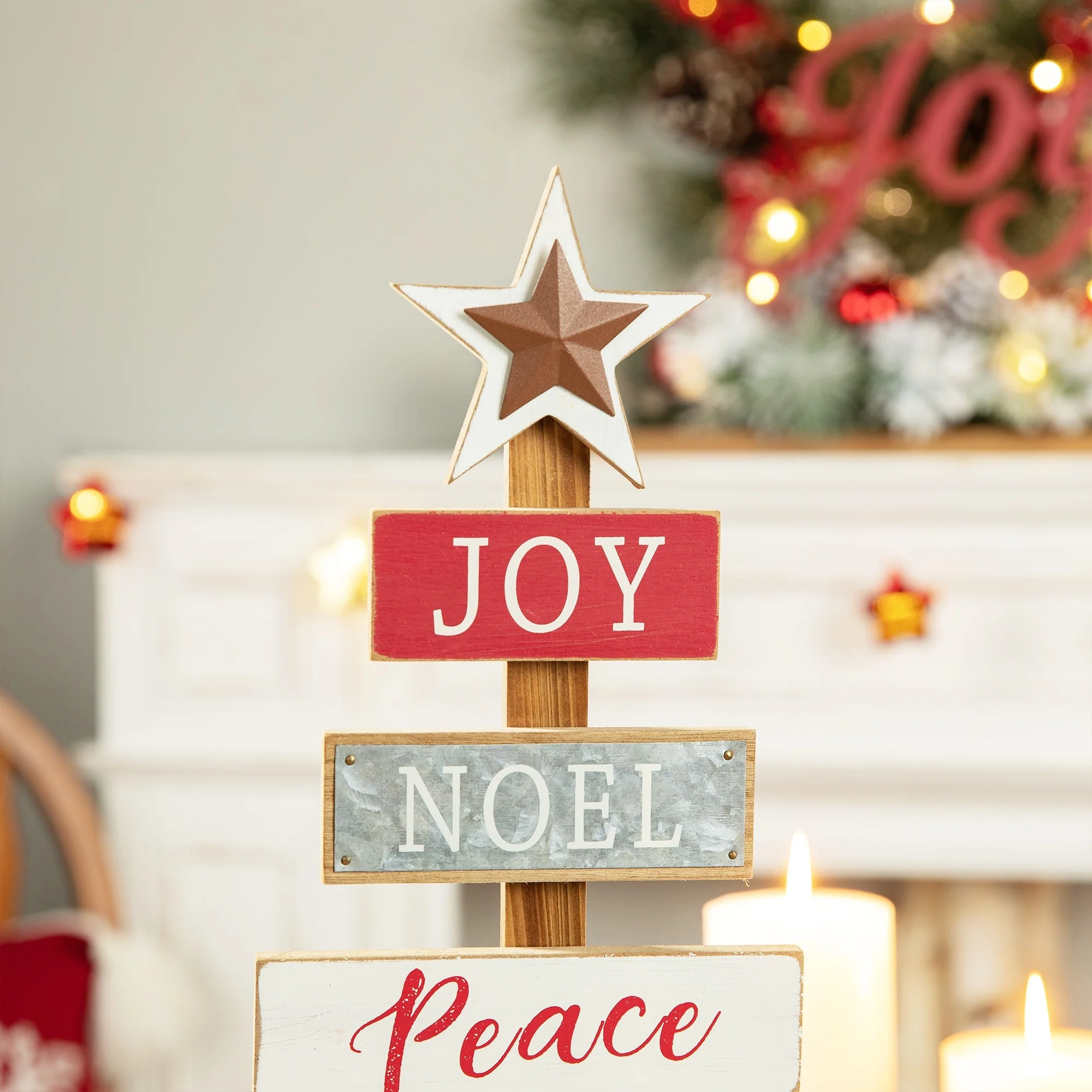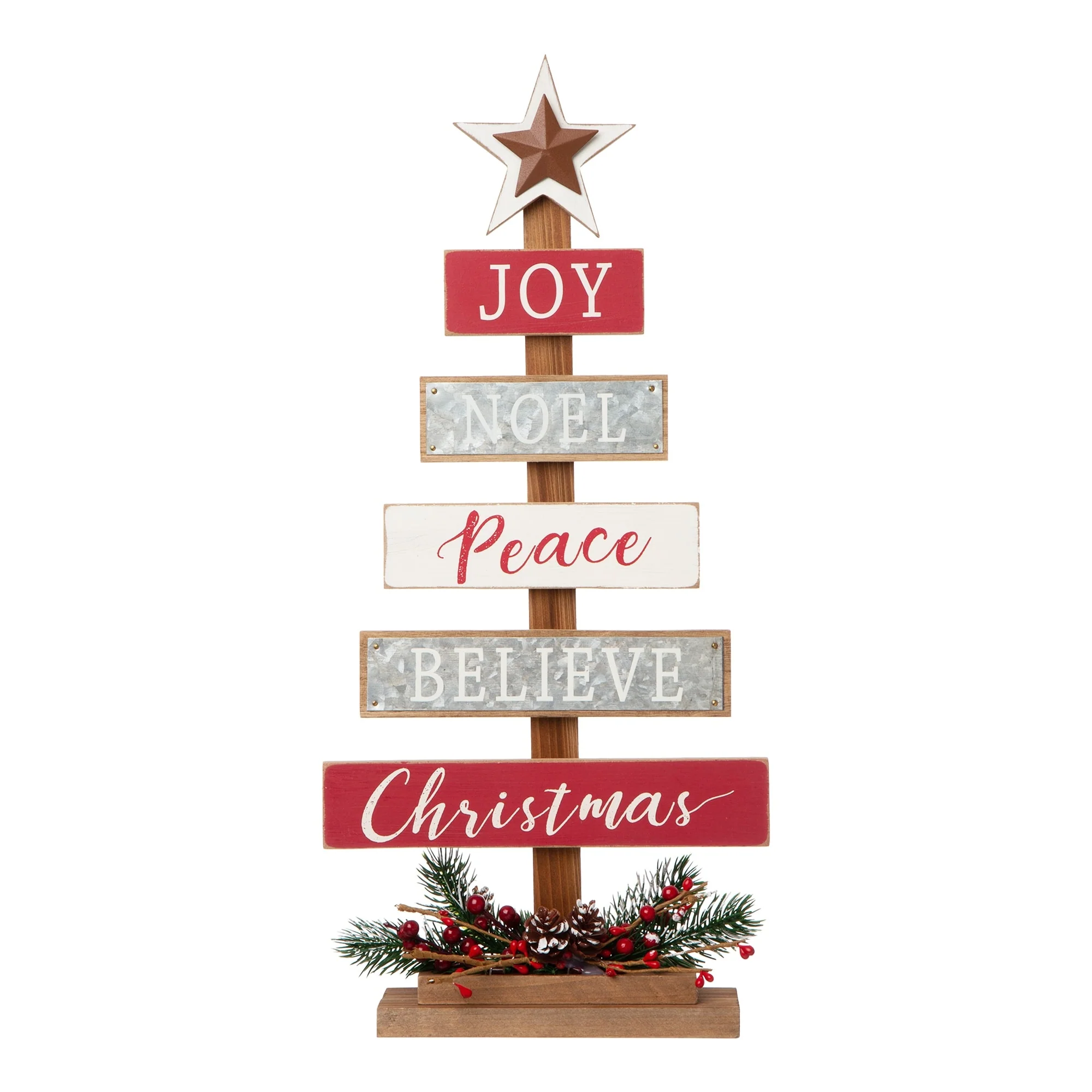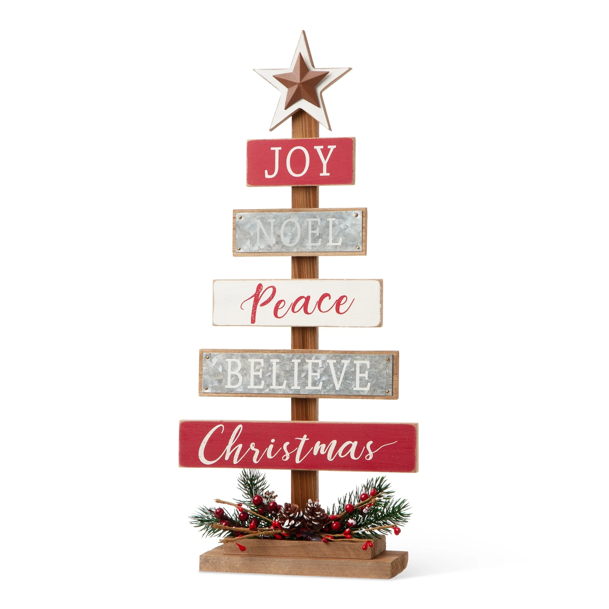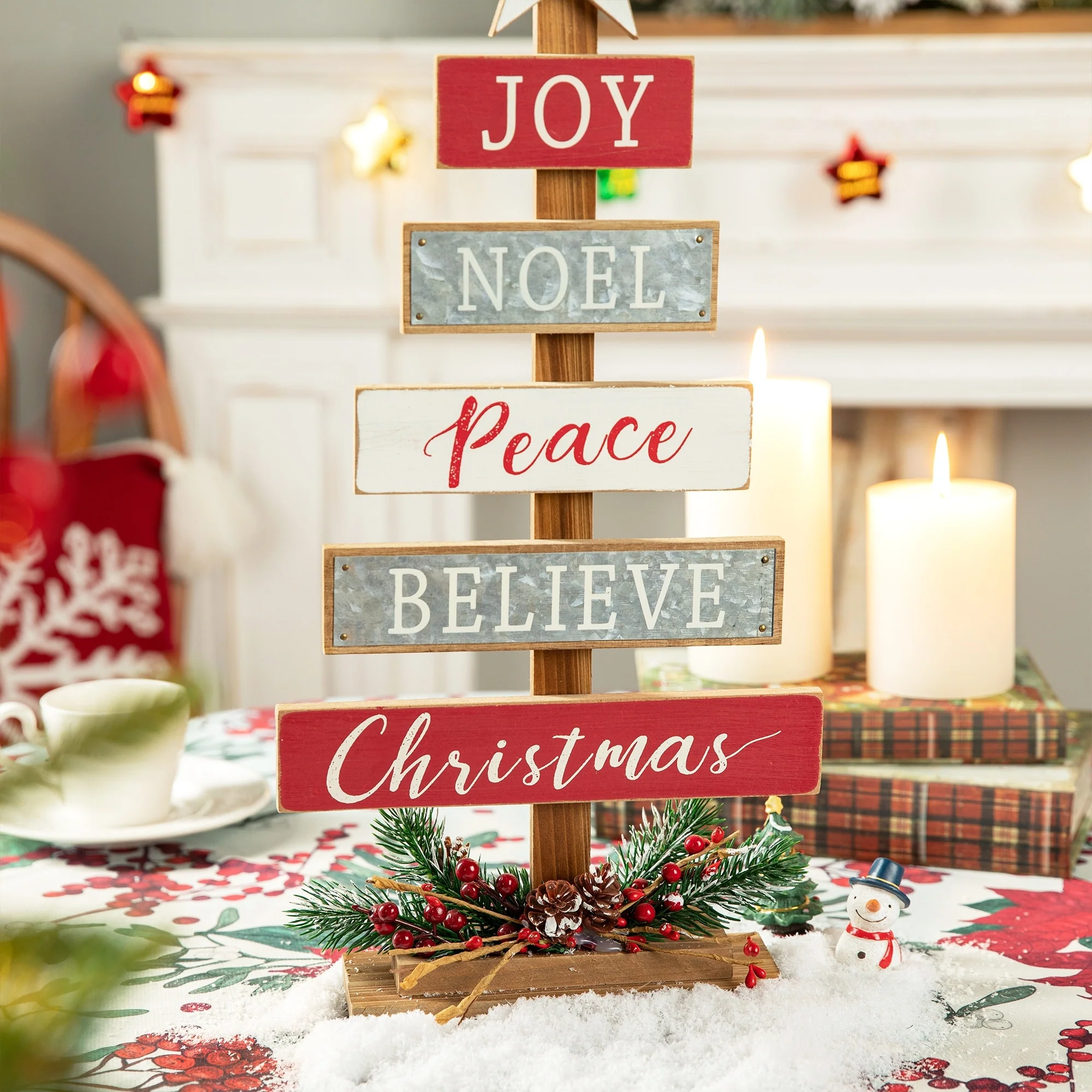Start a journey through Christmas with a creative spirit this season! Nativity Wooden Table Tree boasts a tree shaped table piece, featuring a lovely nativity scene on the golden base and a golden star on the top, and the sentiments in the same color to coordinate base and star on the planks saying "O Come Let us adore him Christ the Lord". It's ready to sit on your table to not only adorn your home but give you and your guest a special nativity holiday. The Wooden Sign Table Tree boasts a tree shaped table piece, features 6 signs with a star tree topper and painted in different color. Mounted on a wooden base, this decoration will make a special impression on your family and friends.