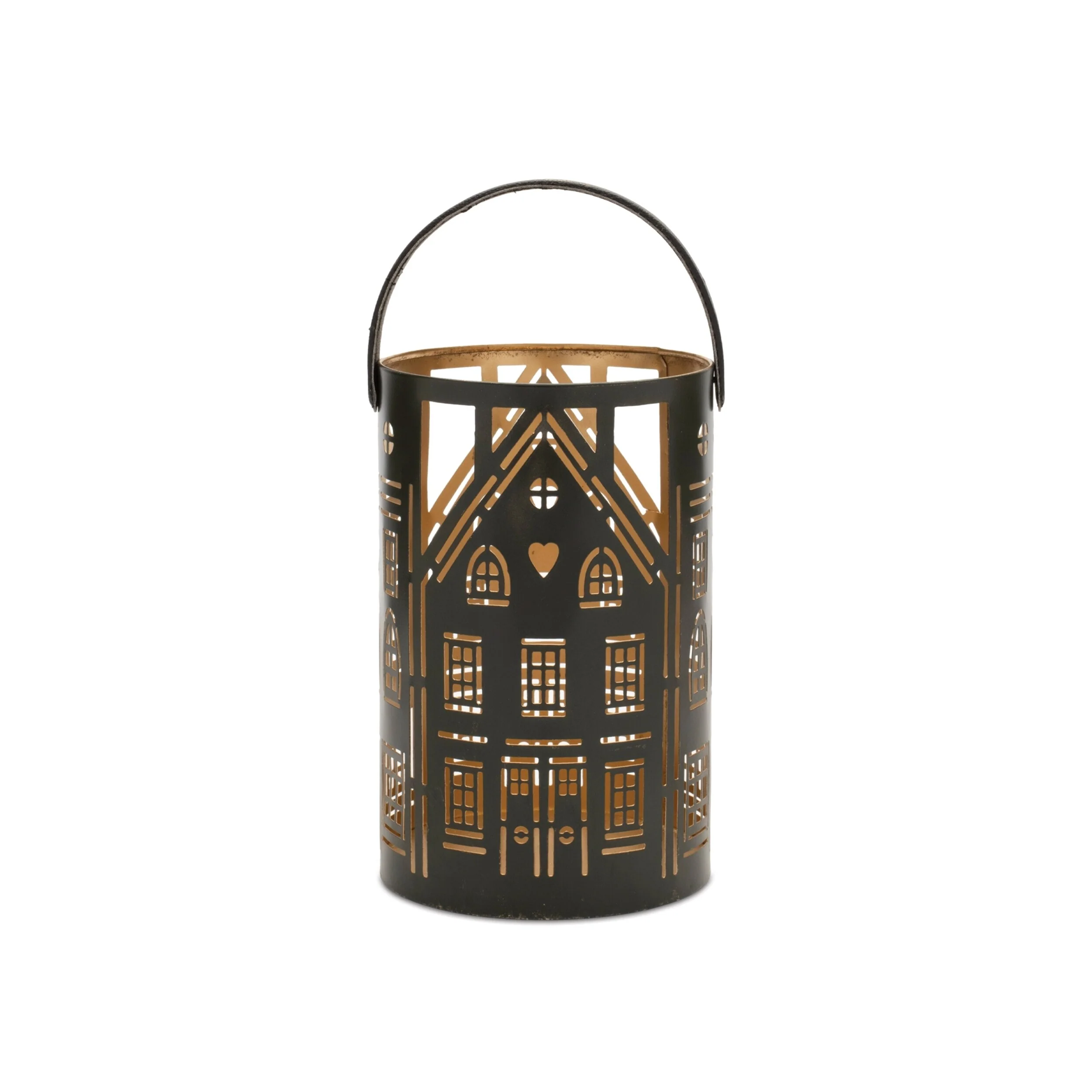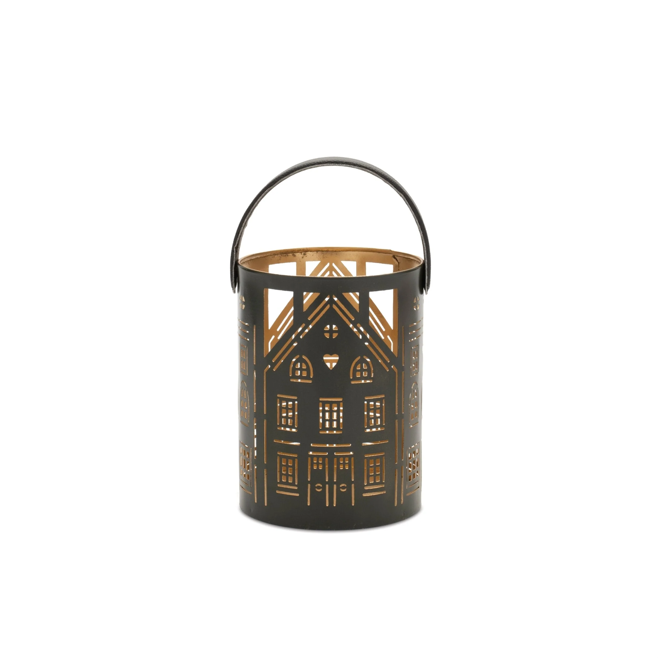 Elevate your holiday decor with this charming set of three punched metal house lanterns. Crafted from sturdy iron in stylish black and gold tones, each lantern features a cozy house silhouette with intricate cutouts that beautifully glow when lit from within. The rustic leather handles add a warm, natural touch, while the assorted sizes create a dynamic, layered look. Designed to hold 4" pillar candles, these lanterns bring a festive and stylish glow to mantels, entryways, or tabletops during the Christmas season and beyond.