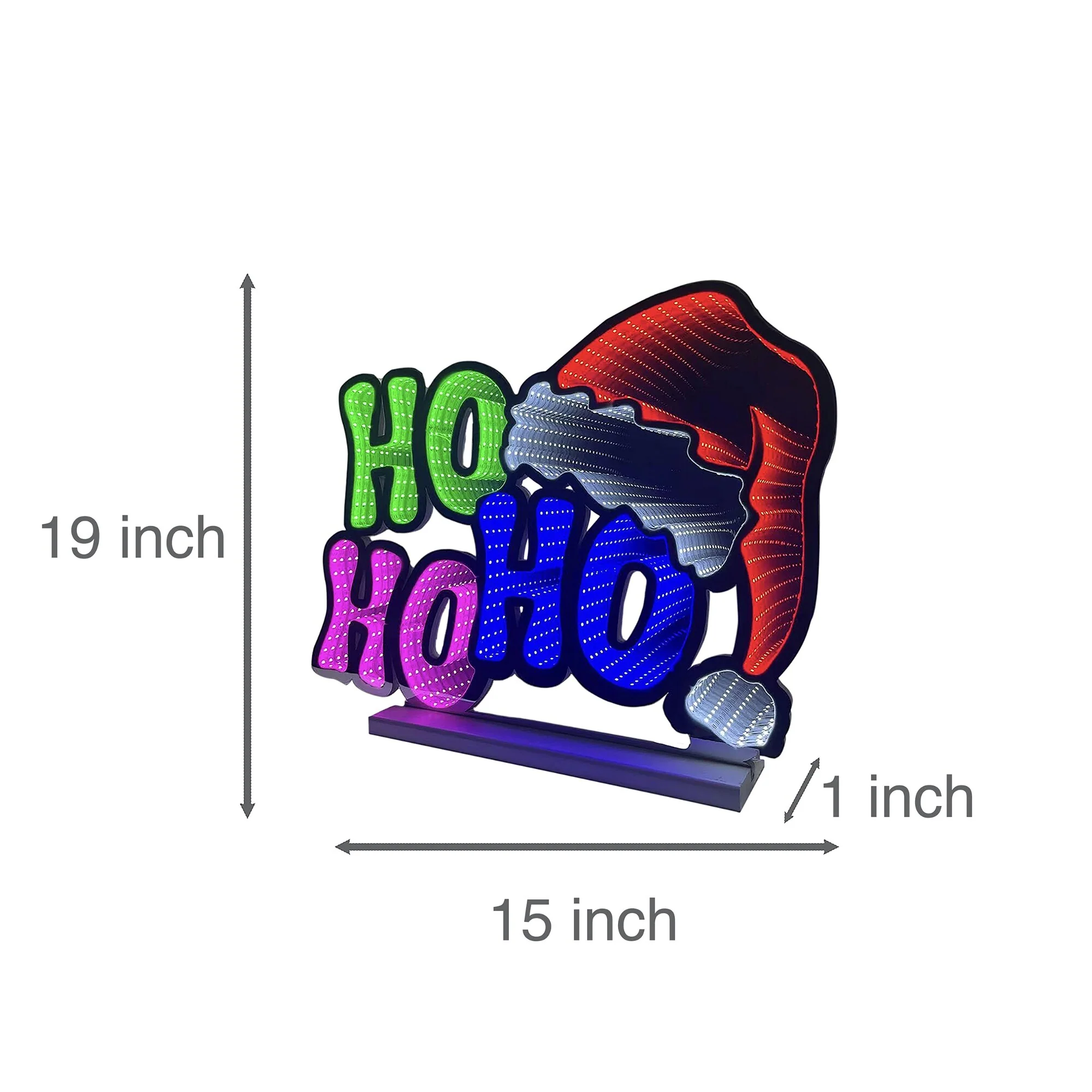 Spread the holiday cheer with this Christmas 'Ho Ho Ho' infinity mirror light display! Featuring vibrant LED lights in green, pink, and blue, this festive decoration creates a mesmerizing ambiance. Accented with a playful Santa hat, it's the perfect centerpiece for your table, countertop, or any indoor display, adding merriment to your seasonal decor.