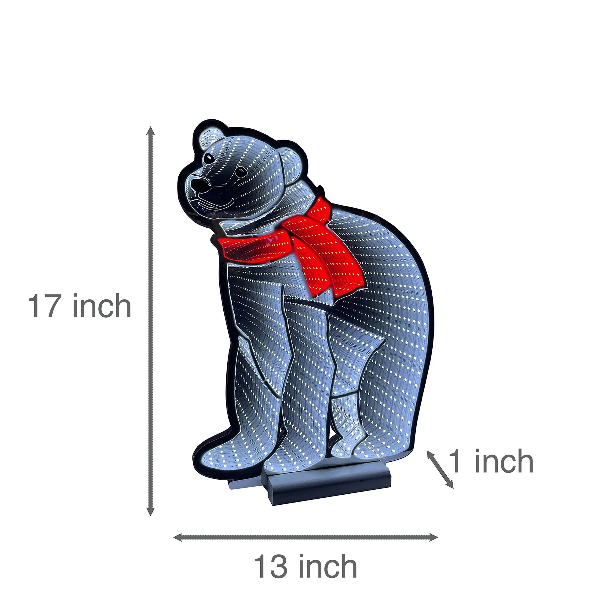 Bring festive cheer to your home with this charming LED-lighted Polar Bear infinity mirror. Featuring a glowing winter-white LED body and an adorable bright red scarf, this sitting polar bear adds irresistible charm to your holiday decor. Perfect for indoor displays on tables, countertops, or in cozy corners, with exceptional stability and style. This delightful decoration is a must-have for your winter collection.