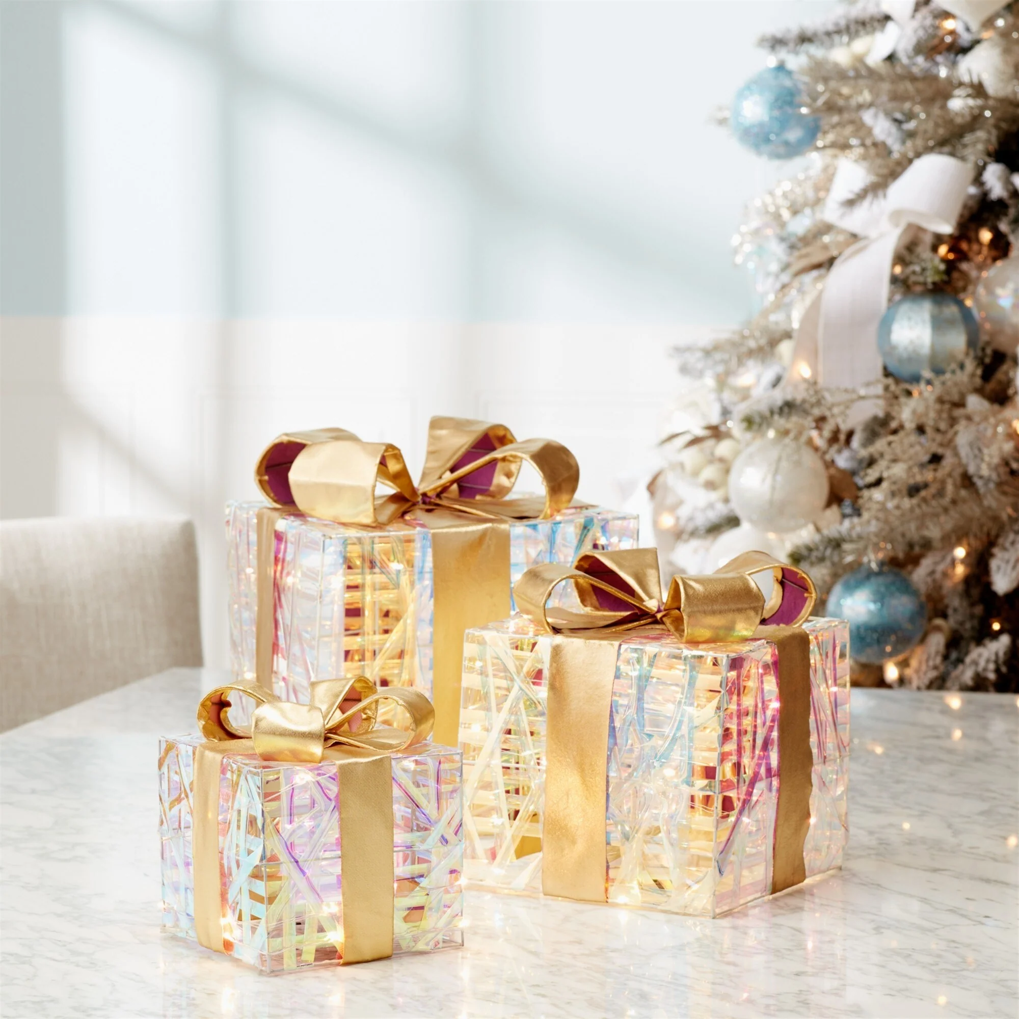 Add a touch of holiday elegance to your seasonal decor with these LED woven presents with bows. Featuring a festive gold tone with a chic iridescent finish, these beautifully crafted packages have a unique woven design wrapped with an elegant bow. The built-in LED lights create a warm, inviting glow, making them the perfect statement piece for your entryway, near your Christmas tree, or beside your fireplace.