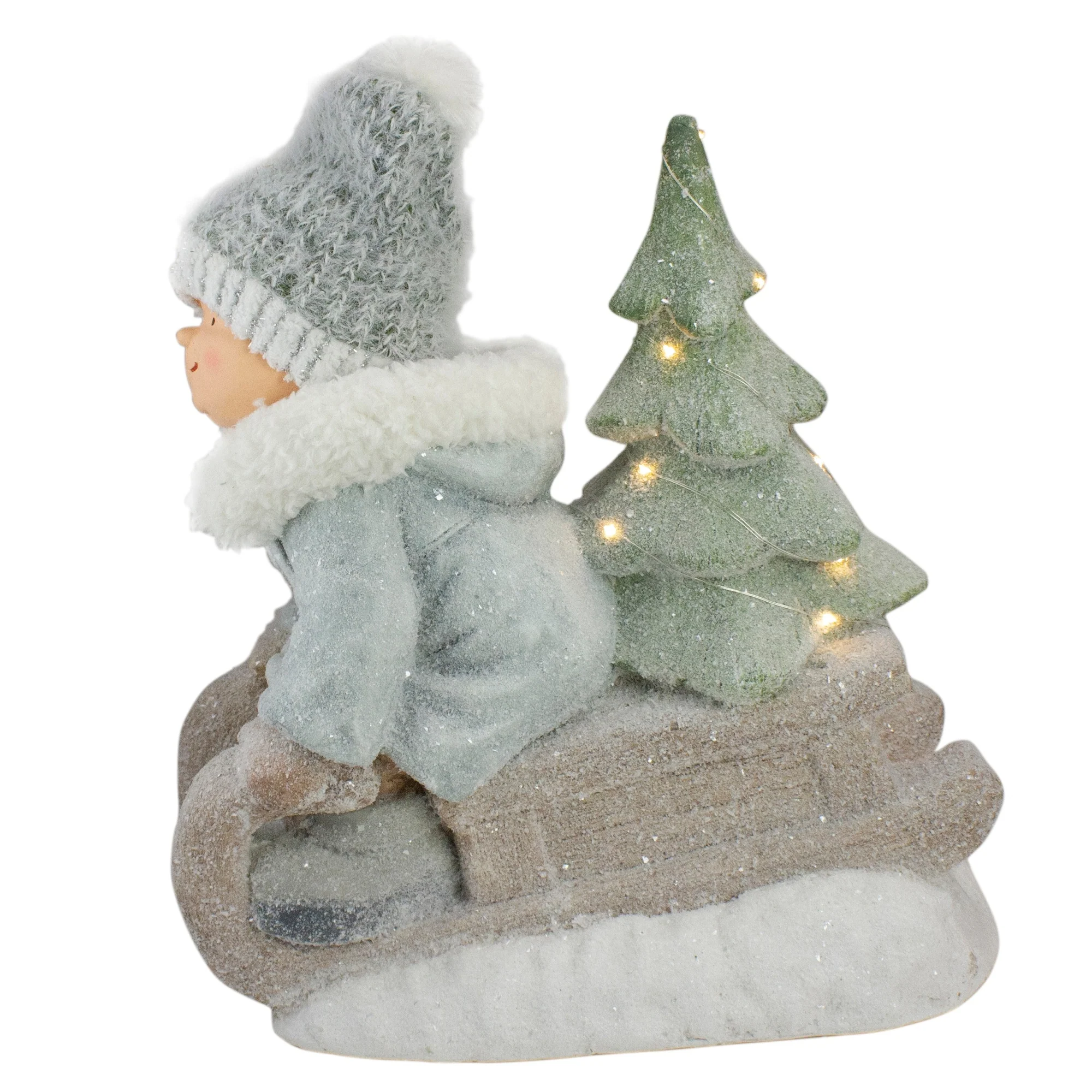 This adorable boy on a sled decoration would be the perfect addition to your Christmas decor this year! Racing home with the Christmas tree on his sled, he is happy to join in your festivities. Perfect to place on any tabletop in your home or in a display in your retail store.