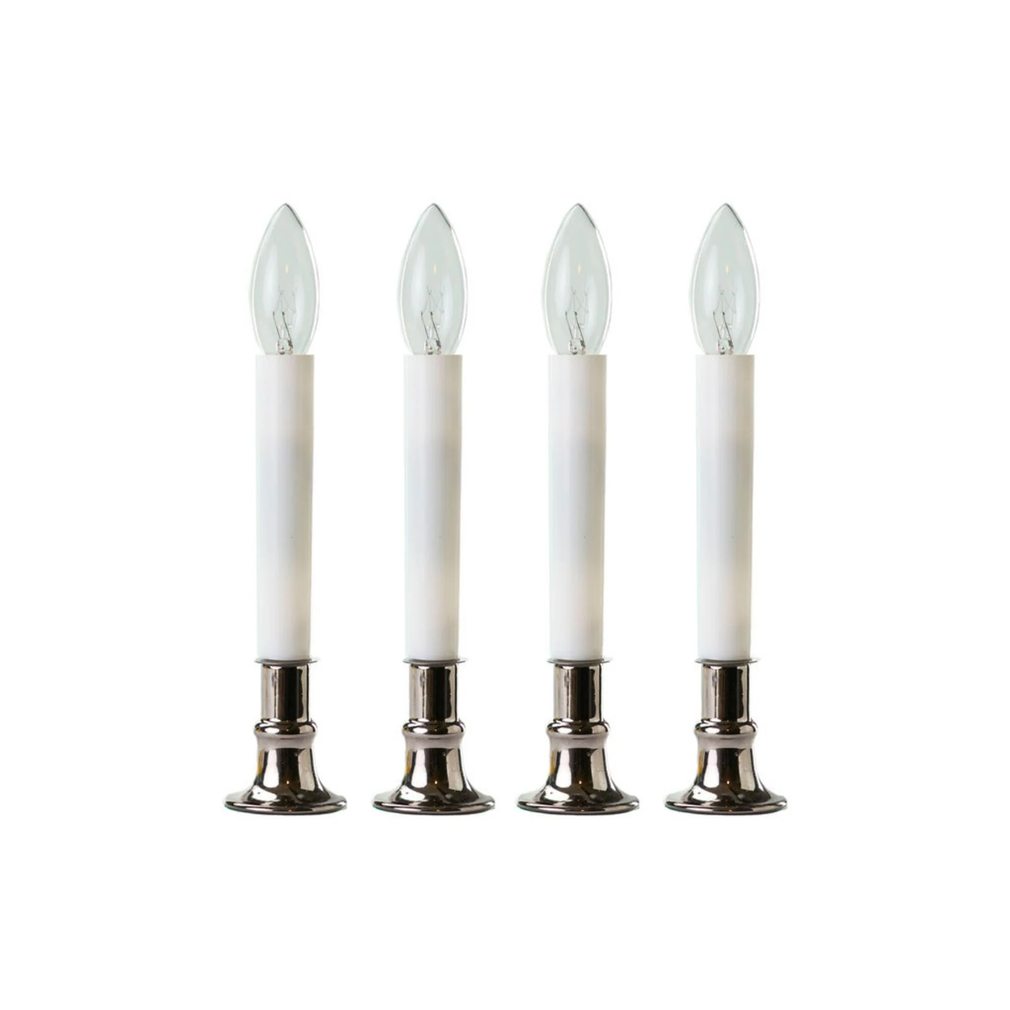 Add a warm and festive glow to your holiday décor with this set of Christmas window candles. Each window candle features a classic white design with a weighted dark pewter base topped with a clear incandescent C7 bulb that emits a gentle, inviting light. The built-in automatic sensor ensures convenience, creating a hassle-free ambiance. Perfect for window sills, mantels, or any indoor space, these UL-certified Christmas candles offer the timeless charm of traditional candles without the risks of open flames or dripping wax.