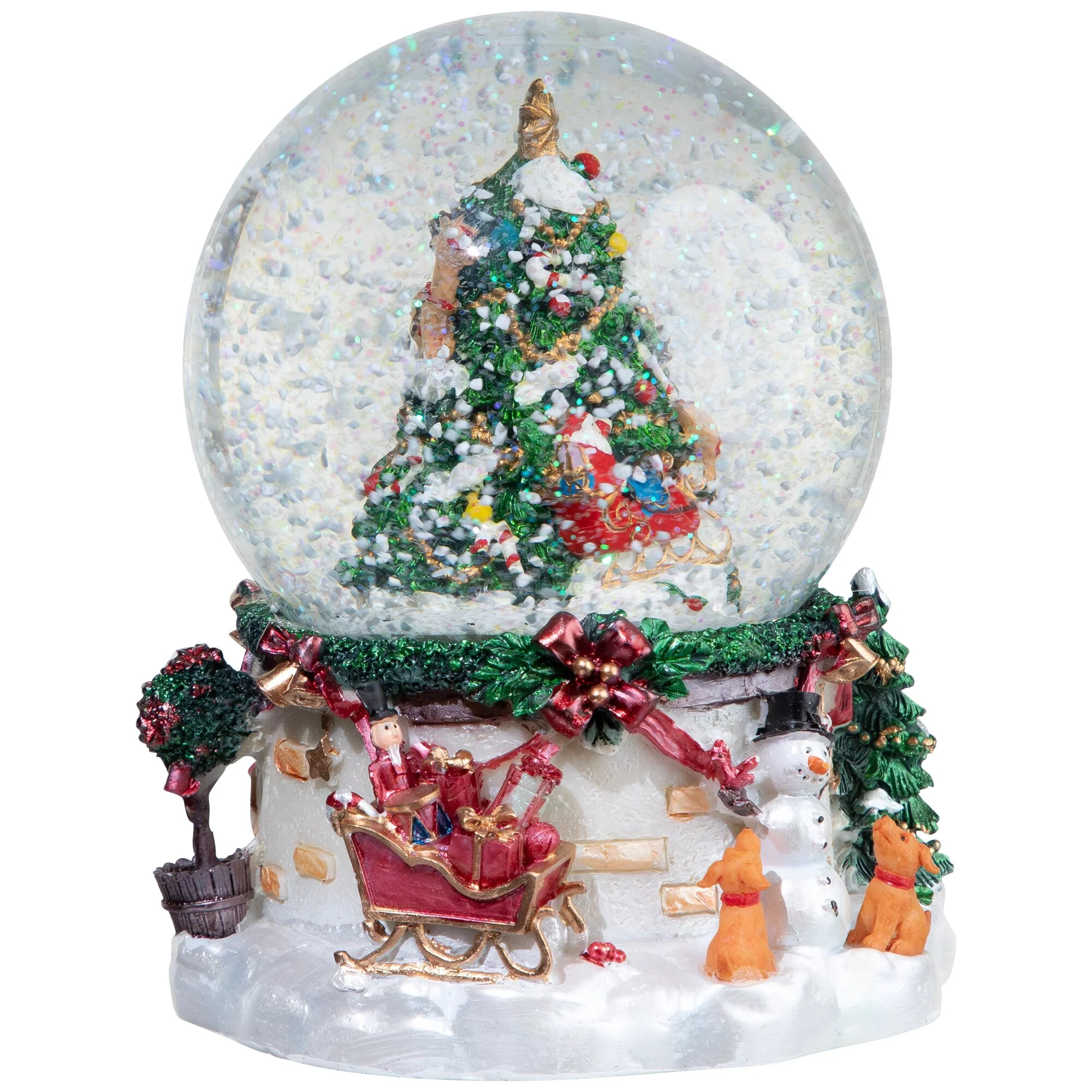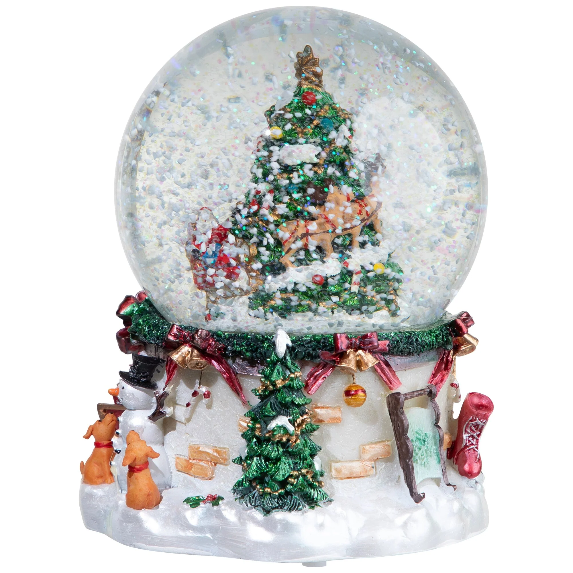 Be able to have your Christmas tree up year-round with this beautiful snow globe. Features Santa Claus in his sleigh while reindeer fly alongside a decorated Christmas tree, the base has a red sleigh filled with presents, snowmen, and dogs. This item would be the perfect touch to your decor. Place on your mantle or tabletop to enhancing your holiday display. Makes a wonderful gift for family or friends.