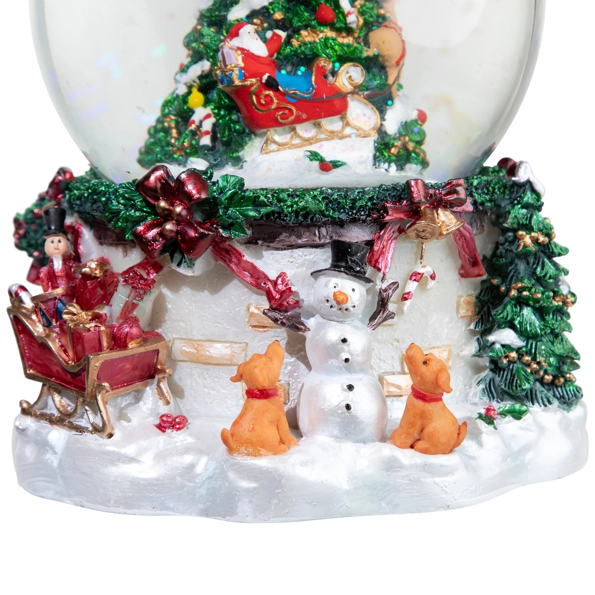 Inside the globe is a decorated Christmas tree with Santa in his sleigh