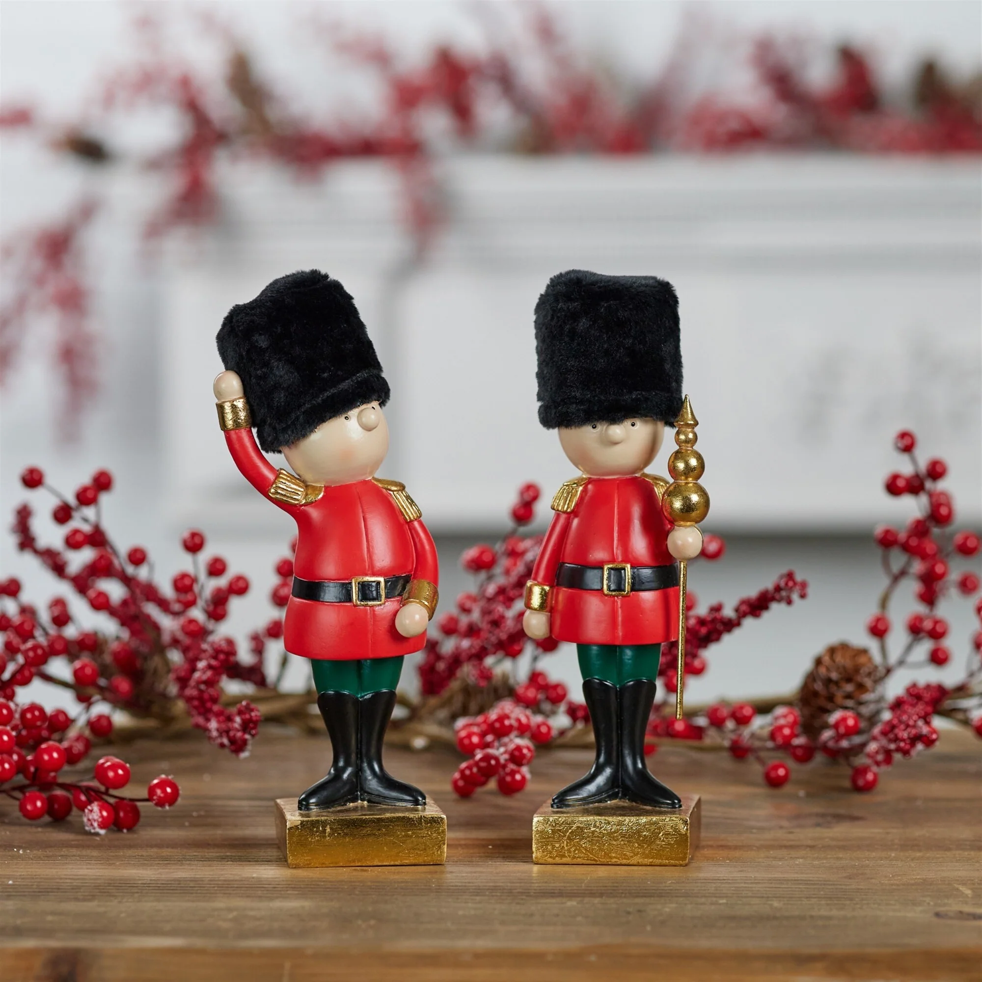 Enhance your holiday d茅cor with this elegant Holiday Nutcracker soldier figurine set. Styled in king��s guard inspired uniforms and hats, these nutcrackers feature striking tones with sleek metallic accents for a refined festive look. The set includes two assorted designs that bring both variety and balance to your seasonal display. Compact yet bold, they��re perfect for showcasing on mantels, tabletops, or shelves, effortlessly complementing floral arrangements, garlands, and other holiday accents with sophisticated charm.