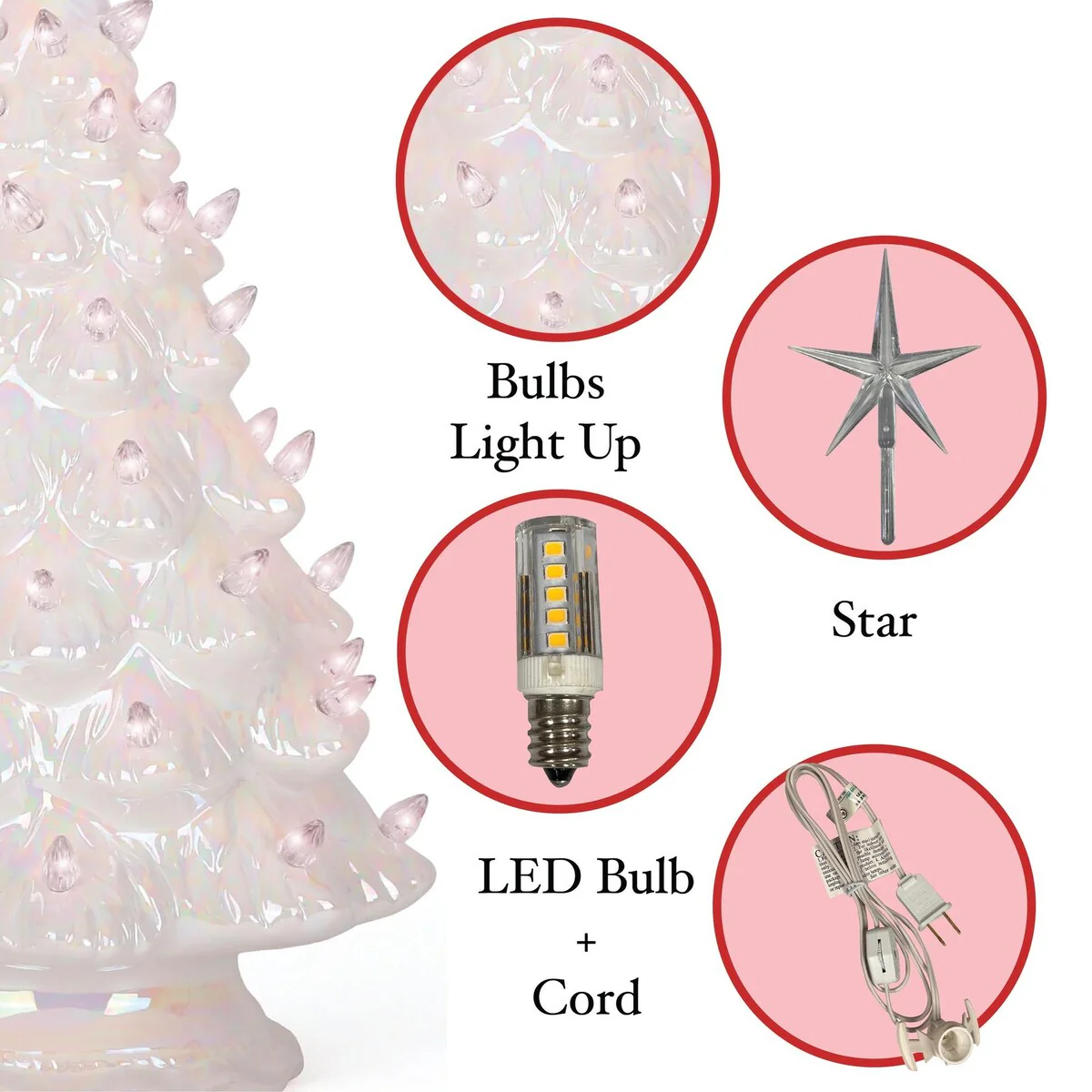 • LIGHTED CERAMIC CHRISTMAS TREE - The Milltown Merchants Lighted Vintage Christmas Tree is a must have for your holiday décor! It's perfect for tabletops, mantels, kitchens, bedrooms, foyers, fireplaces, bathrooms, and anywhere that needs a little something extra for the holidays.Each tree comes with a 5' plug-in light cord and extra Christmas light bulbs for the tree. Lights are glued in place and are non-removable.