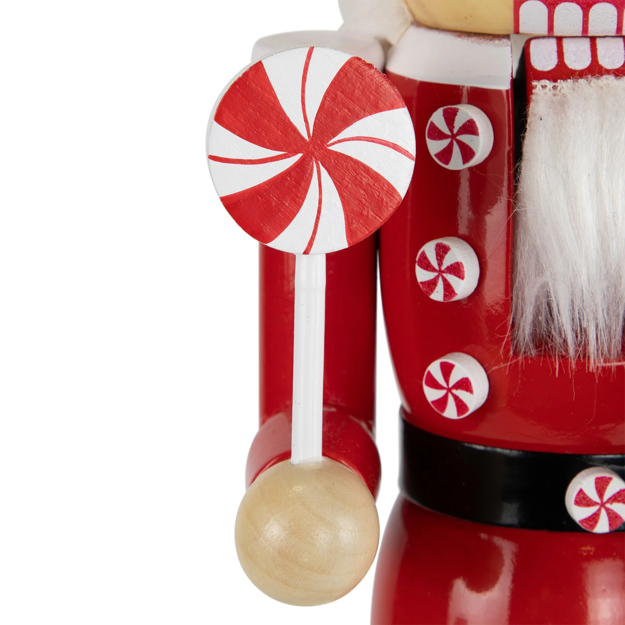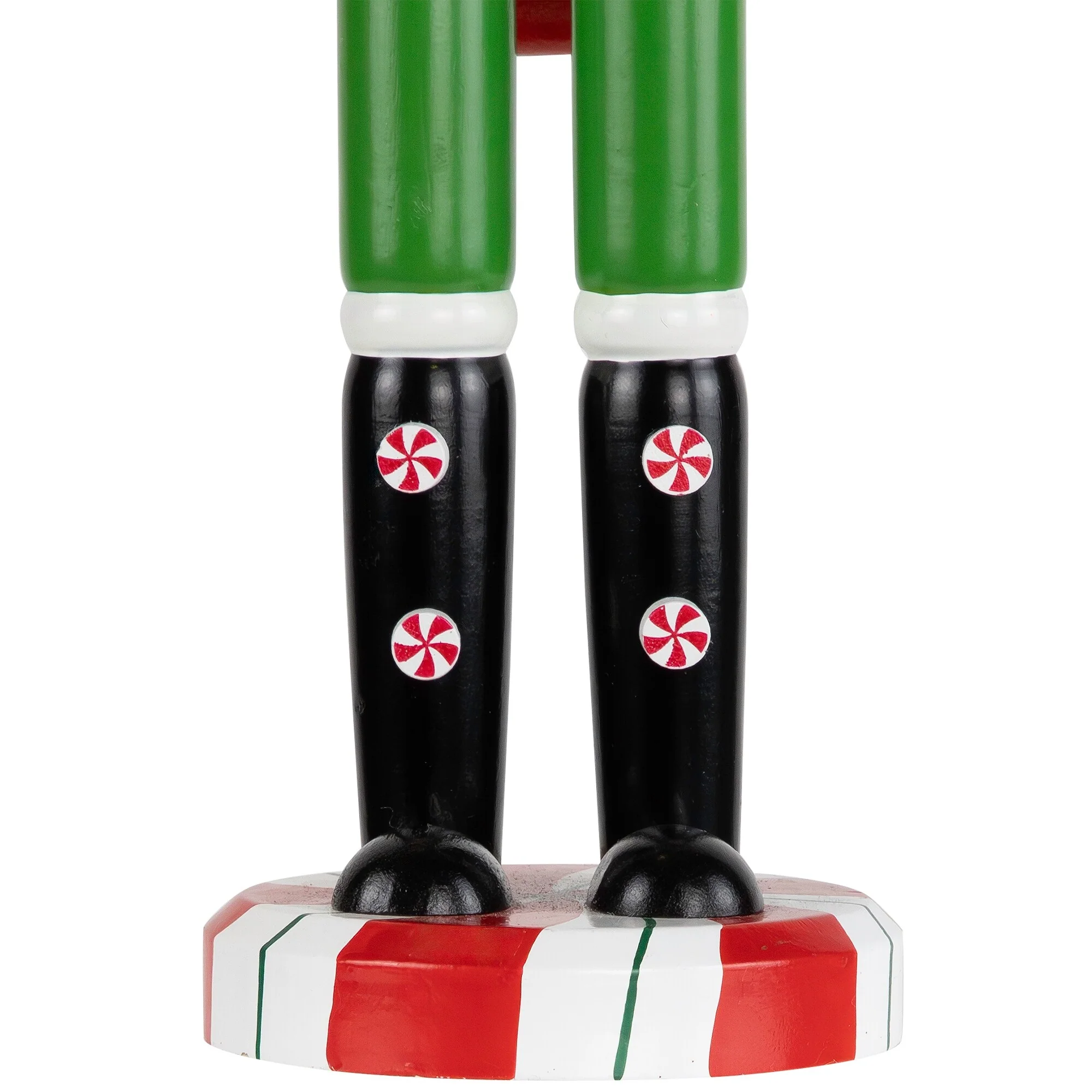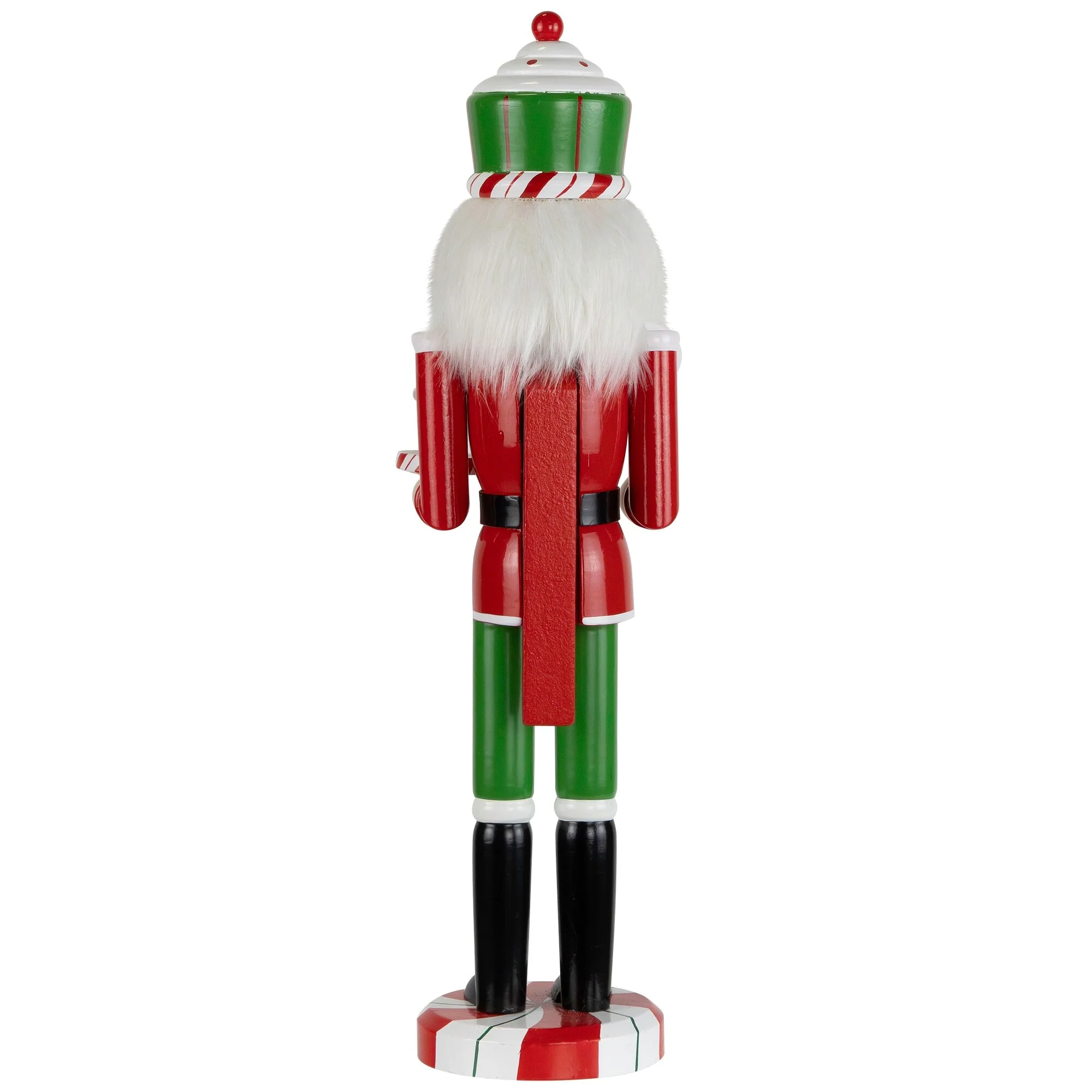 Traditional nutcracker figure in red, green, and white hues with peppermint candy patterns