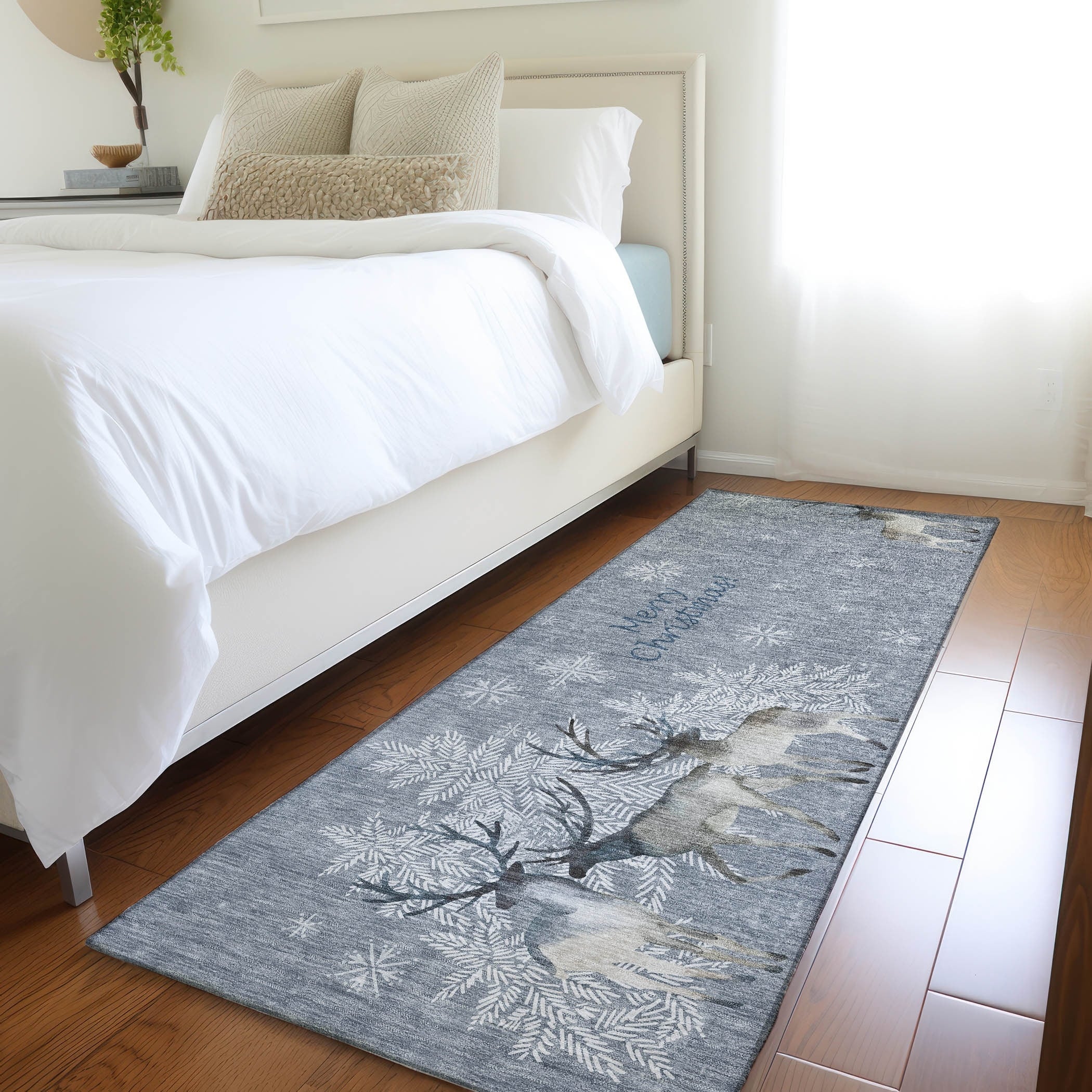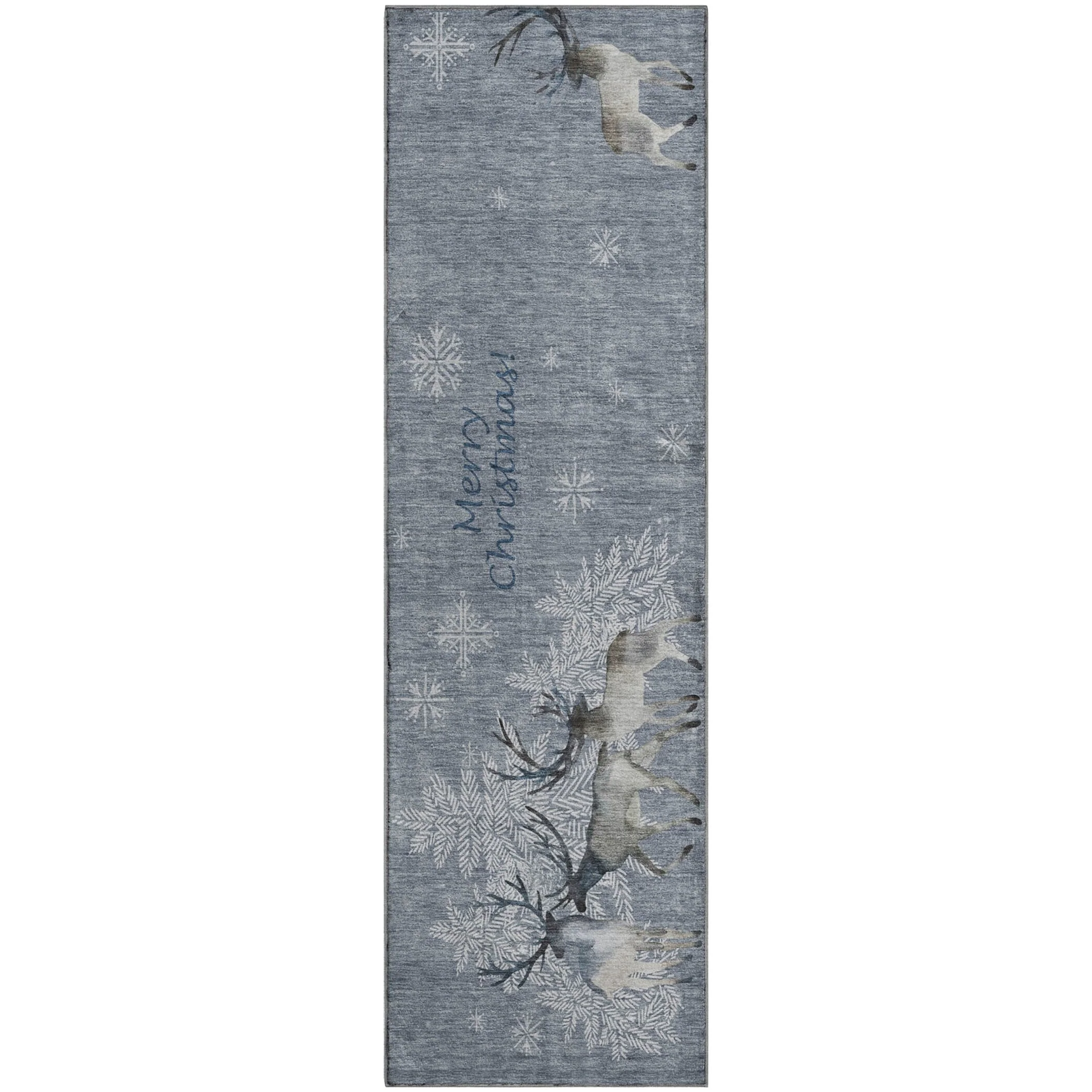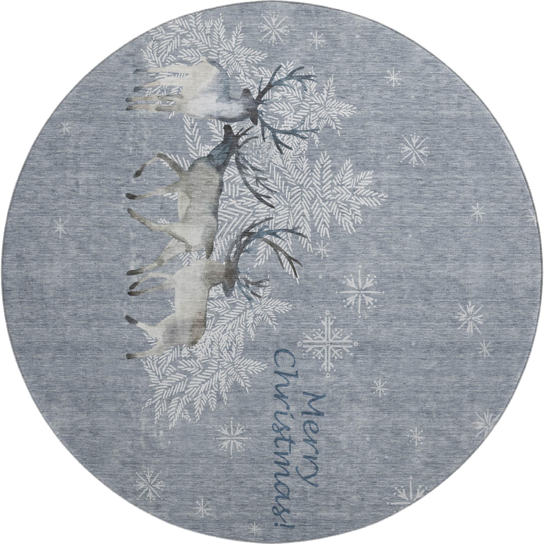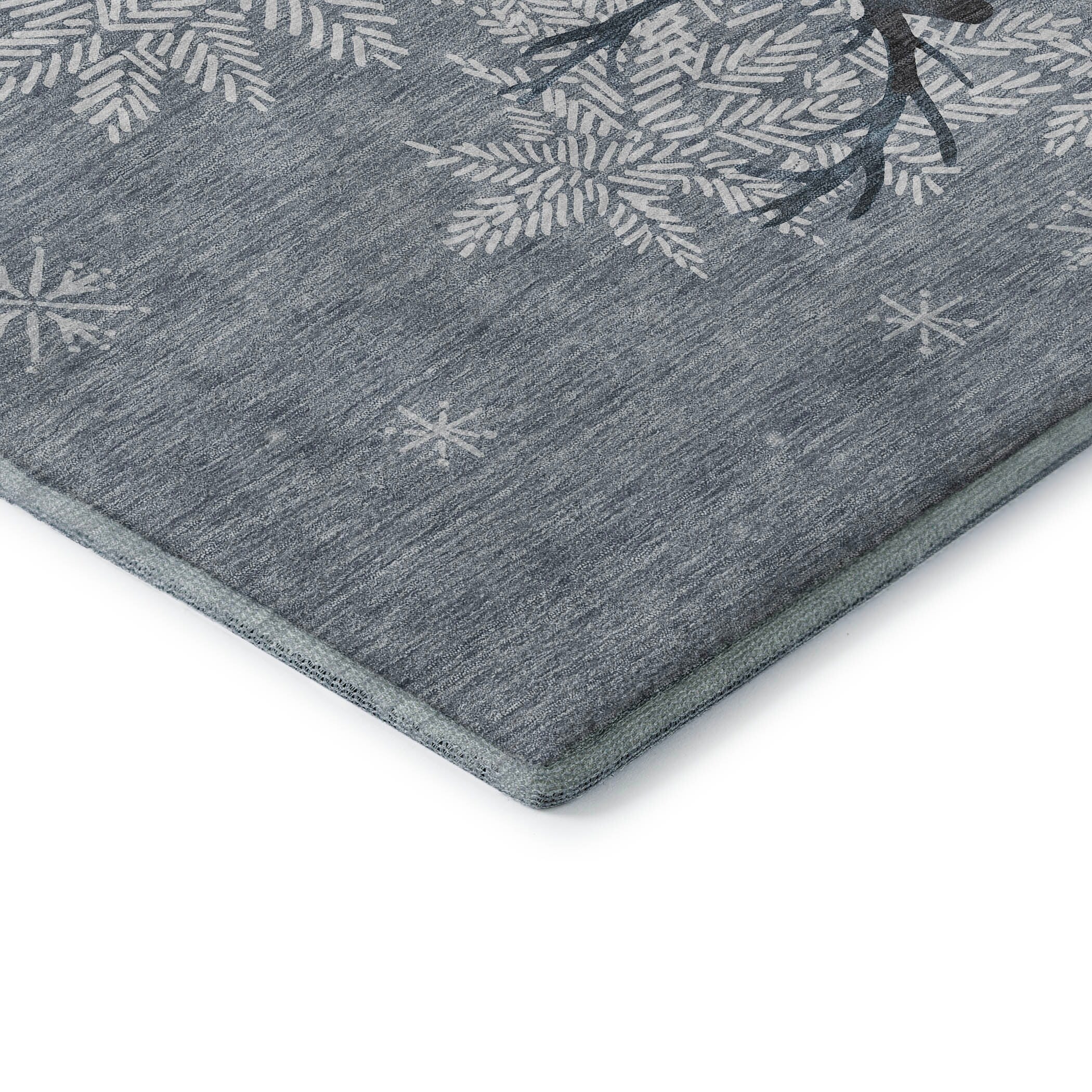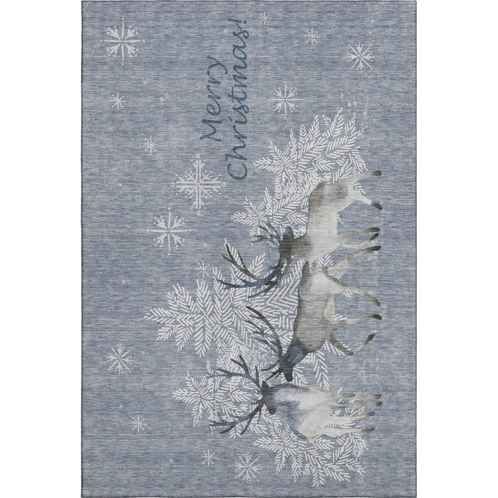 Reindeer with snowflakes create a magical holiday scene in your home. This festive rug design adds warmth and joy to any room. Perfect for use indoors and in covered outdoor areas, it offers a soft, thick, and plush microfiber pile. It's premium machine washable and family and pet-friendly, ensuring both comfort and convenience. Larger rug sizes may not fit into a residential washing machine. They may be washed in a commercial size washing machine or hosed-off outside with mild soap and water. Air-dry, do not machine dry. Each rug has a non-skid backing. An additional rug pad may be used for extra comfort and stability.
