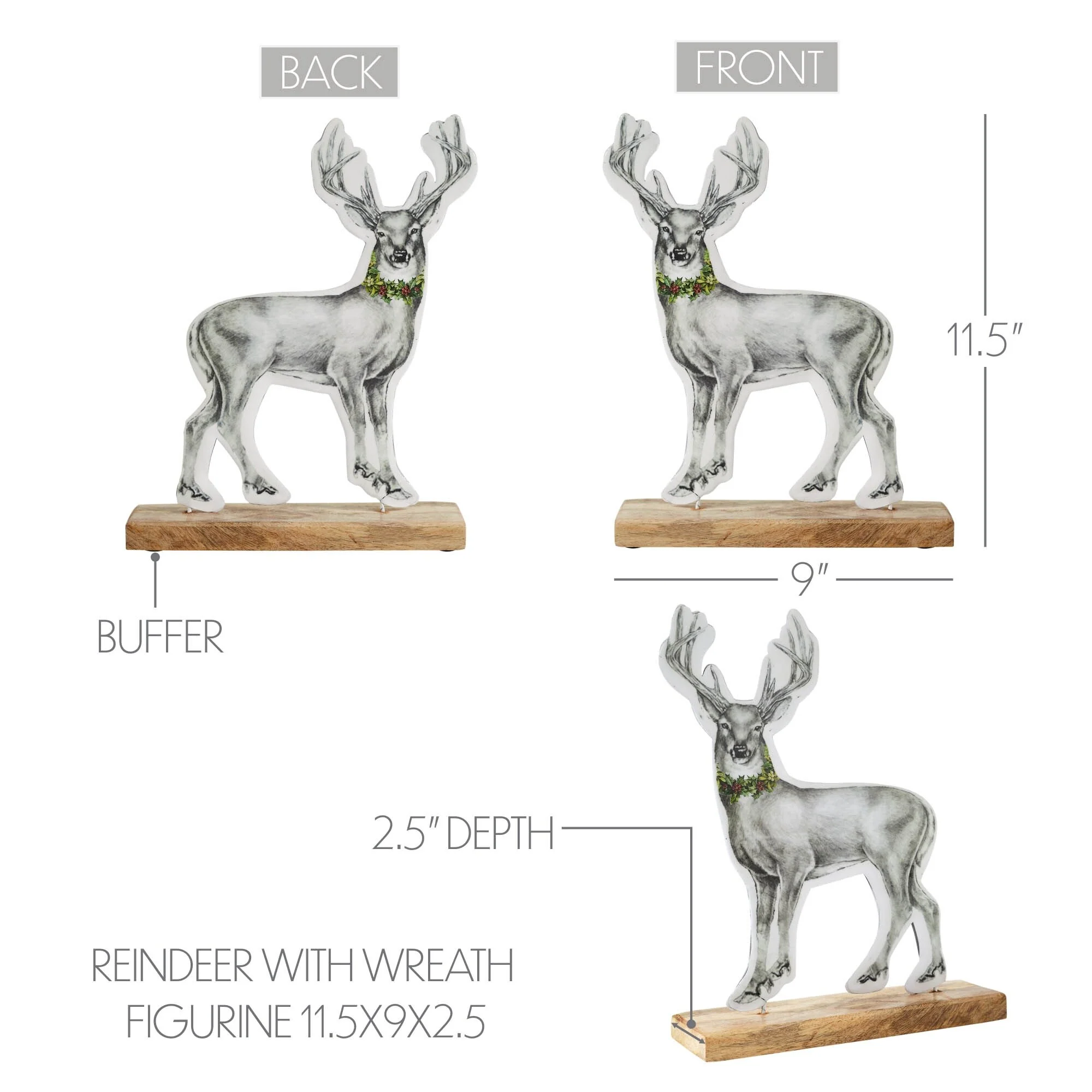 Bring the spirit of the winter woods into your home with the charming VHC Brands Metal Reindeer With Wreath Figurine. Standing 11.5 inches tall, this graceful figurine features a regal reindeer adorned with a wreath of holly, exuding elegance and holiday cheer. Crafted from durable metal and tropical wood, it boasts a sturdy construction while showcasing rustic charm, making it a perfect accent for tabletops and shelves in your dining room, entryway, or living room. The sophisticated color palette of steel grey, light creme, and holly green infuses this figurine with a primitive allure, capturing the essence of traditional Christmas decor. Its primitive design and distressed appearance add to its authenticity, evoking memories of cozy winter nights and festive gatherings. Whether displayed alone or paired with other seasonal decorations, the Reindeer With Wreath Figurine lends a touch of enchantment to your indoor spaces, creating a welcoming atmosphere for winter and Christmas festivities. Maintaining the pristine condition of this figurine is effortless - simply wipe it clean with a soft cloth to remove any dust or debris, ensuring that it remains a cherished symbol of holiday magic for years to come. With its graceful silhouette and festive adornments, the VHC Brands Metal Reindeer With Wreath Figurine captures the timeless beauty of the season, adding a touch of rustic elegance to your winter and Christmas home decor.