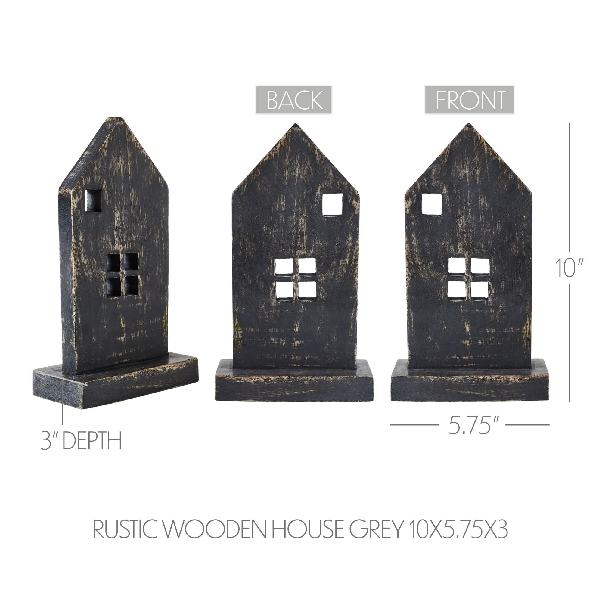 Elevate your home decor with the charming appeal of the VHC Brands Tropical Wood Rustic Wooden House in Dove Grey. Crafted from high-quality tropical wood, this figurine features a quaint cutout wood house design that exudes rustic elegance. Measuring 10 inches in height, 5.75 inches in width, and 3 inches in depth, it's perfectly sized for tabletop display on shelves, tables, or mantels, adding a touch of warmth and character to any room. The soft dove grey finish of this wooden house figurine lends a serene and inviting ambiance to your living space, making it an ideal accent piece for the holiday season and beyond. Its primitive design and vintage-inspired aesthetic evoke a sense of nostalgia and coziness, while the distressed appearance adds a rustic charm that enhances its appeal. Whether placed in the dining room, entryway, or living room, this figurine complements a variety of decor styles, bringing a touch of understated elegance to your home.Maintaining the beauty of this rustic wooden house figurine is effortless - simply wipe it clean with a soft cloth to remove dust and maintain its pristine appearance. Versatile and full of personality, the VHC Brands Tropical Wood Rustic Wooden House in Dove Grey promises to be a timeless addition to your home decor, infusing your space with warmth, style, and a hint of whimsical charm.