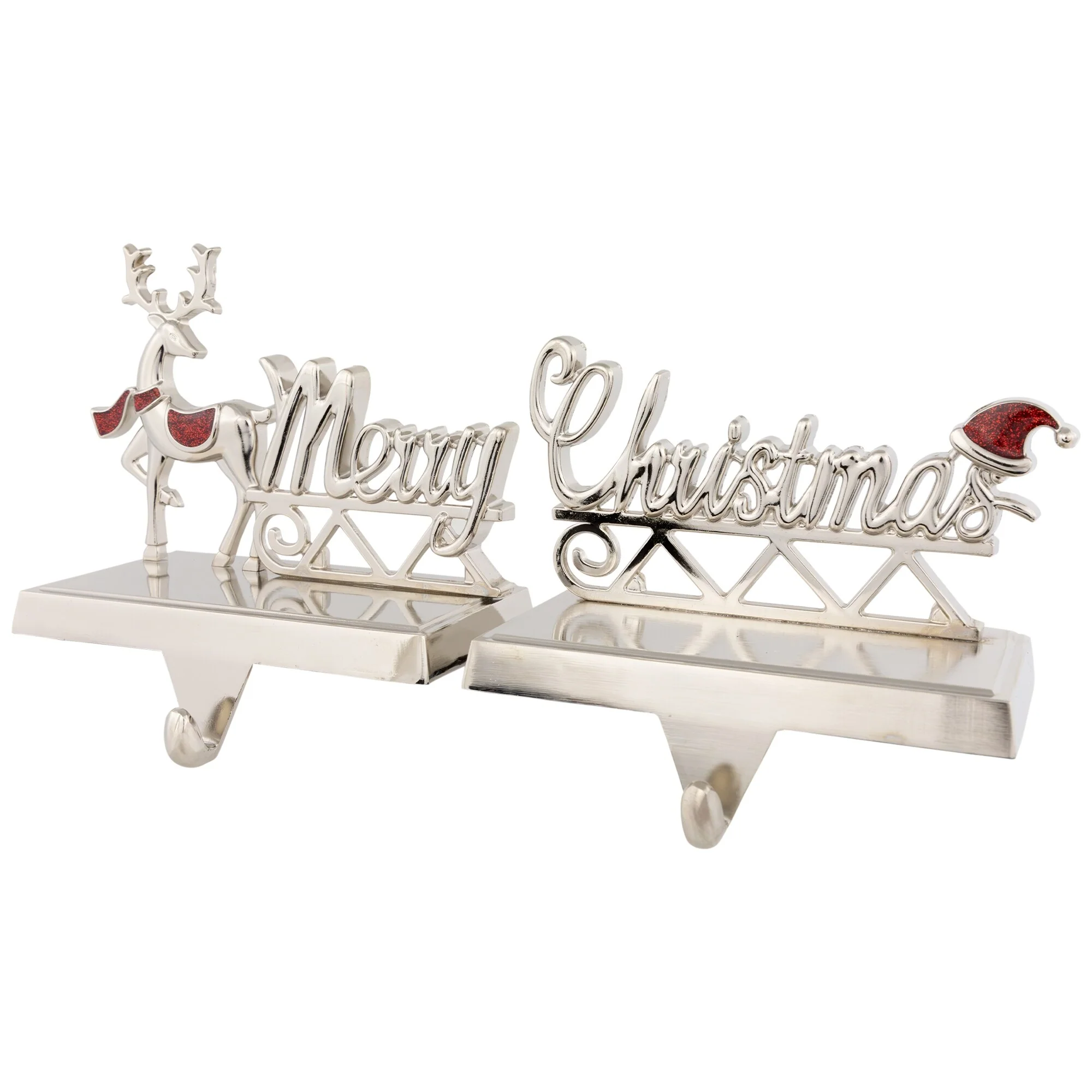 Crafted with precision from cutout metal, these stocking holders feature Merry Christmas in cursive lettering, an intricately designed reindeer figure and a Santa hat. Their shiny silver tone finish adds a touch of sophistication to any mantel or shelf, while the sturdy construction ensures your stockings are securely held in place. These versatile and stylish stocking holders effortlessly blend with any Christmas theme, making them a perfect addition to your seasonal celebrations.