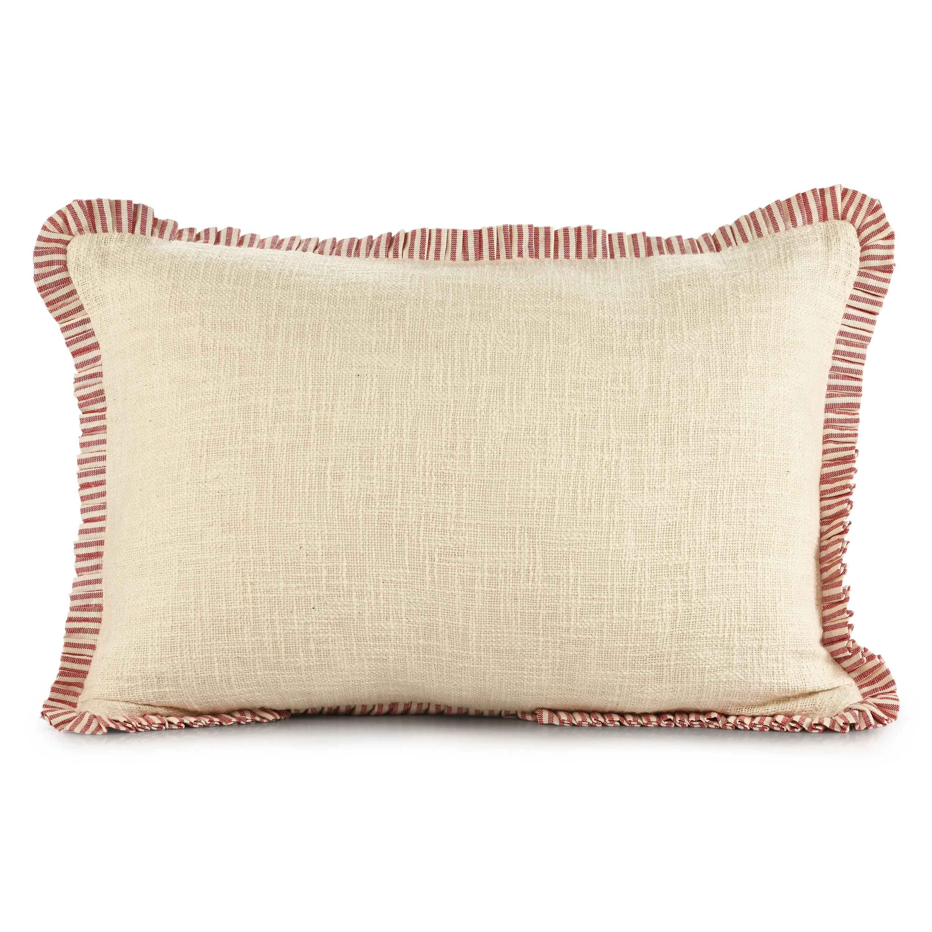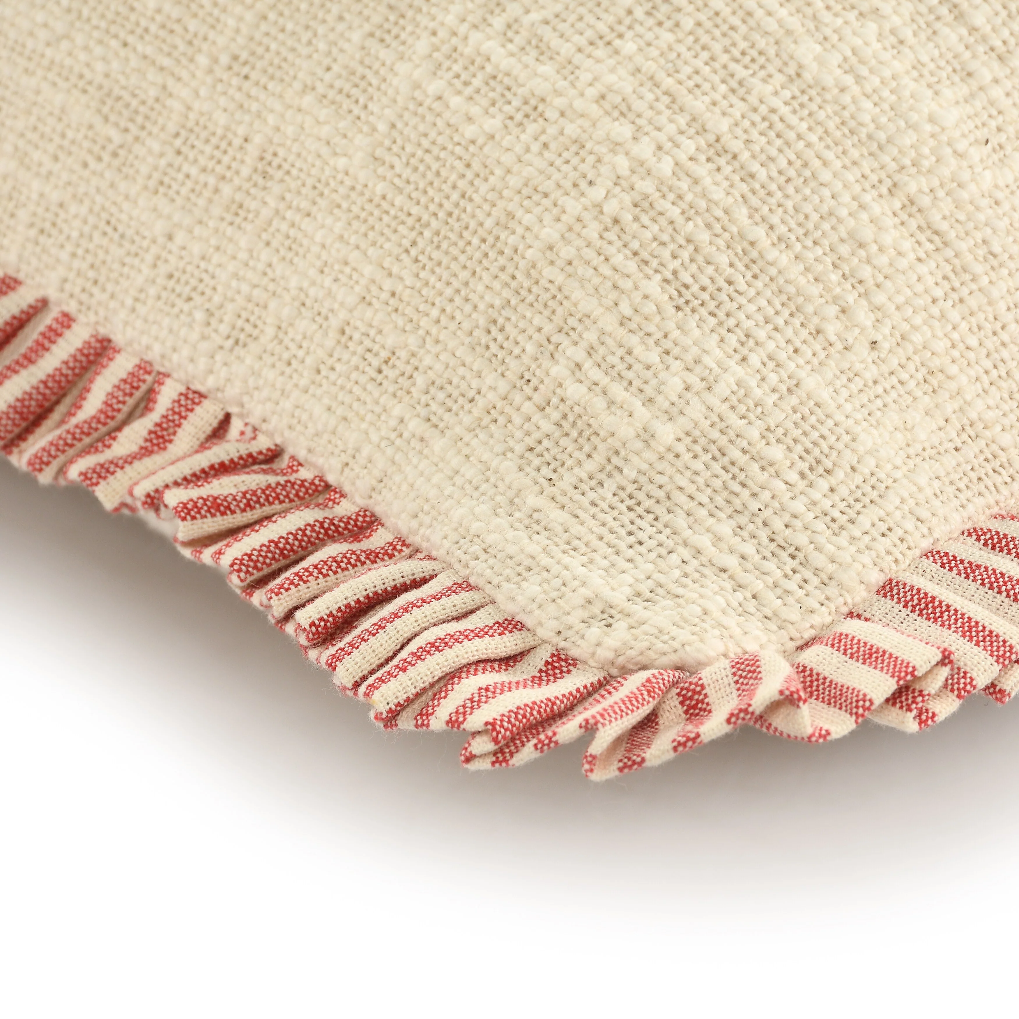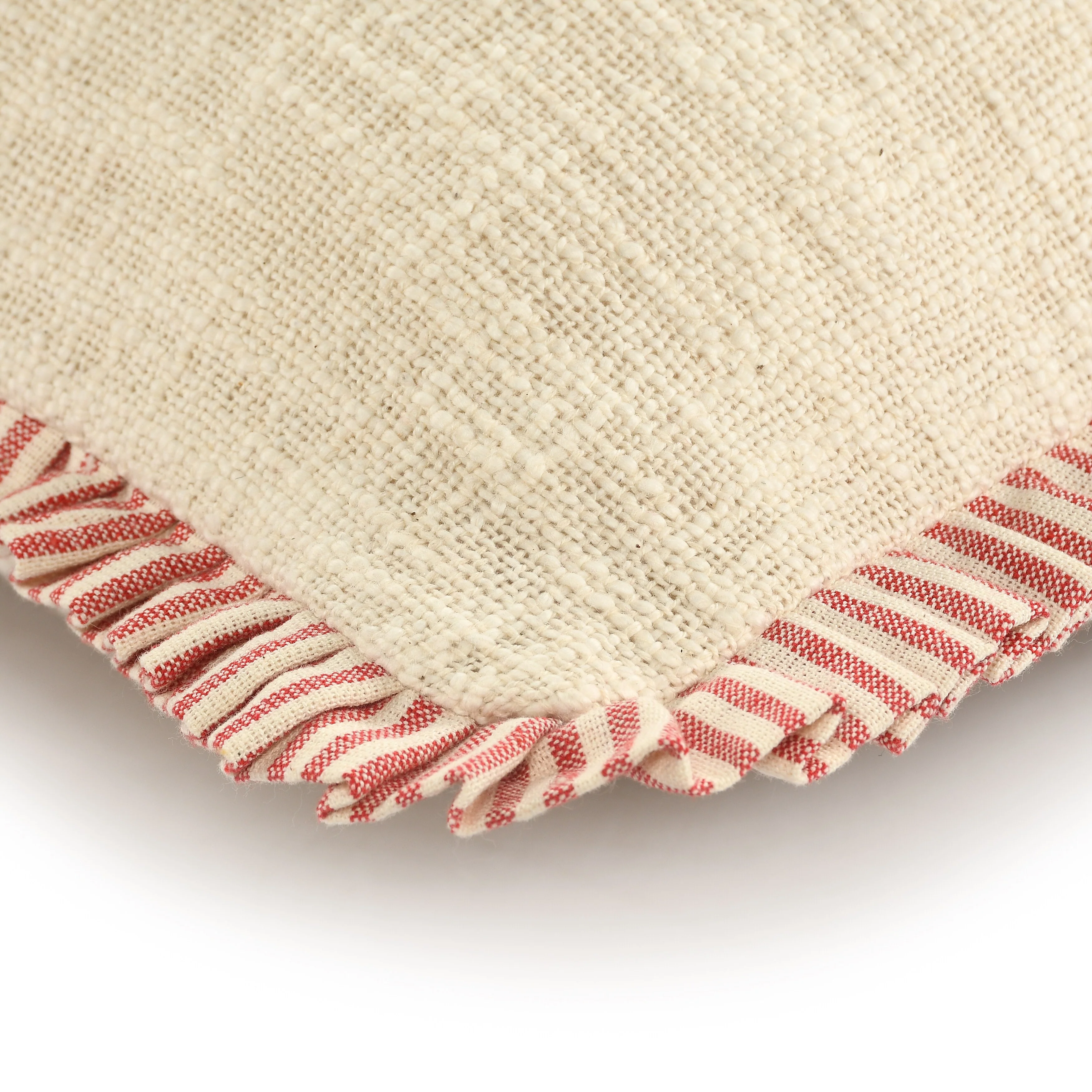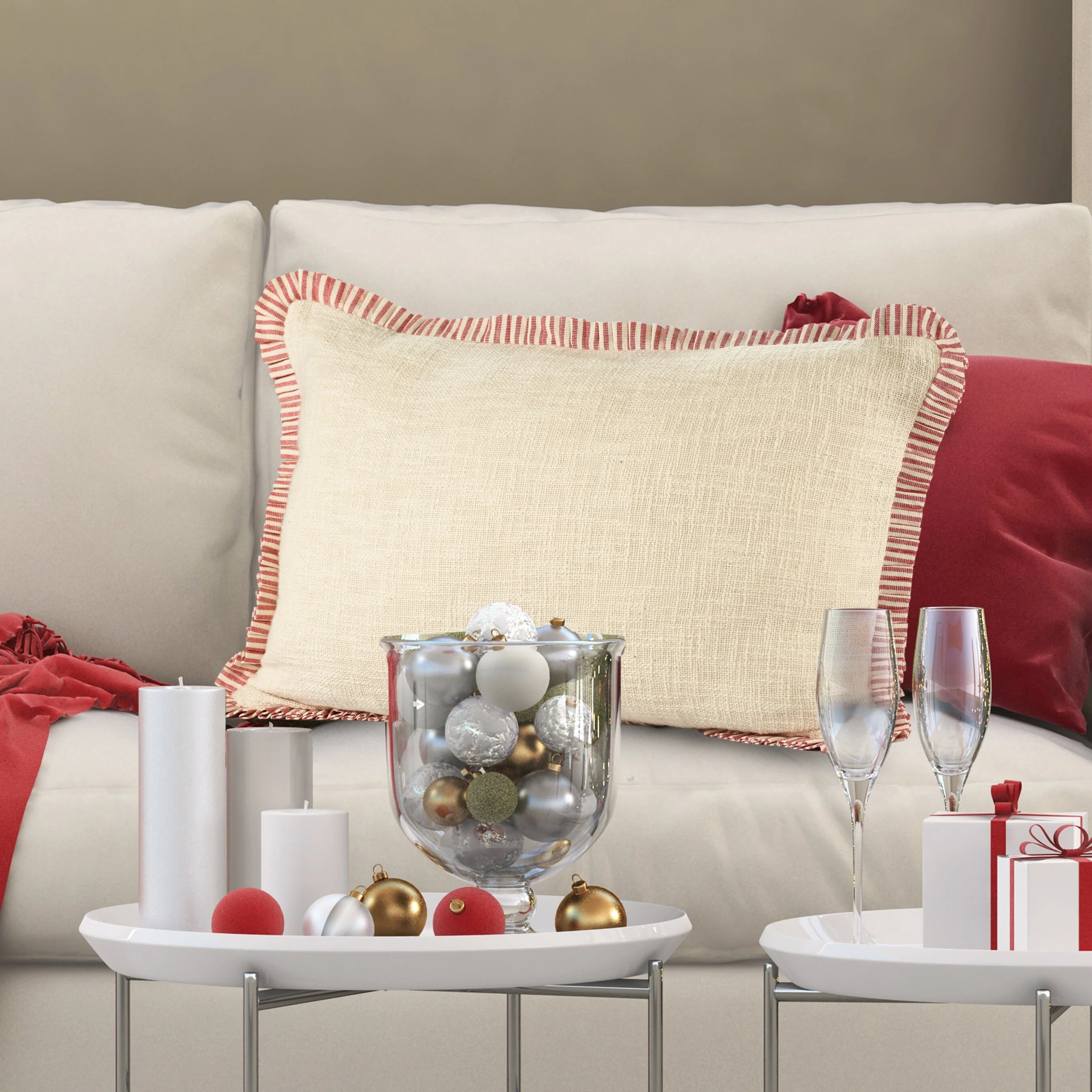 Add a touch of Christmas cheer to your home décor collection with the Candy Cane Striped Ruffle Border Throw Pillow. This festive accent pillow features a ruffled border with candy cane stripes in classic red tones to tie together all your favorite holiday hues and themes. Crafted from cotton, this throw pillow provides comfort and support while keeping your room merry and bright. A hidden zipper on the side allows for easy removal of the insert for cleaning.