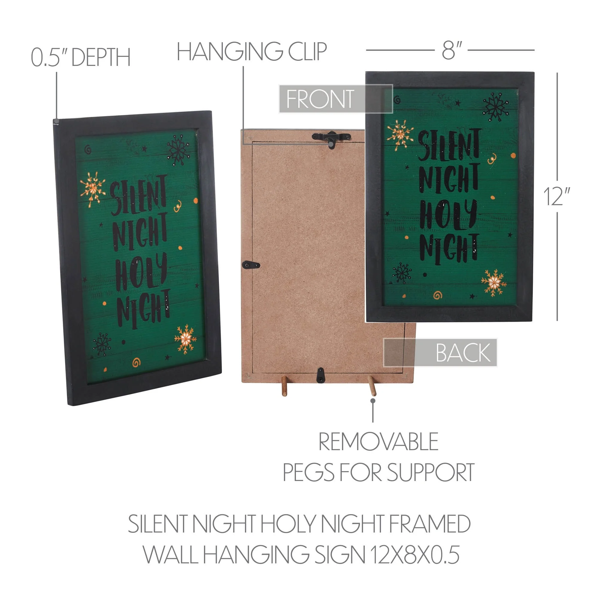 Enhance the ambiance of your holiday decor with the serene message of the VHC Brands Silent Night Holy Night Framed Wall Hanging Sign. Measuring 12x8 inches, this rectangular sign features the timeless phrase Silent Night Holy Night elegantly printed in a classic font against a backdrop of tranquil colors: cypress green, country black, and dark creme. The sign is framed in a rustic design, adding charm and sophistication to any wall or door in your home during the Christmas season. Crafted from sturdy MDF material, this wall hanging sign is built to withstand the test of time. Its smooth surface allows for easy cleaning with a soft cloth, ensuring that it maintains its pristine appearance throughout the holiday festivities. With pre-drilled holes for convenient hanging, you can effortlessly display this sign in your bedroom, dining room, entryway, kitchen, living room, or any other space where you want to infuse the spirit of peace and reverence associated with the Christmas season. The VHC Brands Silent Night Holy Night Framed Wall Hanging Sign serves as a gentle reminder of the sacred significance of Christmas. Whether hung on a wall or door, it adds a touch of tranquility and spirituality to your holiday decor, inspiring reflection on the profound message of the silent and holy night when Jesus Christ was born. This beautiful sign is a meaningful addition to your Christmas decorations and creates a peaceful atmosphere that welcomes the joy and wonder of the holiday season into your home.