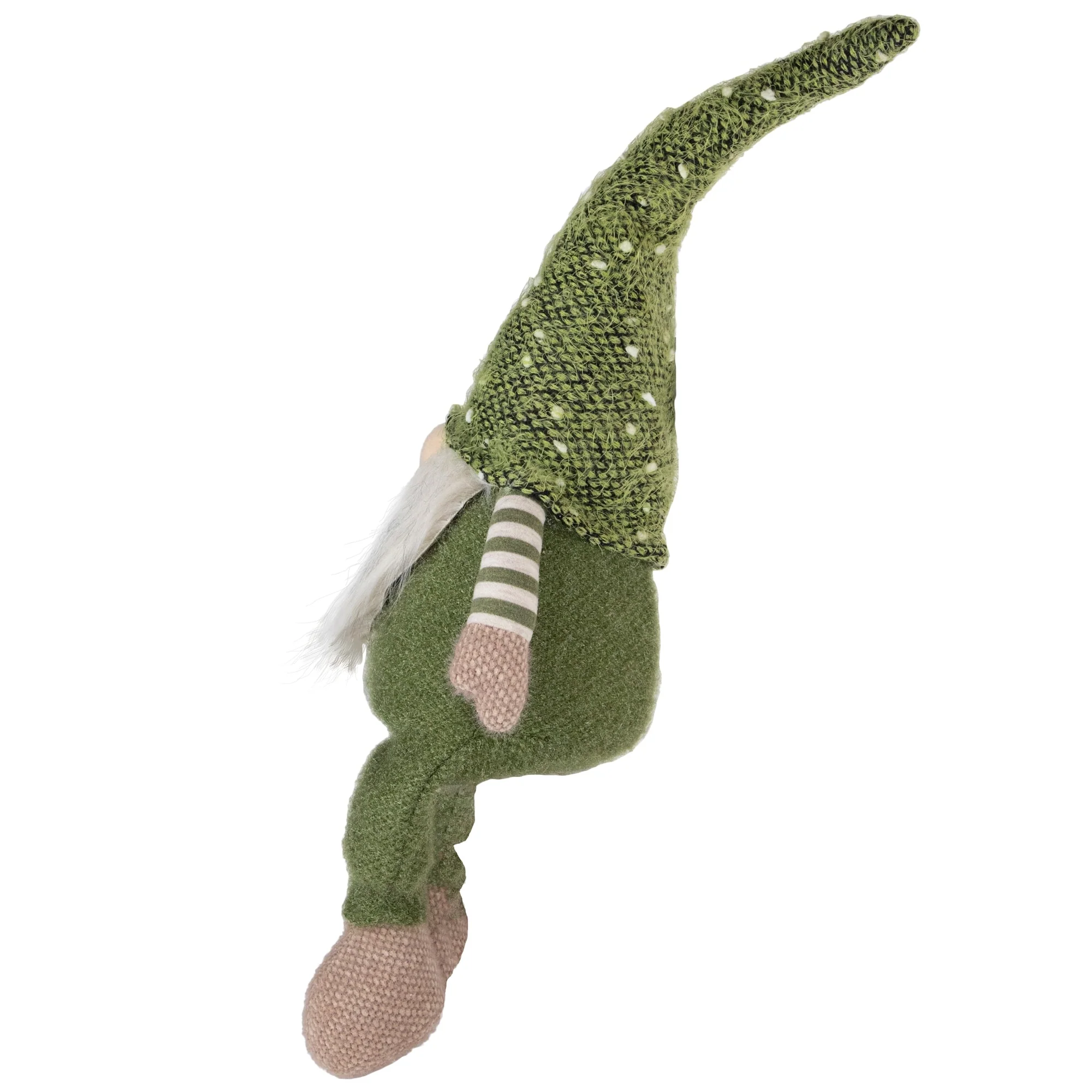 This gnome is dressed in a green jumpsuit with green and white striped arms