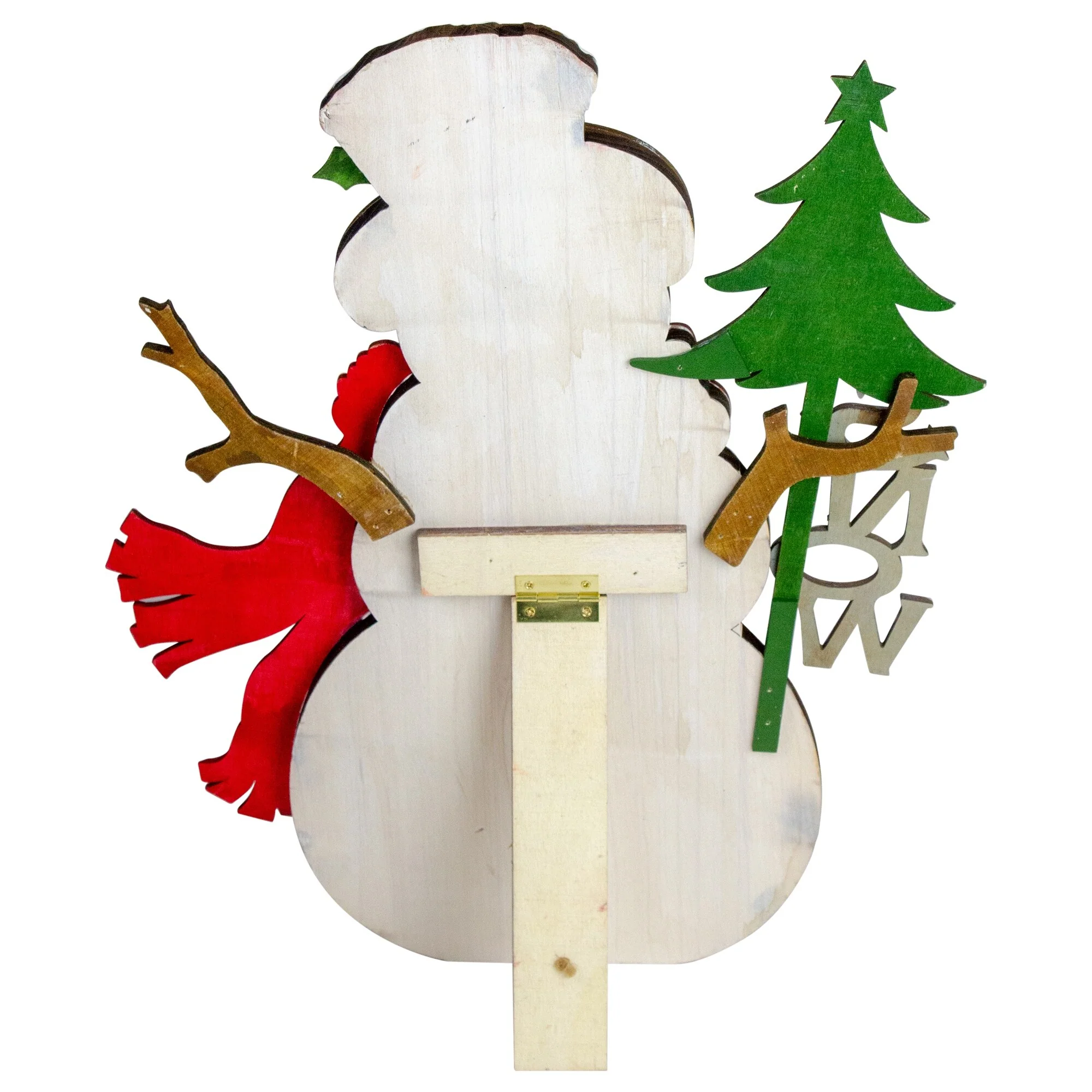Rustic wooden snowman decoration comes wearing a red and yellow polka dot scarf with a dapper black top hat. His hat comes adorned with a holly berry accent. Snowman is holding a Christmas tree with a 'Snow' sign. The easel back allows the snowman to stand freely on a tabletop. Perfect as a mantel decoration or for placing on an end table.