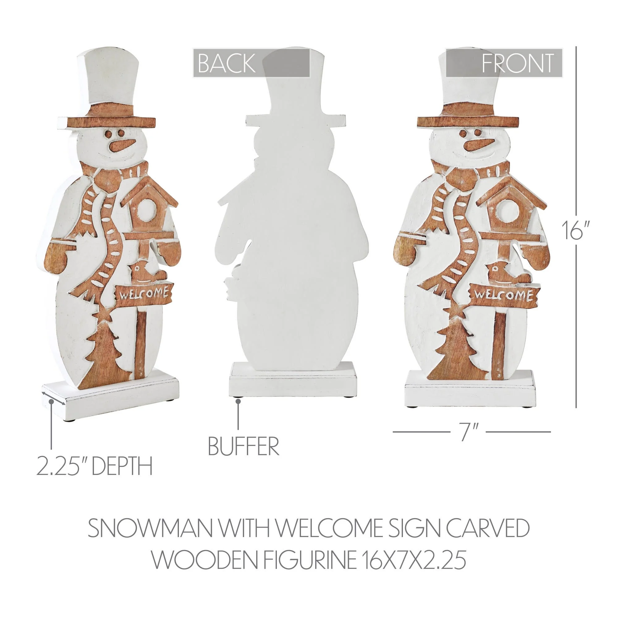 Elevate the charm of your winter and Christmas home decor with the delightful VHC Brands Tropical Wood Snowman With Welcome Sign Carved Wooden Figurine. Standing at 16 inches tall, this adorable snowman figurine exudes a heartwarming welcome with its whimsical demeanor and the inviting Welcome sign it holds. Crafted from tropical wood, it boasts intricate detailing and a distressed appearance, adding a rustic touch to your tabletops and shelves. With its bright white and wood brown hues, this snowman figurine embodies the essence of farmhouse and country-inspired decor, making it a perfect addition to your seasonal setup. Whether placed in the bathroom, bedroom, dining room, entryway, kitchen, or living room, it instantly infuses your space with the traditional snowman theme, spreading joy and festive cheer throughout your home. Its novelty design and distressed finish lend a nostalgic appeal, creating a cozy atmosphere reminiscent of winter holidays past. Maintaining the pristine condition of this wooden snowman figurine is effortless - simply wipe it clean with a soft cloth to remove dust and preserve its intricate features. Whether displayed as a standalone accent piece or incorporated into a larger holiday arrangement, the VHC Brands Tropical Wood Snowman With Welcome Sign Carved Wooden Figurine serves as a heartening symbol of hospitality and seasonal delight, making it a cherished part of your indoor decorations during the winter and Christmas season.