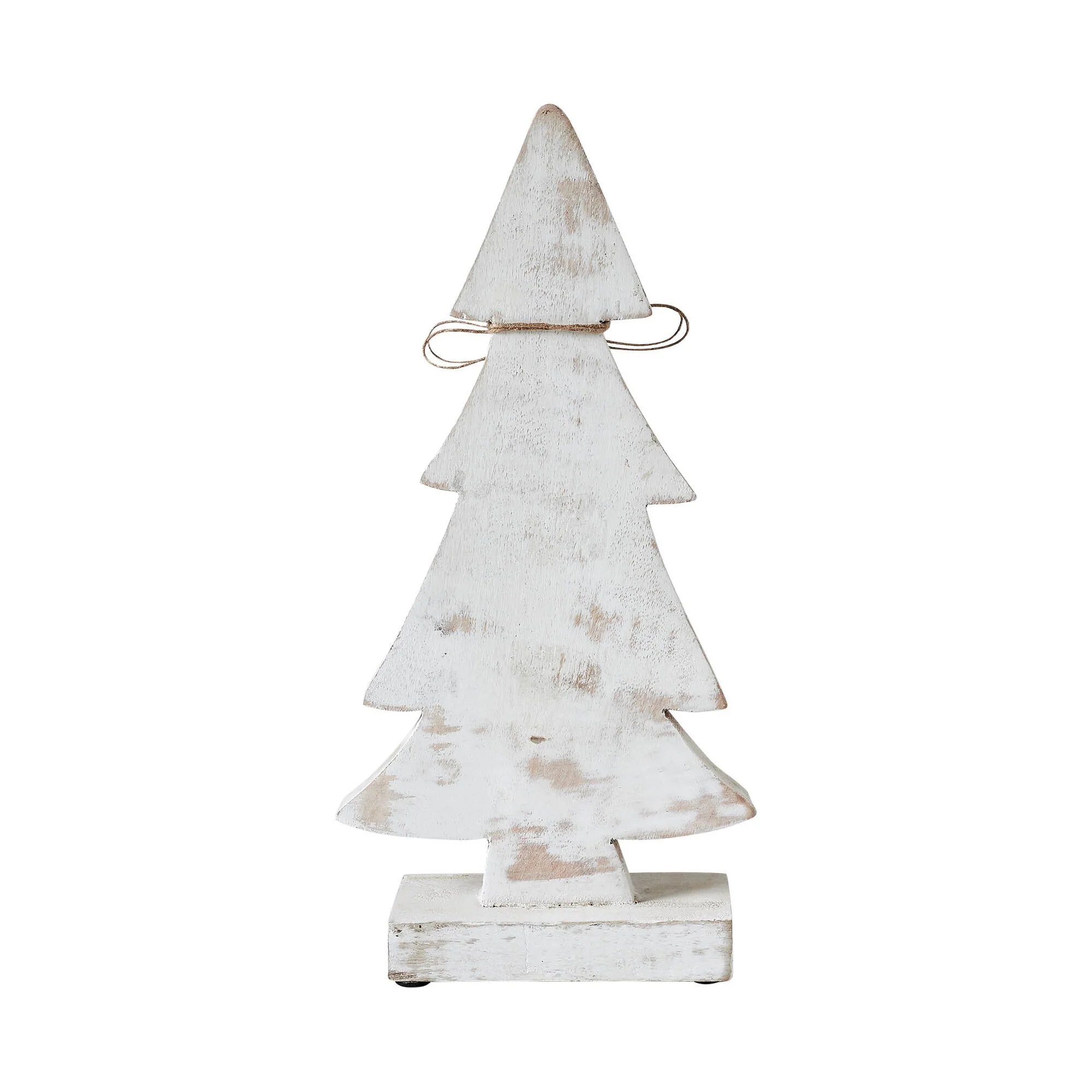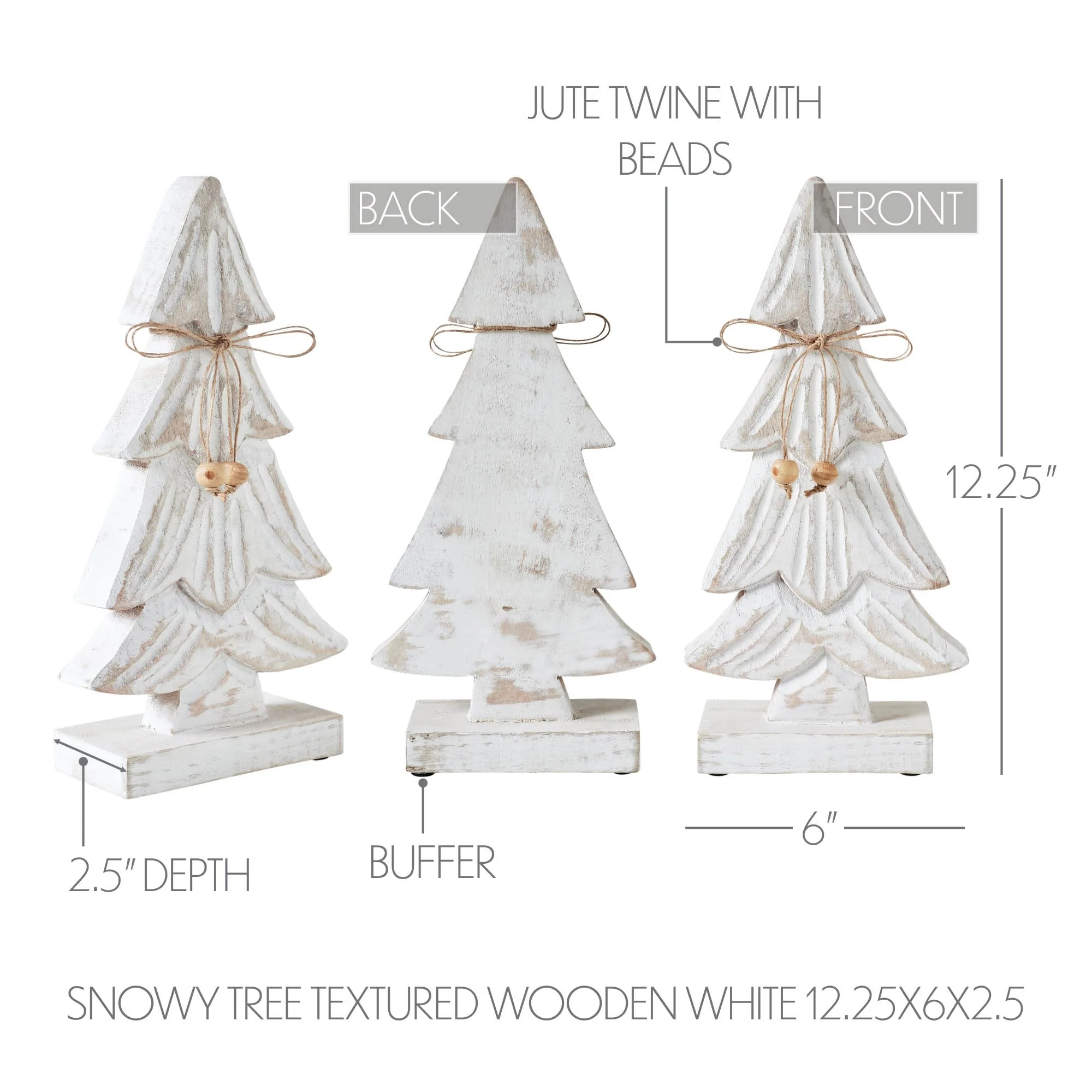 Enhance the ambiance of your winter and Christmas decor with the charming VHC Brands Tropical Wood Snowy Tree. Crafted from durable tropical wood, this textured figurine features a full Christmas tree silhouette adorned with a rustic twine bow, measuring 12.25 inches in height, 6 inches in width, and 2.5 inches in depth. Its intricate detailing and snowy finish evoke the enchanting beauty of a winter wonderland, making it a perfect addition to tabletops, shelves, or mantels in your dining room, entryway, living room, and more. Finished in an elegant antique white hue, this wooden Christmas tree exudes vintage charm, adding a touch of nostalgic appeal to your holiday decor. Its primitive design and distressed appearance lend an authentic rustic vibe, reminiscent of traditional Christmas celebrations. Whether displayed on its own or paired with other seasonal accents, this figurine infuses your indoor decorations with warmth and cheer, creating a cozy atmosphere for gatherings with family and friends. Keeping this snowy tree pristine is effortless - simply wipe it clean with a soft cloth to remove dust and maintain its vintage allure throughout the holiday season. Whether showcased as a standalone piece or incorporated into a larger winter display, this textured wooden tree serves as a delightful focal point, spreading joy and festive spirit to your home decor and making every moment of winter and Christmas memorable.