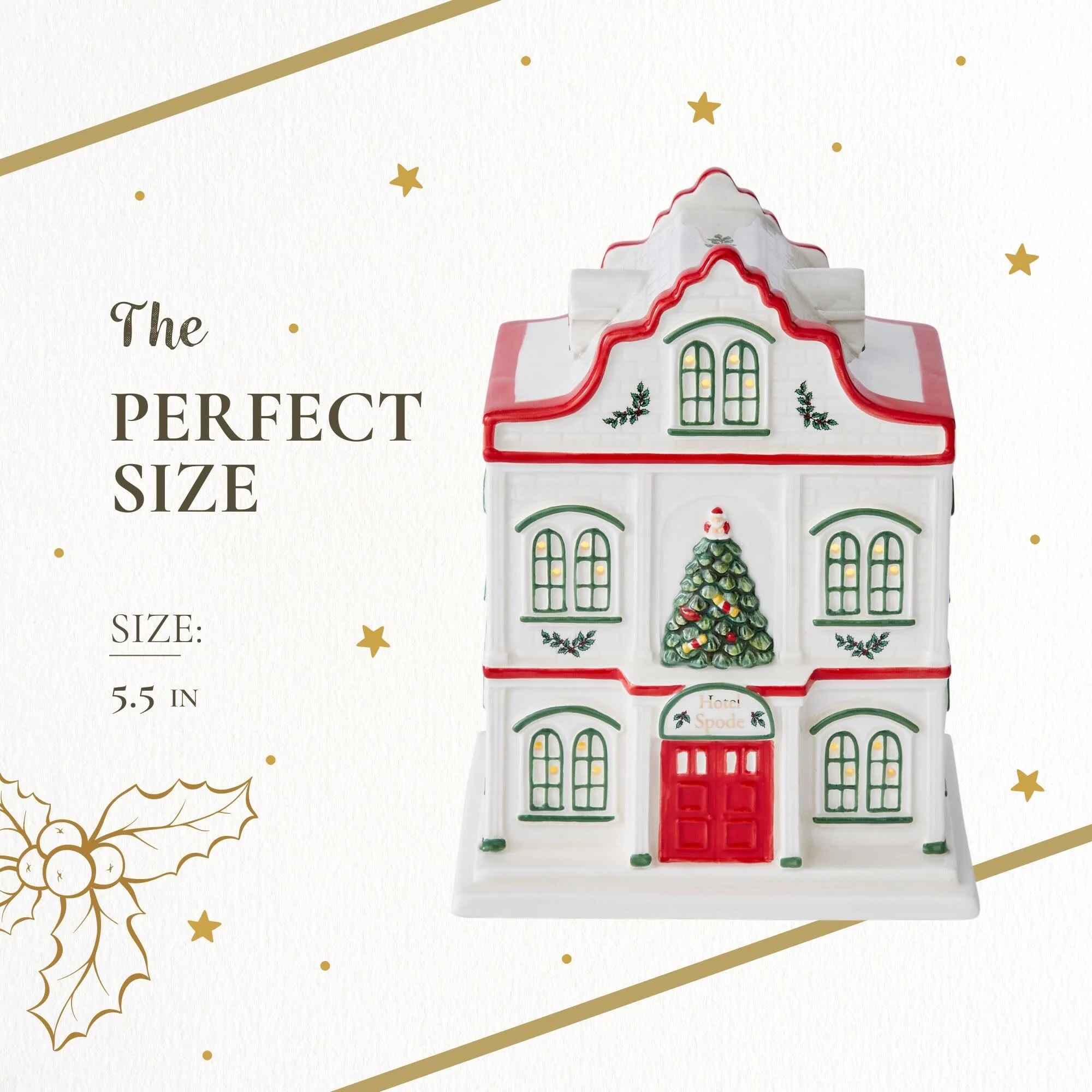 - Festive & Traditional: Featuring Spode's celebrated Christmas tree, holly leaves, and vibrant red and green accents, this village hotel brings a joyful and classic touch to your Christmas celebrations.
