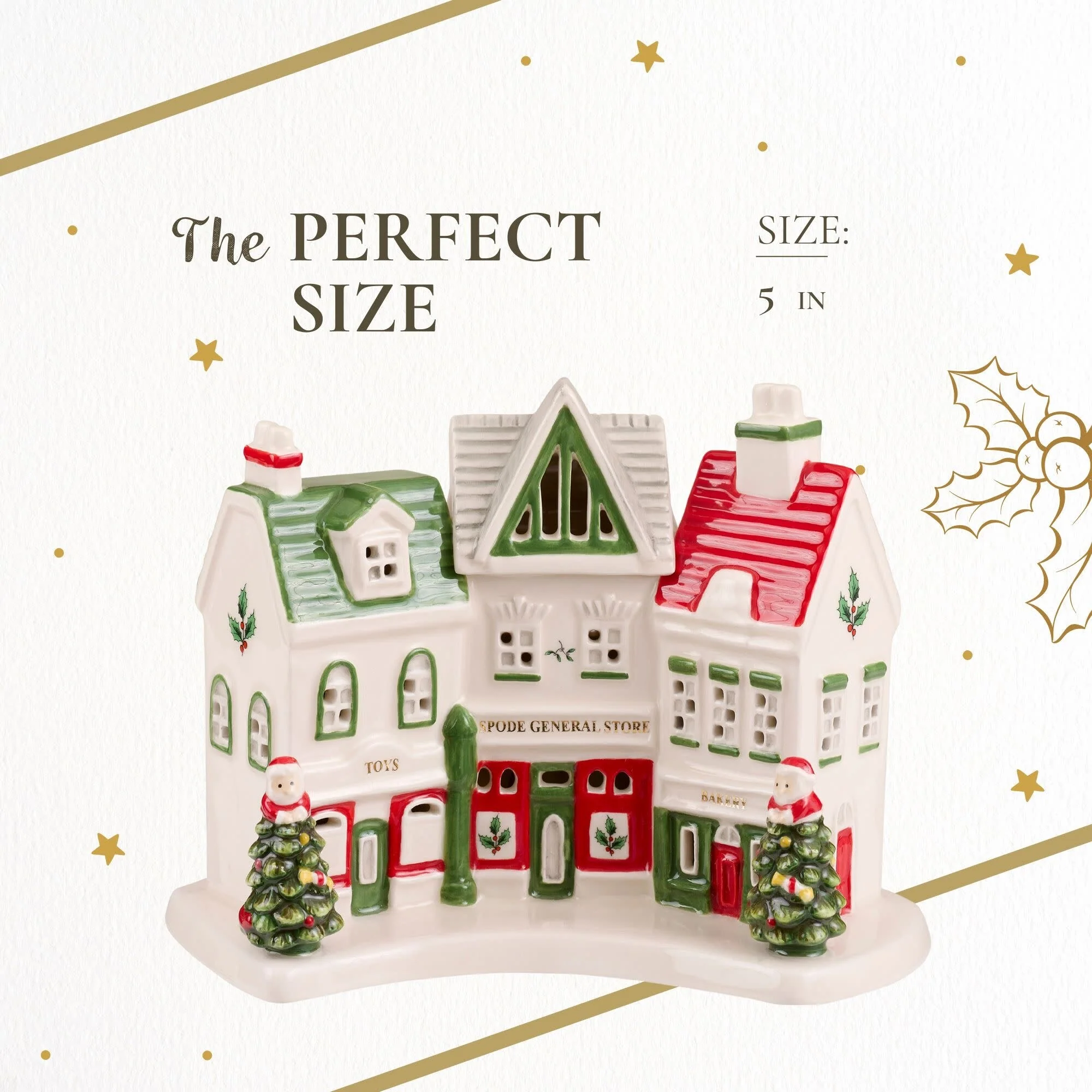 - Festive & Traditional: Featuring Spode's celebrated Christmas tree, holly leaves, and vibrant red and green accents, this village shoppes brings a joyful and classic touch to your Christmas celebrations.
