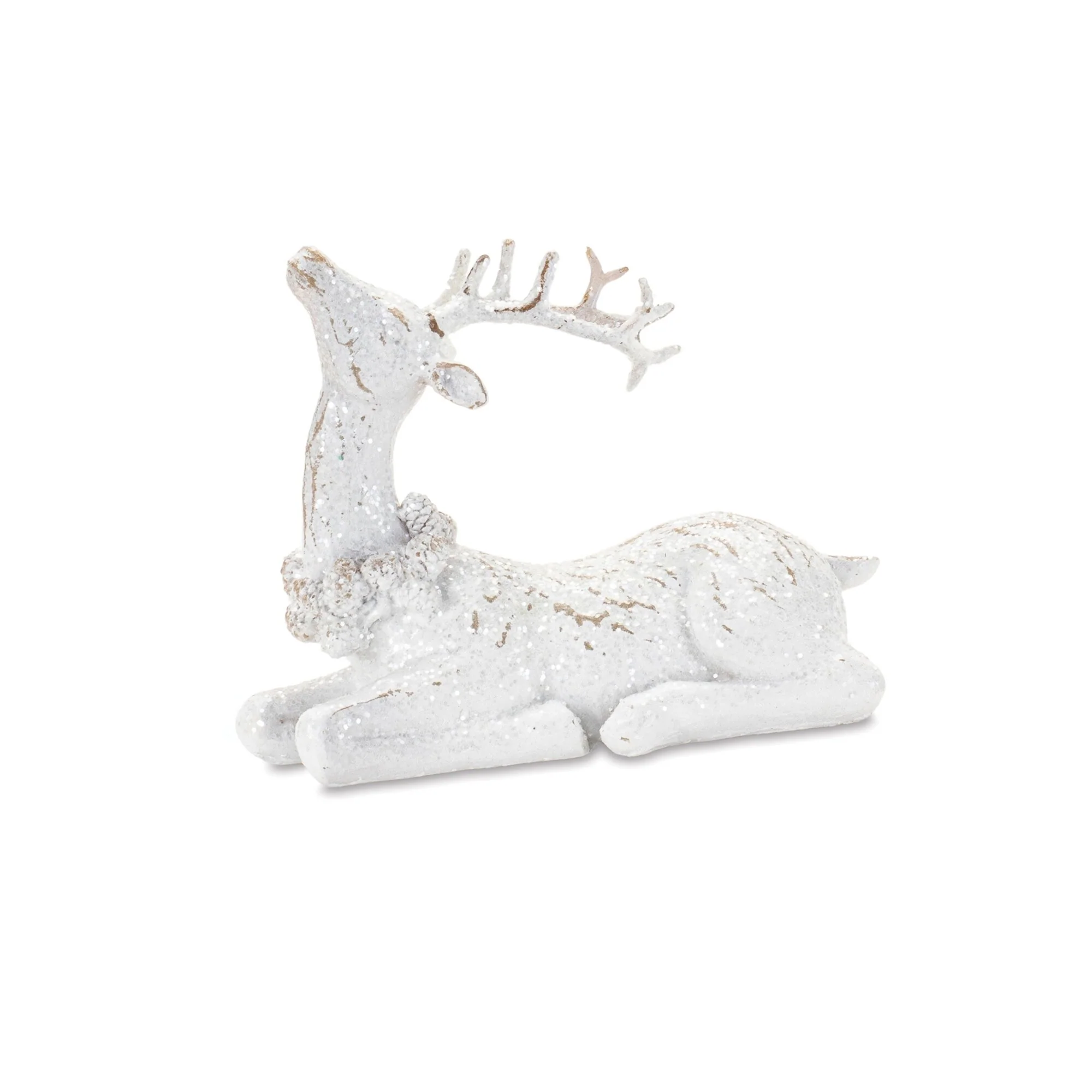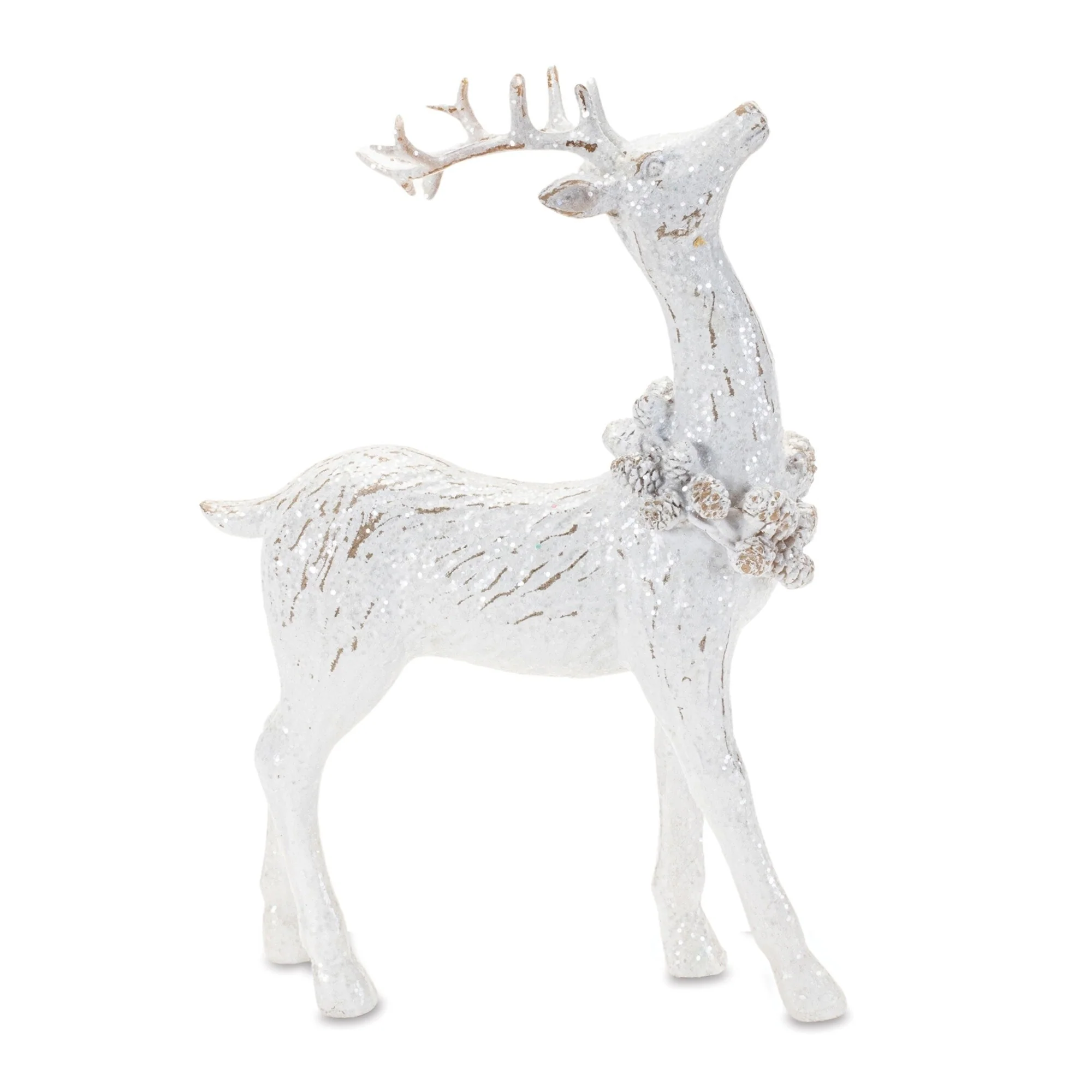 Enhance your holiday d茅cor with the winter reindeer figurine set, designed in wintry tones with a stylish whitewashed finish. Each rustic deer is adorned with a charming pinecone wreath, adding a natural, festive touch to your seasonal displays. The set includes two assorted designs for visual variety and balance. Perfect for mantels, shelves, or tabletops, these deer pair beautifully with Santa statues, holiday florals, or pine trees, bringing warmth, elegance, and woodland charm to your Christmas decor.