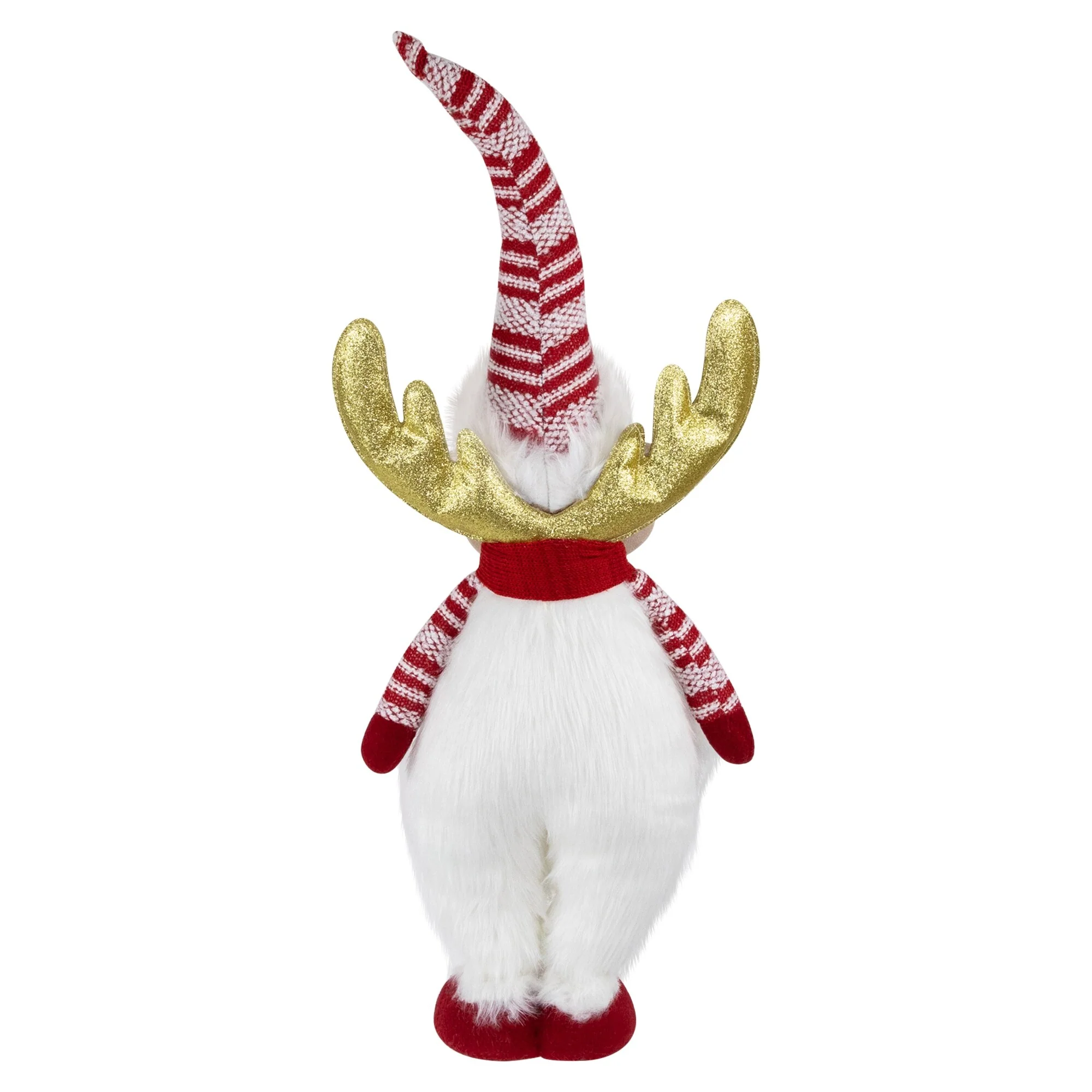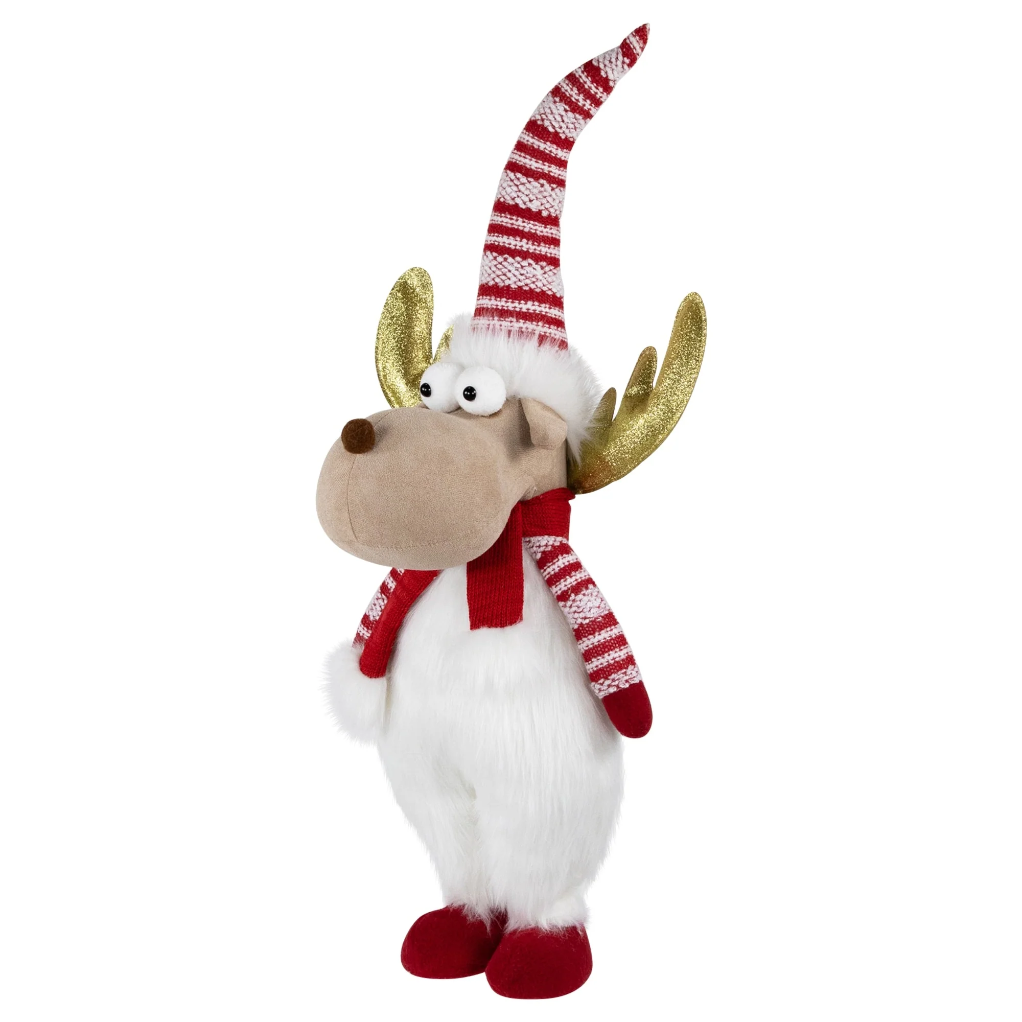 This Christmas moose will provide some comical relief for your winter decor with his bulging eyes and wide hips. Ready for the winter season, this moose stands tall with a fully covered white, faux-fur, plush body. A red and white striped pointy hat matches his arms. A solid red scarf matches his red boots. Embellished, gold glitter antlers add a touch of sparkle to your decor. Perfect for bringing a playful spirit to your home, this whimsical moose will add a festive touch to your celebrations.