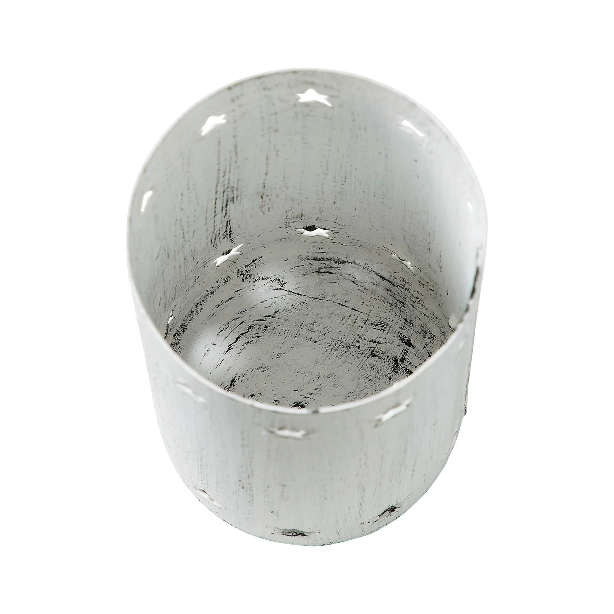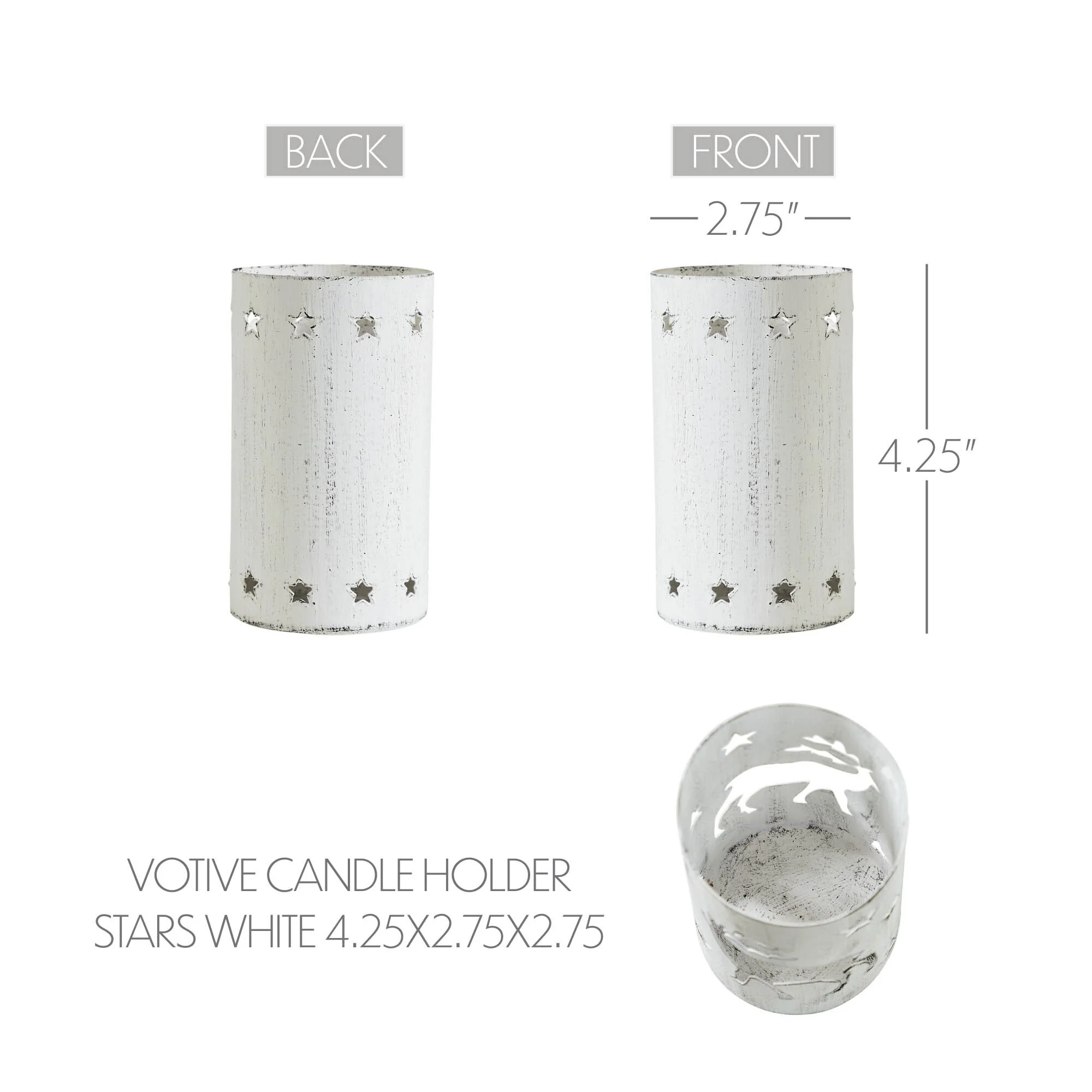 The VHC Brands Metal Votive Candle Holder brings a touch of rustic charm to any space with its intricate design and distressed appearance. Crafted from sturdy metal, this candle holder features cutout stars that cast mesmerizing patterns of light when a candle is placed inside. Measuring 4.25x2.75x2.75 inches, it's the perfect size for adorning kitchen dining tables, shelves, or countertops, adding a cozy ambiance to any room. With its white hue and primitive rustic style, this candle holder seamlessly complements farmhouse and country-inspired decor themes. Whether placed in the dining room, entryway, or living room, its understated elegance enhances the aesthetic appeal of any space. The distressed appearance lends an antique look, adding character and warmth to your home during gatherings or quiet evenings. For safety, it's essential to exercise caution when using this candle holder. Avoid touching or moving the holder while warm or when a candle is lit to prevent accidents. Always allow the holder to cool down before handling and ensure it's kept out of reach of children. Additionally, refrain from placing a lit candle near flammable objects to minimize fire hazards and maintain a cozy yet secure ambiance in your living spaces.
